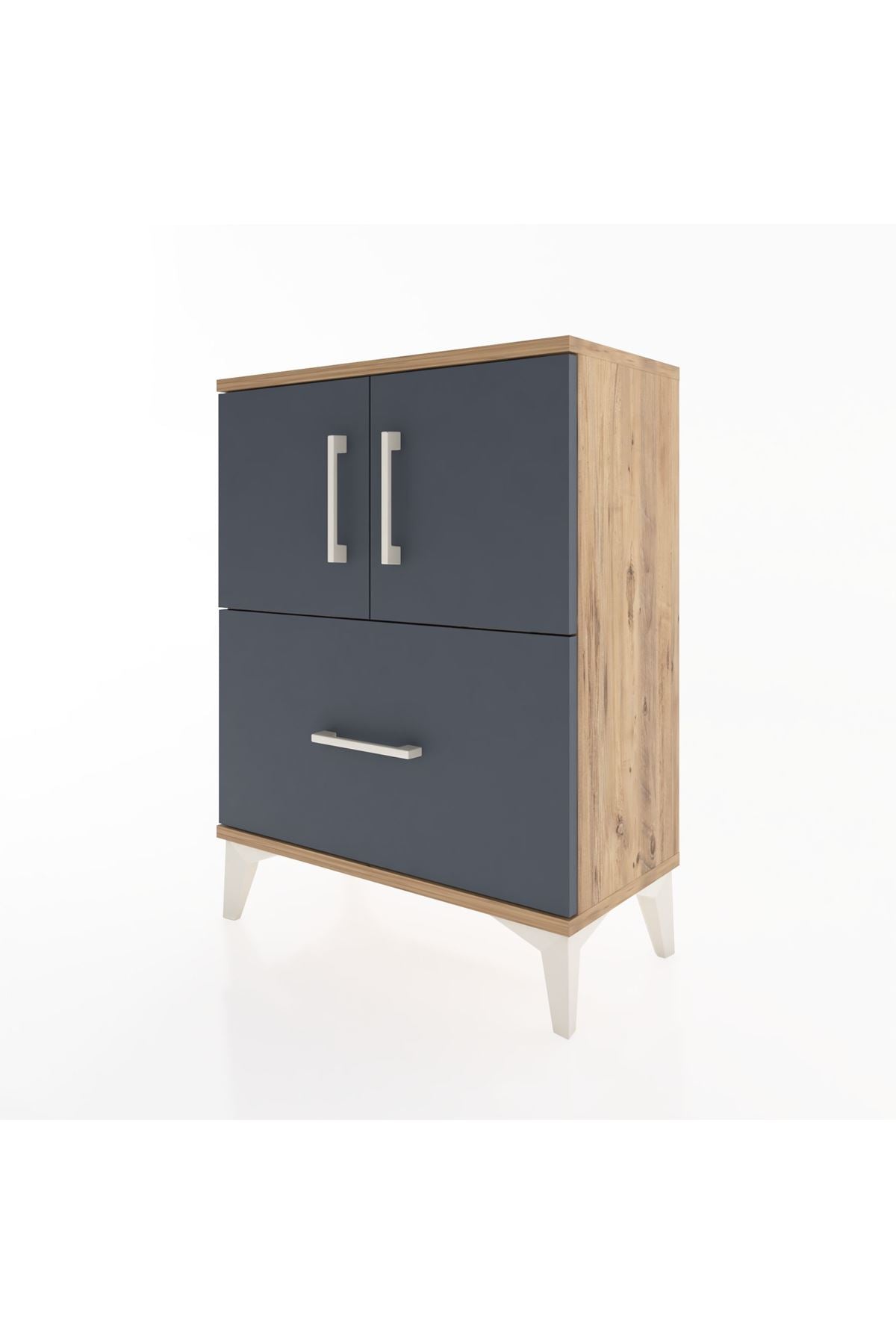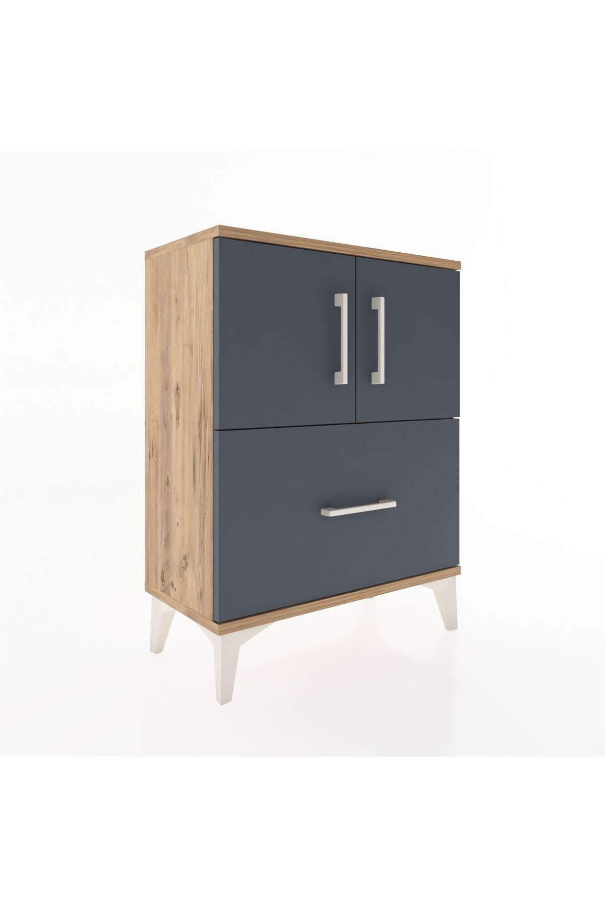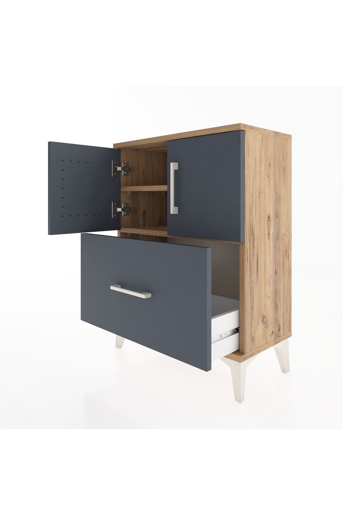 Bu komodin, evinizde düzen ve estetik sağlar. Antrasit renk seçeneği modern mekanlarla kolay uyum sağlarken üst yüzeydeki çam dokusu sıcaklık katar. Metal ayakları sağlamlık ve zemine dengeli oturma sunar, metal kulplar uzun ömürlü kullanım ve ergonomik çekmece/kapak açma kolaylığı sağlar. 1. sınıf suntalam gövde hafif ama dayanıklıdır, yüzey kolay temizlenir ve çizilmeye karşı dayanıklı kaplamaya sahiptir. Raflar ayarlanabilir, ihtiyaçlarınıza göre depolama hacmini optimize etmenize olanak tanır; çekmece sayısı konfigüre edilebilir, kullanım amacına göre ekstra çekmece ekleyebilir veya sadeleştirebilirsiniz.