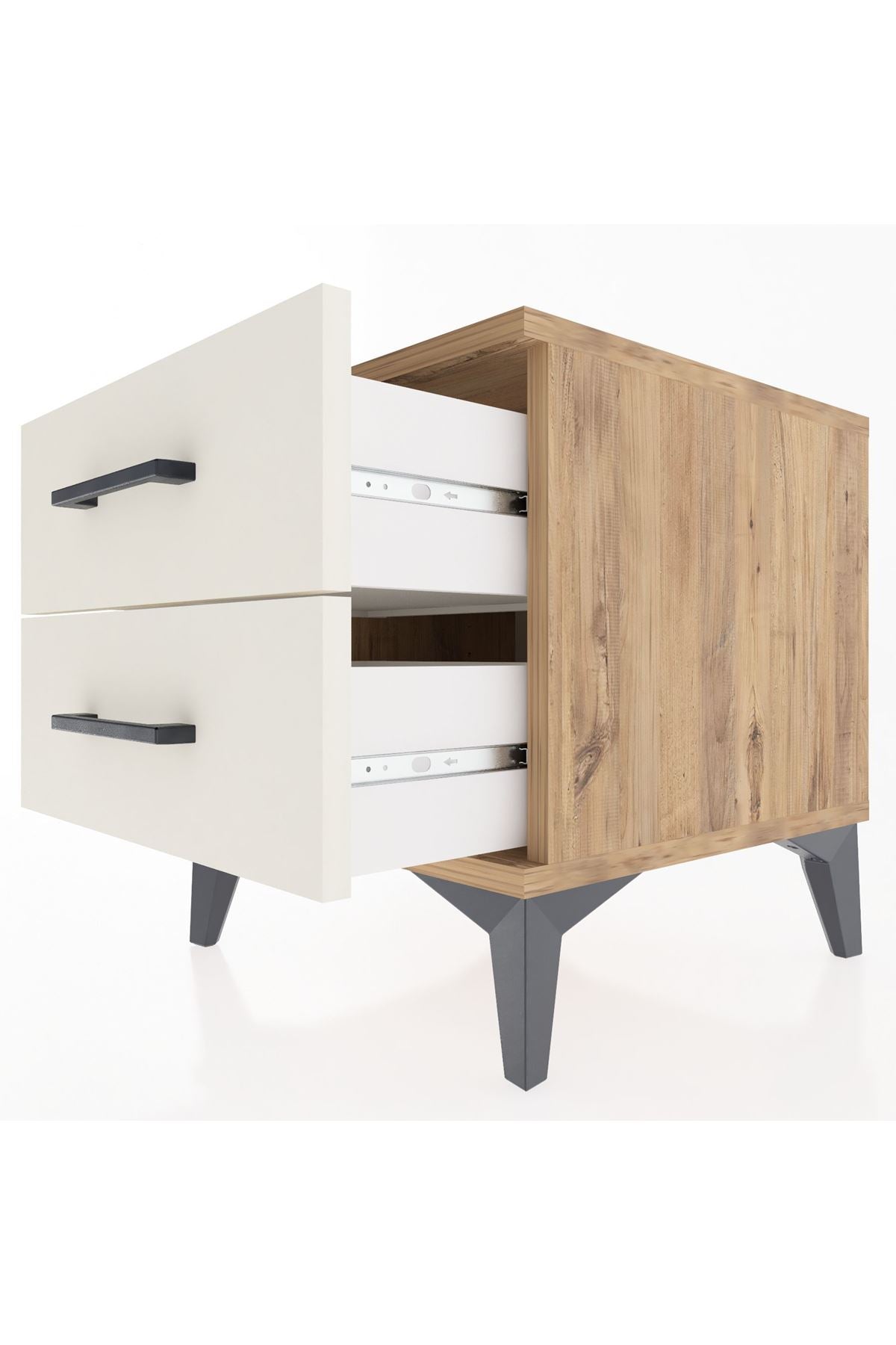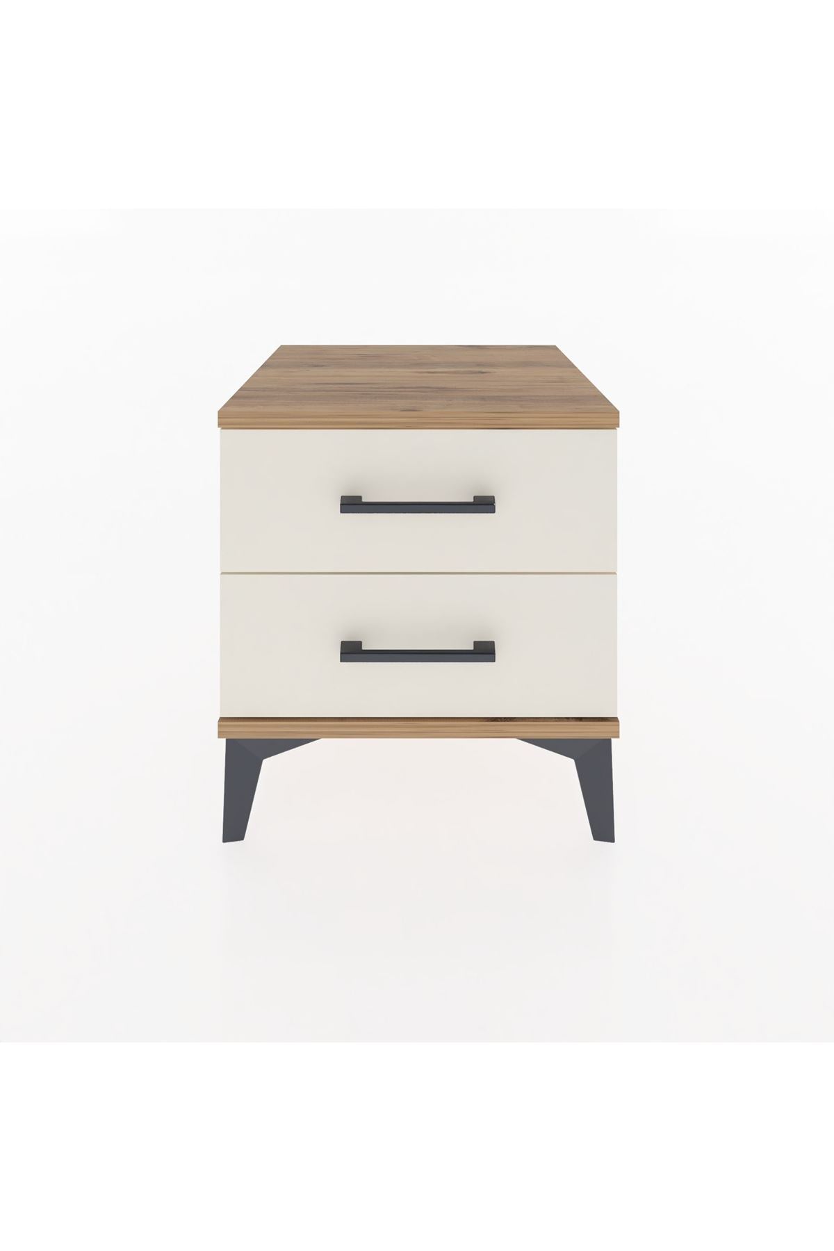 Yerden yüksek metal ayak yapısı sayesinde temizlik kolaylaşır ve alanın havası açılır. Geniş çekmeceler kıyafet, kitap, elektronik şarj aleti gibi eşyaları düzenli tutar; kayar mekanizmalar düzgün açılıp kapanma sağlar. Aytaşı ve Atlas Çam kombinasyonu hem modern hem de doğal dekorlarla uyum gösterir; antrasit detaylar kontrast oluşturarak güçlü bir duruş sağlar. Küçük eşyalar için bölümlendirici kullanımı uygundur; çekmece ve raf düzeni ile işlevsellik artar. Ürün hafif yapısı sayesinde taşınması ve konumlandırılması pratik olup, montaj sırasında verilen şarjlı vidalama seti kurulum süresini kısaltır.
