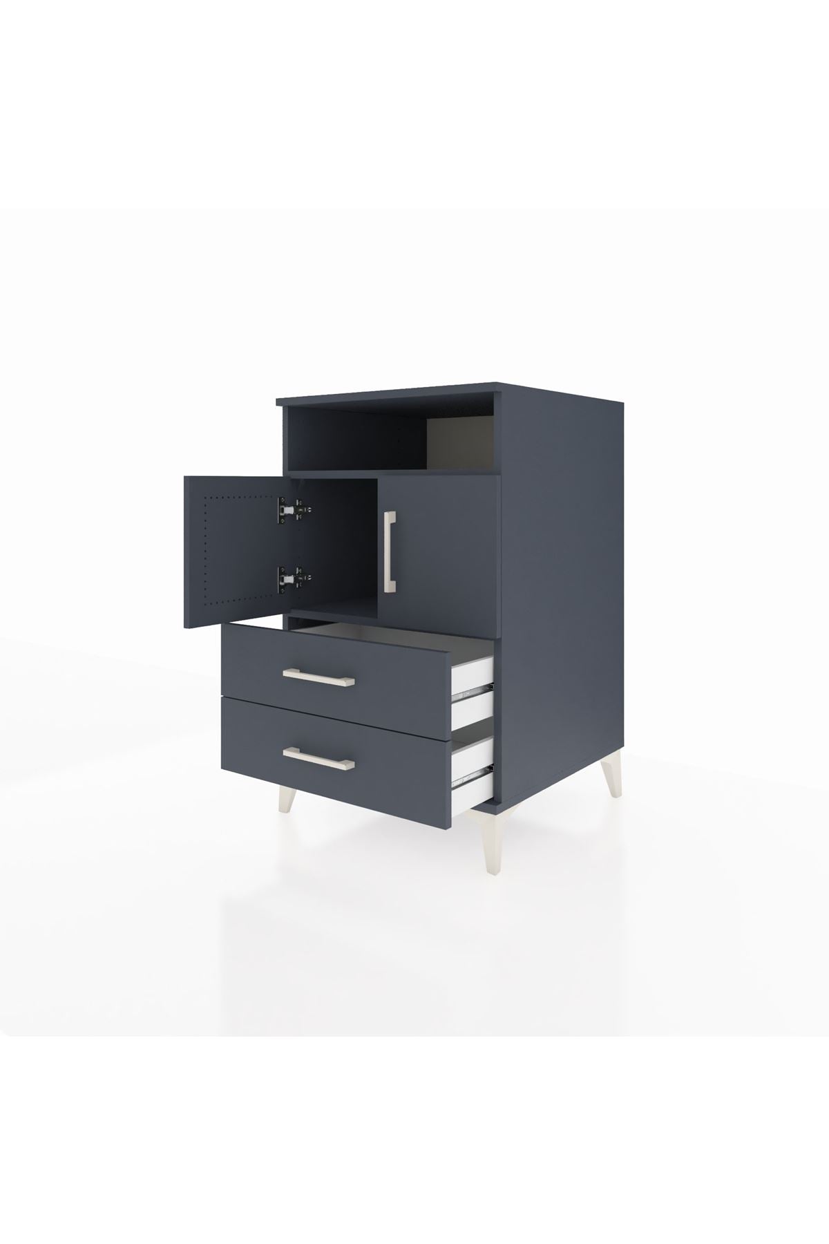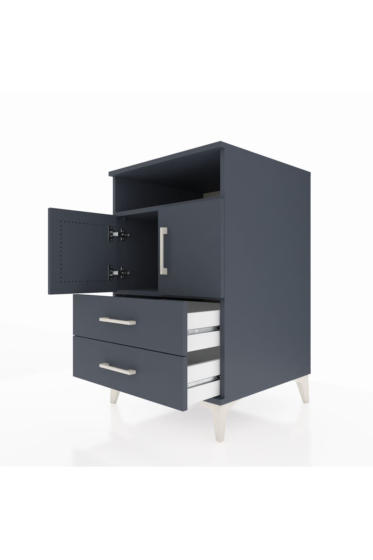 Bu komodin, evinizde modern bir düzen ve kullanım kolaylığı sağlar. Antrasit renk derin ve sofistike bir atmosfer sunar; yüzey dokusu temizlenmesi kolay, mat bir estetik sağlar. Metal ayakları sağlam ve dayanıklı, metal kulplar uzun ömürlü kullanım sunar. İç bölümdeki raflar ayarlanabilir, ihtiyaçlarınıza göre yüksekliği değiştirebilir; çekmece sayısı konfigüre edilebilir özelliği ile depolama alanını kişiselleştirebilirsiniz.