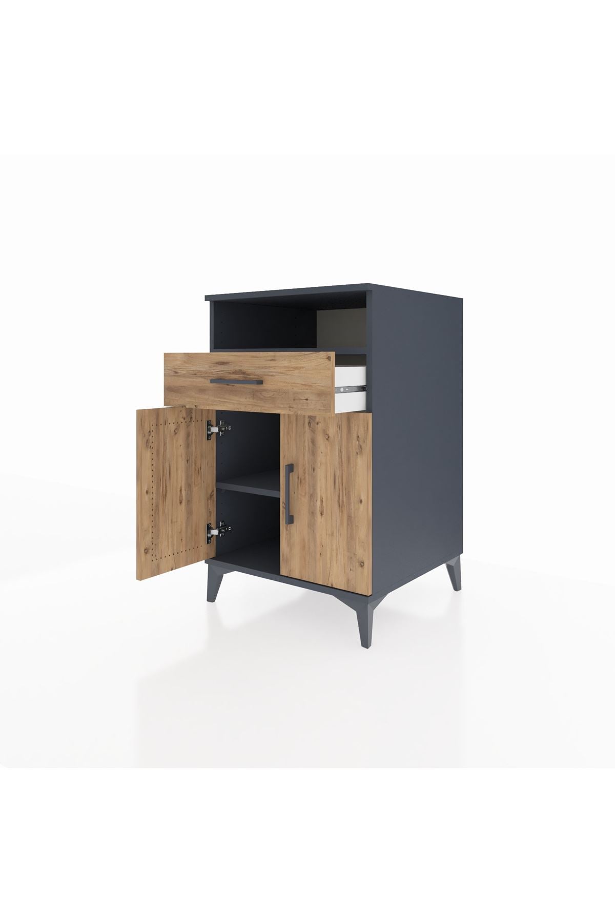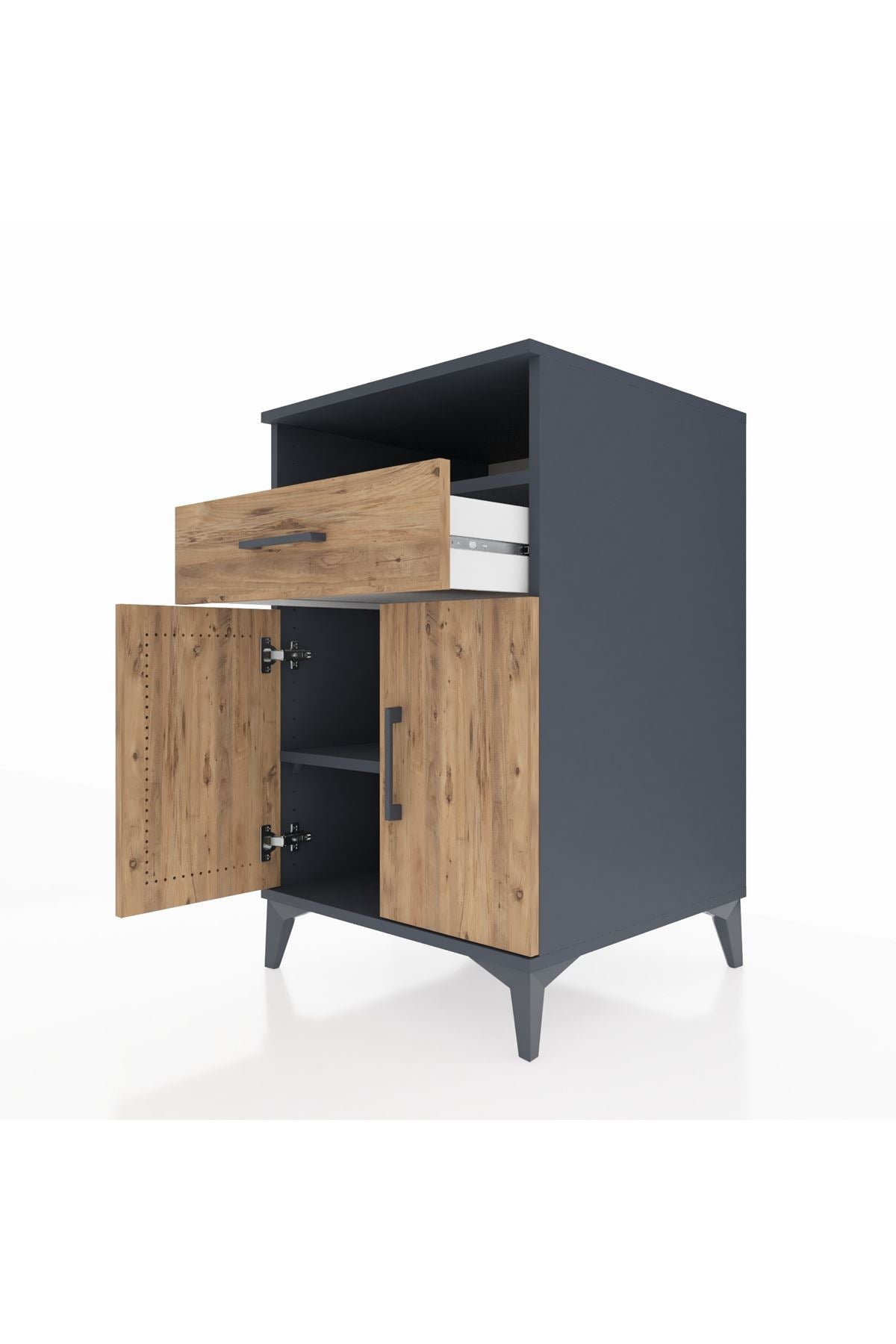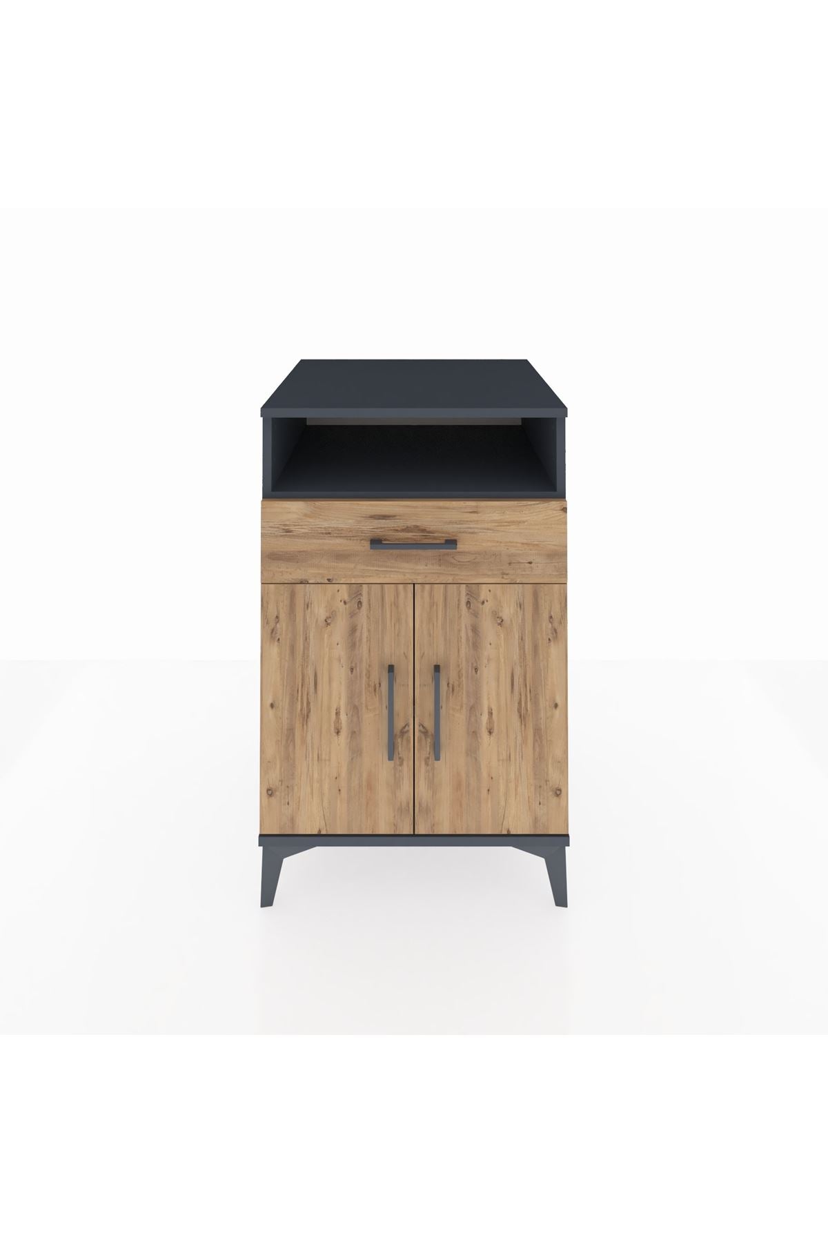 Bu komodin, evinizde düzen sağlarken estetik bir tamamlayıcı sunar. Antrasit-Çam kombinasyonu koyu gri antrasit yüzey ile doğal çam dokusunun sıcak kontrastını bir araya getirir. Metal ayakları yüksek taşıma gücü ve dengeli duruş sağlar, metal kulplar ise sık kullanımda bile uzun ömürlü kullanım sunar. Üst raftan alt dolaba kadar planlı depolama imkanı vererek küçük eşyalarınızı, kitaplarınızı veya mutfak/oturma malzemelerinizi düzenler.