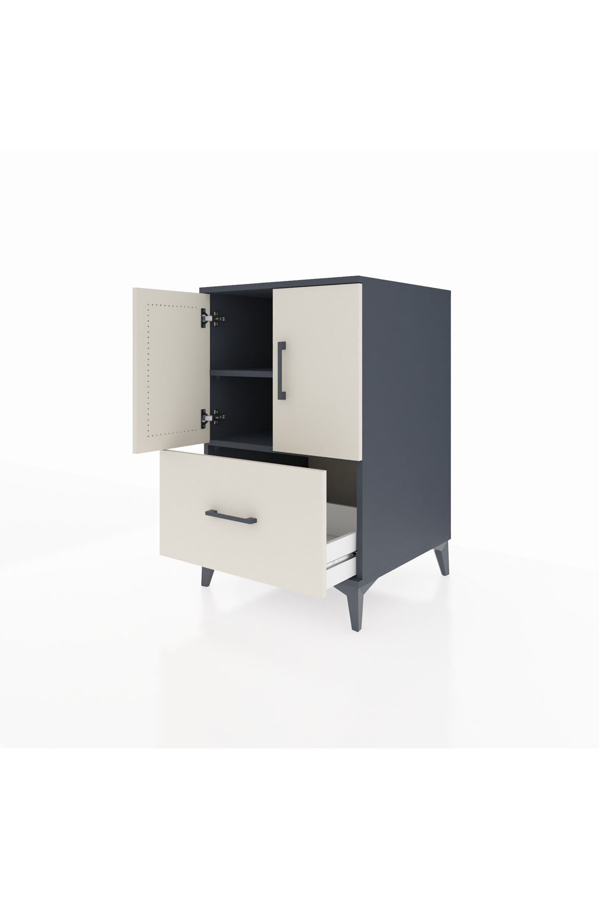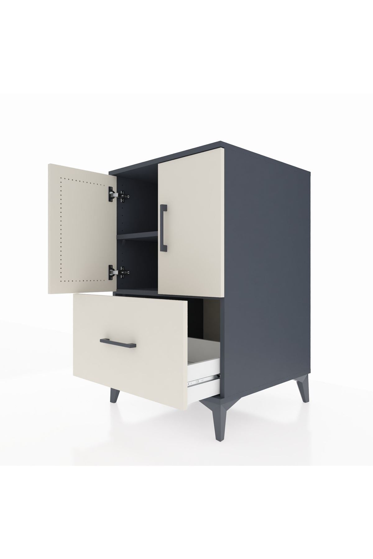 Komodin, yatak odasında gece ihtiyaçları için ideal bir yüzey ve saklama alanı sağlar. Geniş üst tabla kitap, lamba veya şarj istasyonu için yeterli alan sunar. Alt çekmece giysi, battaniye veya yatak odası aksesuarlarını düzenlerken kapaklı bölmeler gizli depolama sağlar. Ayarlanabilir raflar sayesinde boyutları farklı eşyalar için optimize edilebilir. Metal ayaklar zeminden yükselttiği için temizlik kolaylaşır ve nemden kaynaklı deformasyon riski azalır.