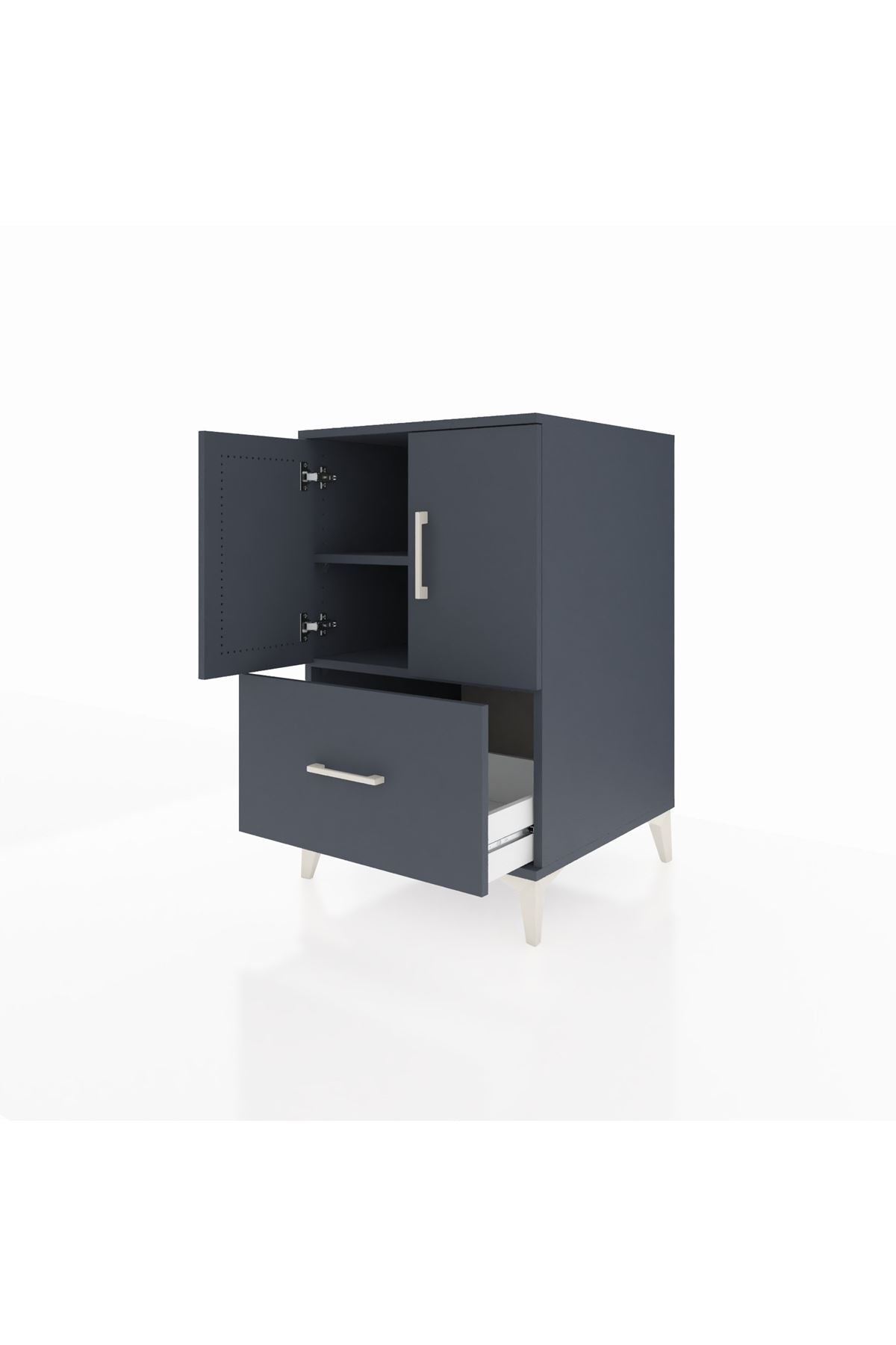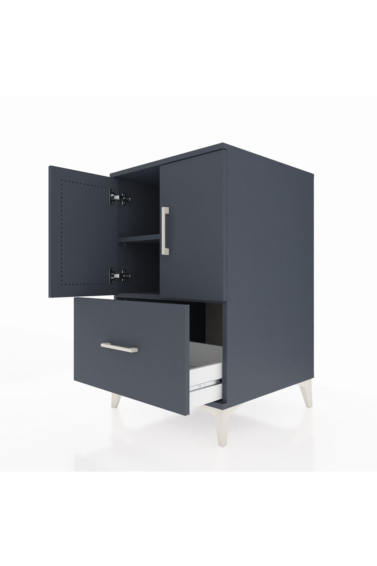 Geniş çekmece iç hacmi yatak odasında tekstil ve kişisel eşyalar için ideal saklama sunar. Ayarlanabilir raflar sayesinde yüksek kitap, kutu veya oyuncak gibi farklı ebatlardaki eşyaları kolayca organize edebilirsiniz. Metal ayaklı konstrüksiyon temizlik kolaylığı sağlar; komodinin altından süpürge veya paspas geçirmek pratikleşir. Dayanıklı malzeme ve kaliteli işçilik uzun vadede maliyet avantajı sağlar. Çekmece ve kapak kombinasyonu hem açık hem kapalı depolama ihtiyacını karşılayarak odada düzeni korur.