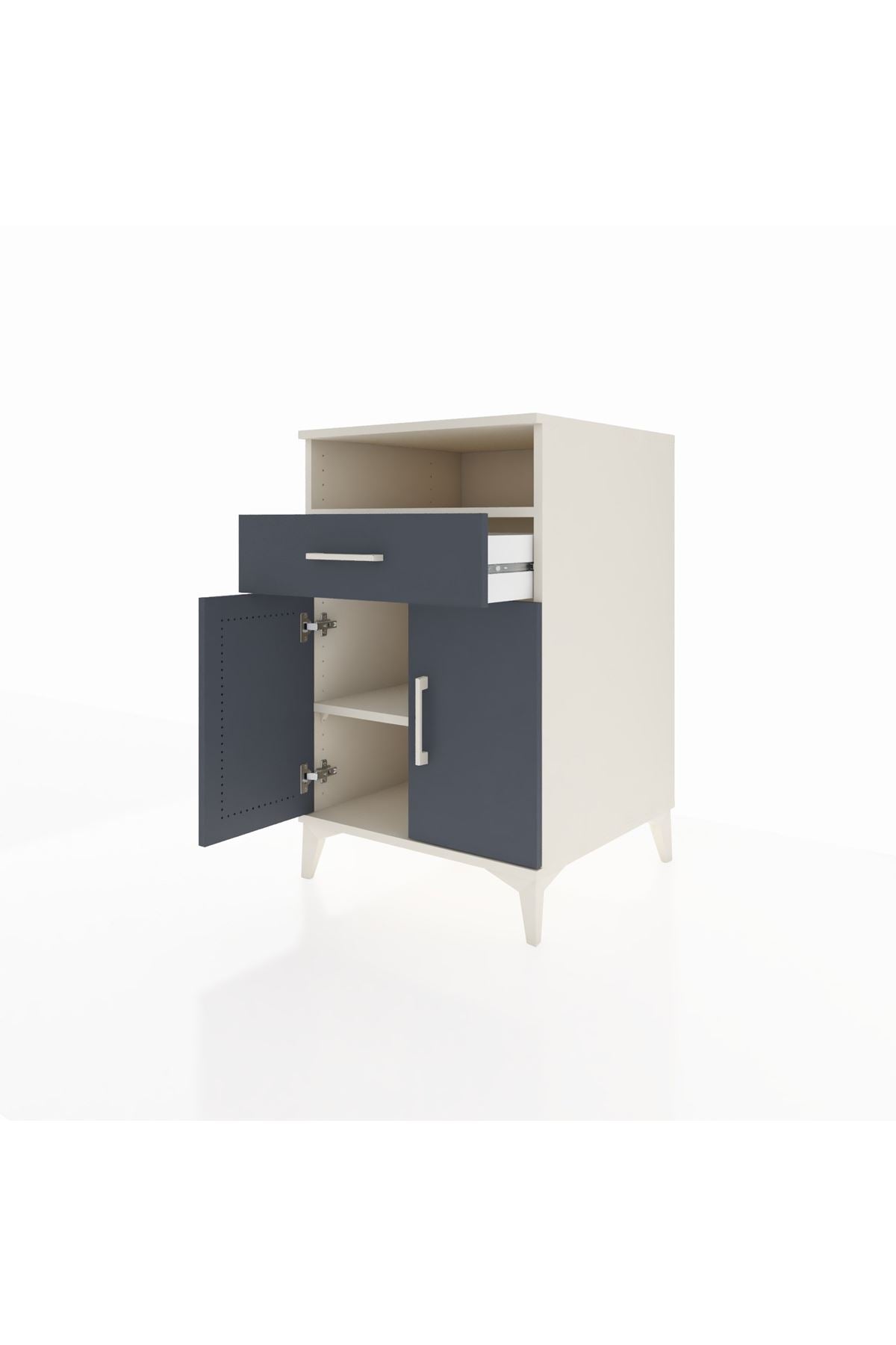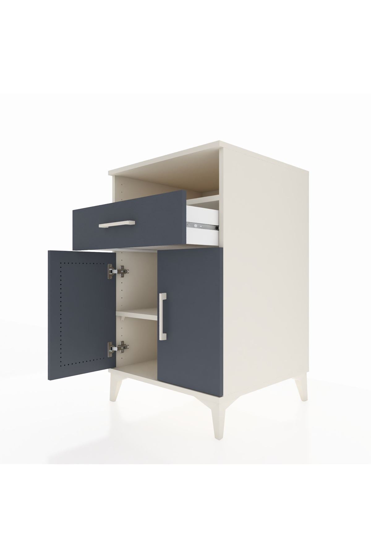 Komodin, yatak odasında gece gereksinimlerinizi elinizin altında tutar; üst raf gece lambası, telefon ve kitap için ideal bir yüzey sunar. Geniş iç hacmi ile kıyafet, aksesuar veya evrak depolamaya uygundur. Ayarlanabilir raflar sayesinde yüksek ve düşük eşyalar için esnek saklama çözümleri sağlanır. Metal donanım kombinasyonu hem sağlamlık hem de uzun vadeli kullanım güvencesi verir. Komodin, dar antrelerde veya salon köşelerinde ekstra saklama alanı olarak da işlev görür.