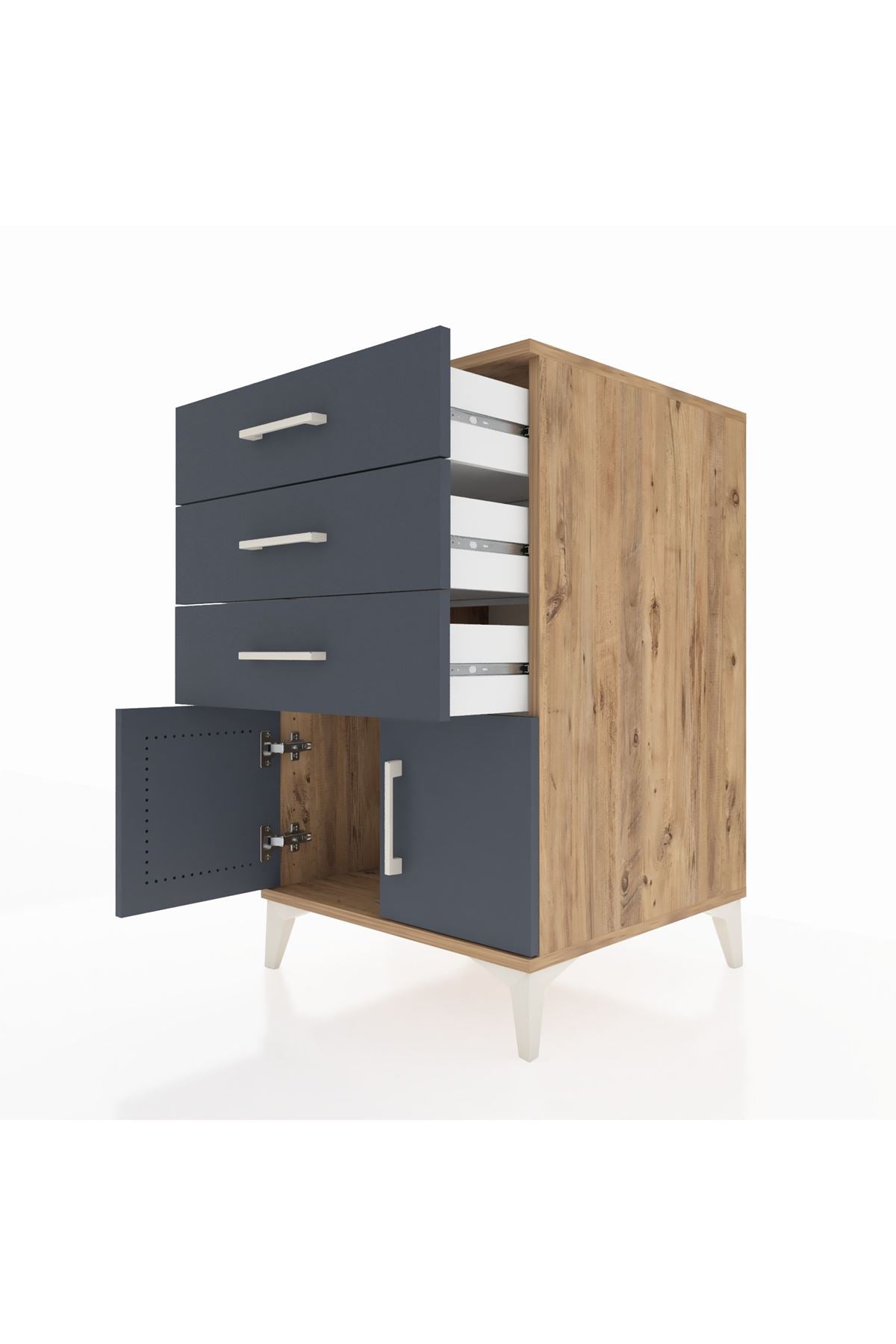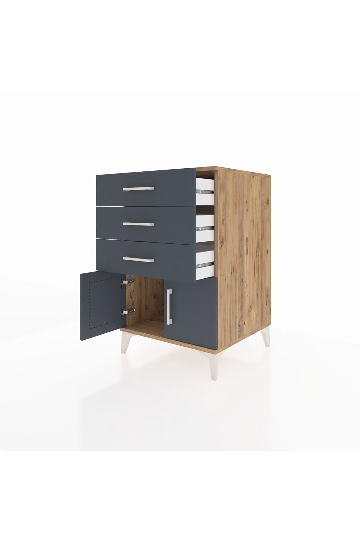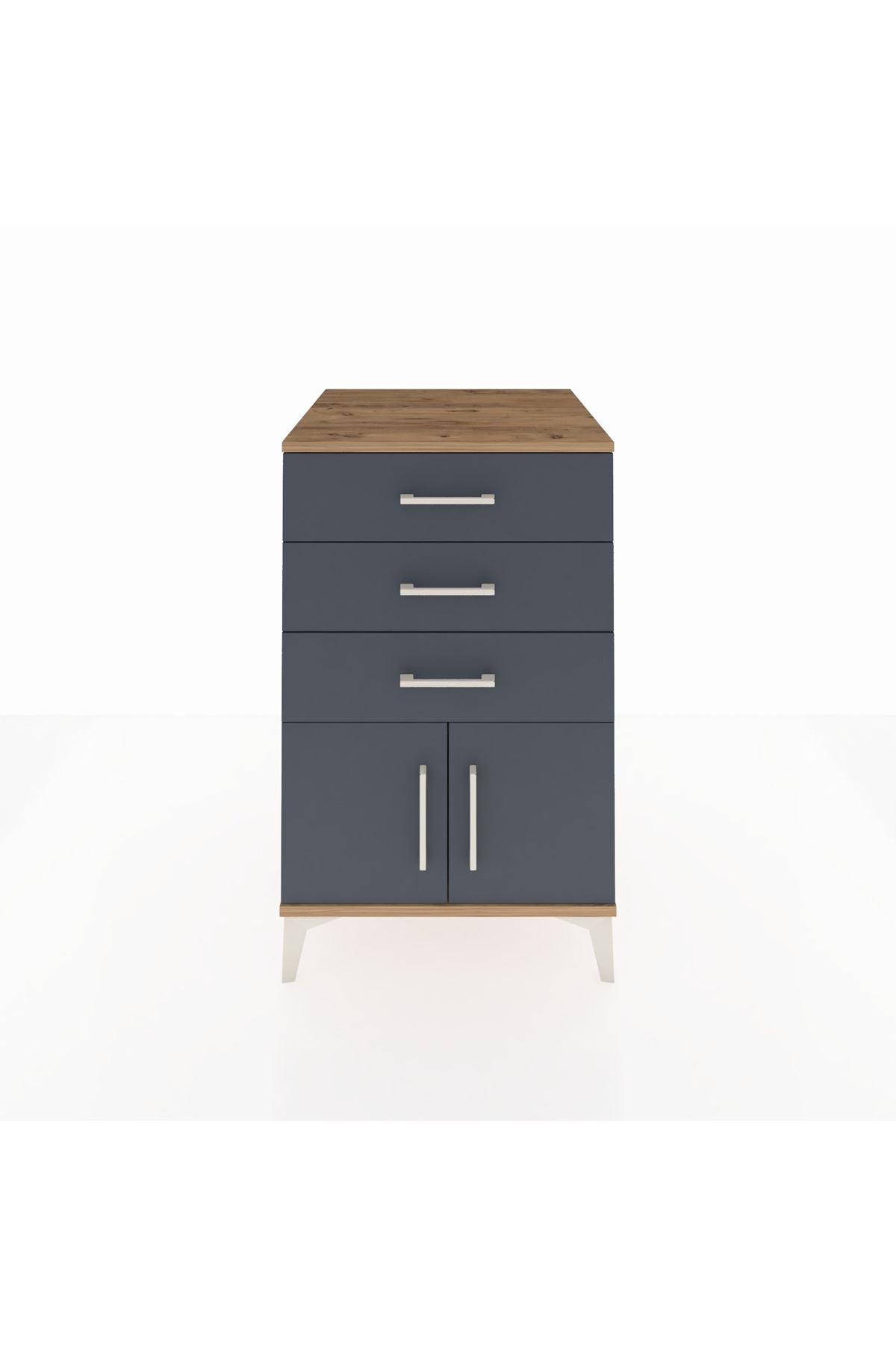 Kompakt ama geniş iç hacmi ile yatak odasında veya oturma alanında sık kullanılan eşyaları düzenler. Üst yüzeyi gece lambası, kitap veya dekoratif objeler için ideal bir yer sunar. Ayarlanabilir raflar sayesinde farklı yükseklikteki eşyalar rahatça depolanır. Çekmece sayısı konfigüre edilebilir özelliğiyle kullanım alışkanlıklarınıza göre 2, 3 veya daha fazla çekmece seçeneğiyle sipariş verilebilir. Metal ayaklar zeminden yükselttiği için temizlik kolaylaşır ve nemden korunma sağlanır.