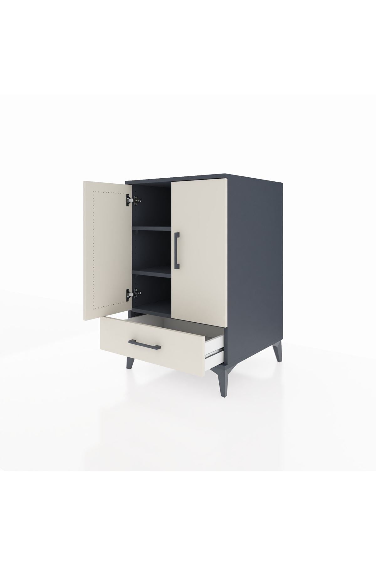 Komodin, gece lambası, kitap, telefon ve kişisel eşyalar için ideal bir yüzey sağlar. İç bölümdeki üç adet rafın ayarlanabilir olması sayesinde farklı boyutlardaki eşyalar kolayca yerleştirilebilir; ihtiyaç halinde raf yüksekliği değiştirilerek depolama kapasitesi optimize edilir. Tek çekmeceli tasarım, küçük tekstil ürünleri veya değerli eşyalar için düzenli saklama alanı sunar. Çekmece sayısı konfigüre edilebilir olması, kullanım amacına göre ek çekmece ekleme veya azaltma imkanı verir. Metal ayaklar sayesinde temizlik kolaylaşır, mobilya zeminden yükselerek hijyen sağlar.