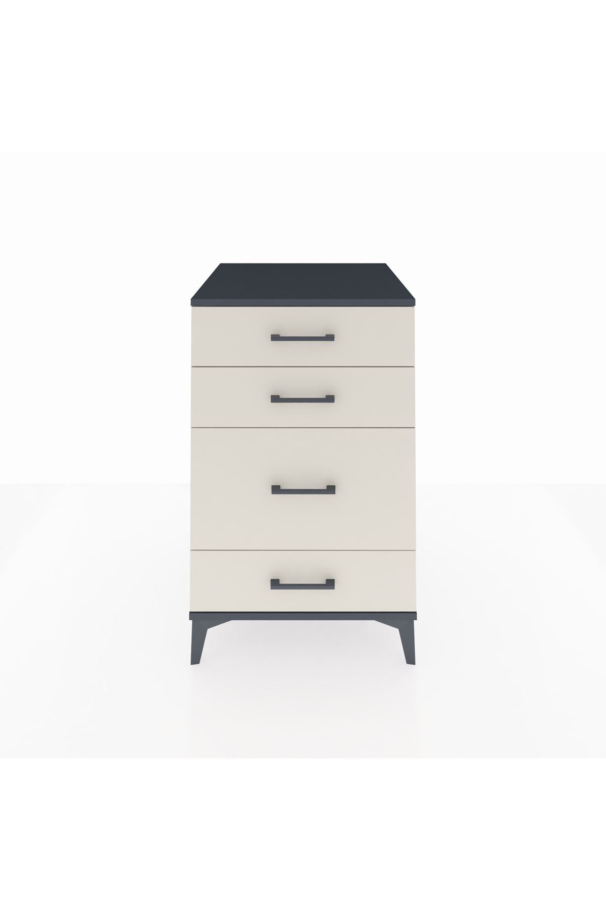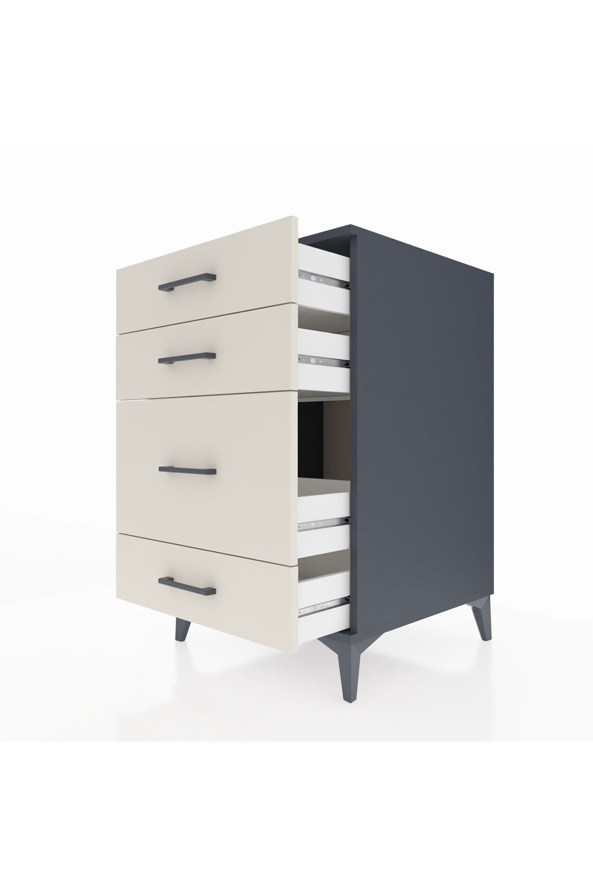 Kompakt ölçüleriyle yatak başında veya dar alanlarda konforlu kullanım sağlar. Dört çekmecesi; kıyafet, bakım ürünleri, elektronik aksesuarlar ve kişisel eşyaları ayrı bölümlerde tutmanıza imkan verir. Üst yüzey kitap, gece lambası veya telefon şarj istasyonu olarak kullanılabilir. Suntalam yüzey kolay temizlenir ve lekelere karşı dirençlidir. Raf sistemi ayarlanabilir olduğundan depolama kapasitesi ihtiyaca göre optimize edilebilir. Çekmece sayısı konfigüre edilebilir özelliği sayesinde farklı kullanım gereksinimlerine göre kişiselleştirme yapılabilir.