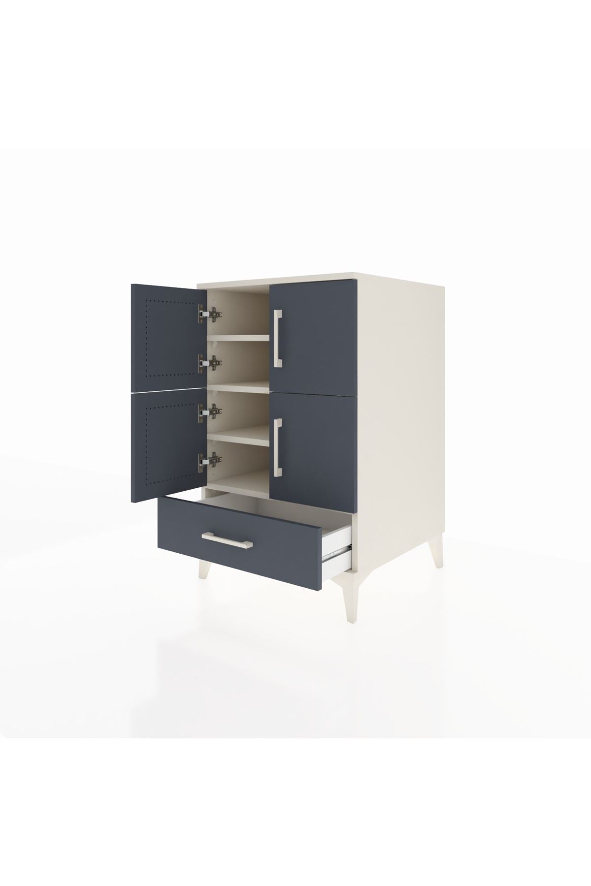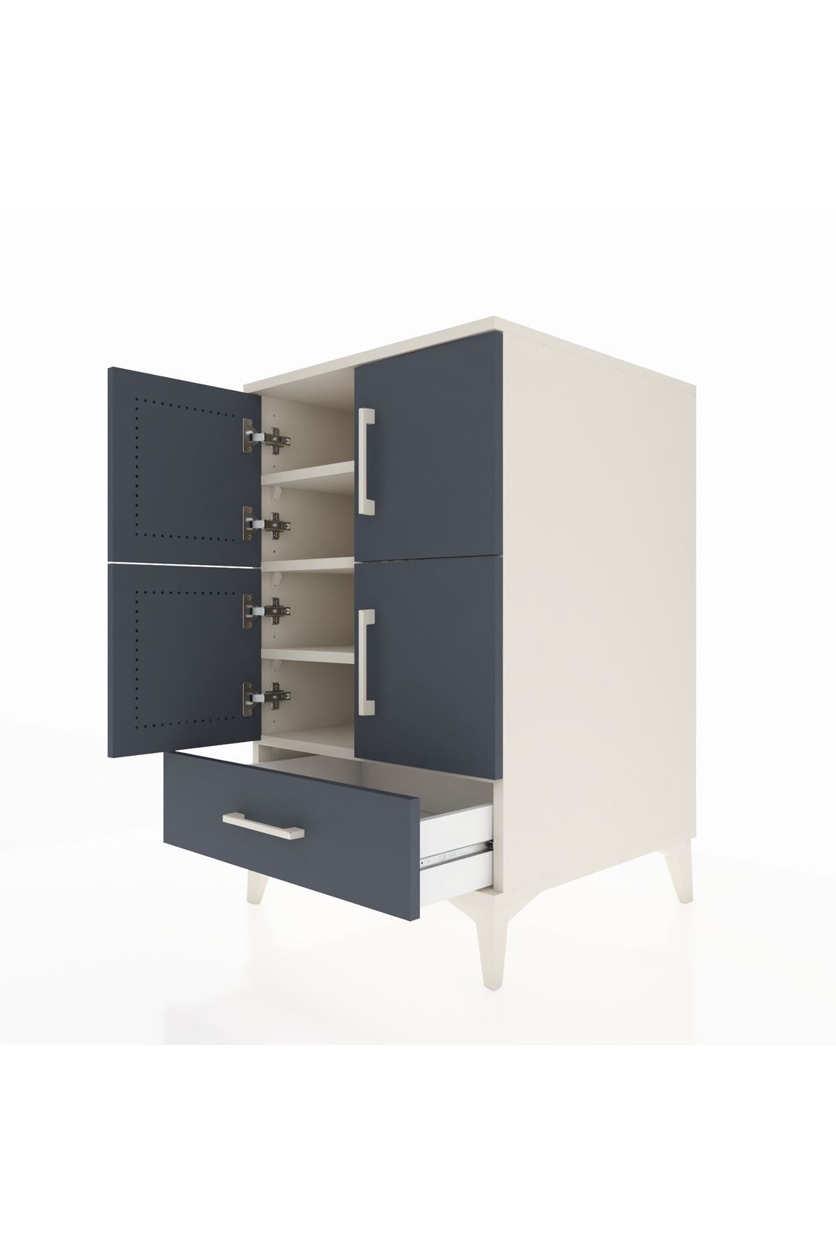 Geniş iç hacimli raflar ve kapaklı bölmelerle dağınıklığı azaltır, sık kullanılan eşyaları düzenli şekilde saklamayı kolaylaştırır. Ayarlanabilir raflar sayesinde farklı yüksekliklerde kitap, kutu veya dekoratif ürün saklanabilir. Tek çekmece ofis malzemeleri, şarj kabloları veya kişisel eşyalar için hızlı erişimli alan sağlar; çekmece sayısı konfigüre edilebilir yapısıyla ihtiyaçlarınıza göre uyarlanabilir. Metal donanımlar komodinin karekterini güçlendirir ve taşıma/kurulum sırasında sağlamlık sağlar.