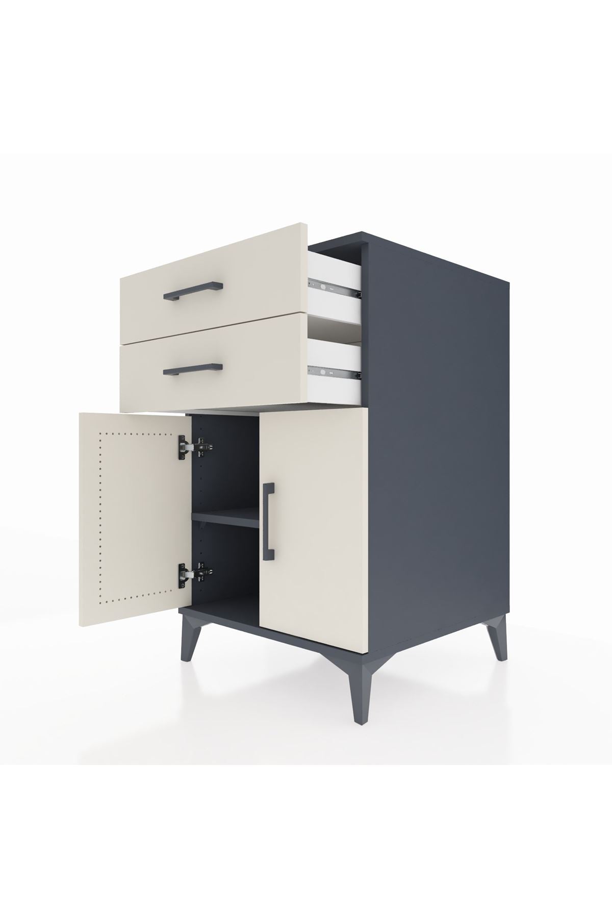 Bu komodin, modern ve dayanıklı yapısıyla yaşam alanlarında düzen ve estetiği bir araya getirir. Antrasit-Aytaşı renk kombinasyonu, nötr ve şık bir görünüm sunar; üst yüzey koyu antrasit tonunda, gövde ise aytaşı tonunda tasarlanmıştır. Metal ayakları sağlam zemin tutuşu ve uzun ömürlü kullanım sağlarken, metal kulplar günlük açma-kapama işlevleri için dayanıklılık sunar. İç bölümde tek raf ayarlanabilir yapıda olduğundan farklı yüksekliklerde depolama ihtiyaçlarına hızlıca uyum sağlar. İki çekmece ve iki kapaklı alt bölüm ile hem küçük eşyalar hem de daha hacimli malzemeler düzenli şekilde saklanabilir. Çekmece sayısı konfigüre edilebilir özelliği sayesinde kullanım amacınıza göre farklı çekmece düzenleri tercih edilebilir.