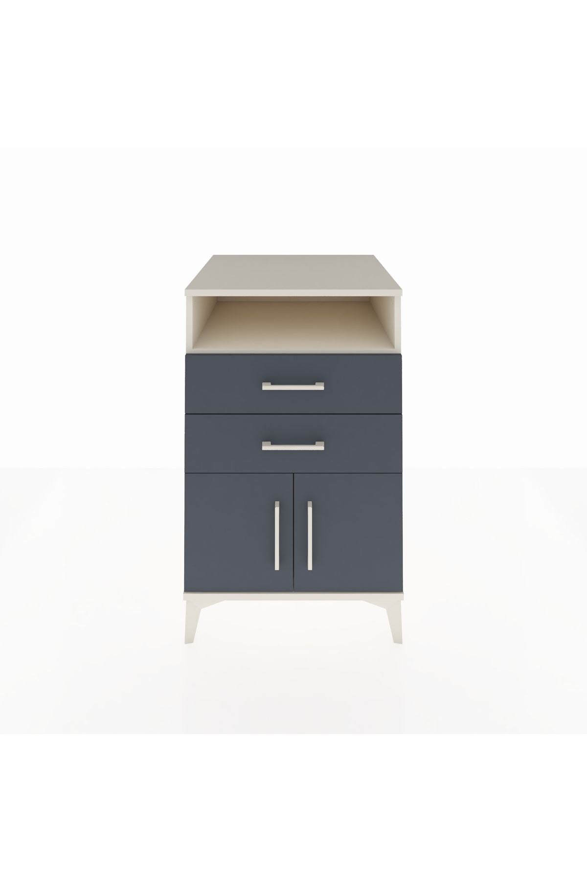Çalışma alanında küçük ofis düzeni sağlayan komodin, yazıcı, harici sabit disk veya adaptörleri saklamak için ideal bir yardımcıdır. Üst raf monitör altı düzenleyici olarak veya sık kullanılan dokümanlar için ayrılabilir. Çekmeceler kablo, belgeler ve ofis malzemelerini gizli tutarken, kapaklı bölüm daha büyük ekipmanlar için güvenli bir alan sunar. Metal kulplar sık kullanımda dayanıklılığı garanti eder.