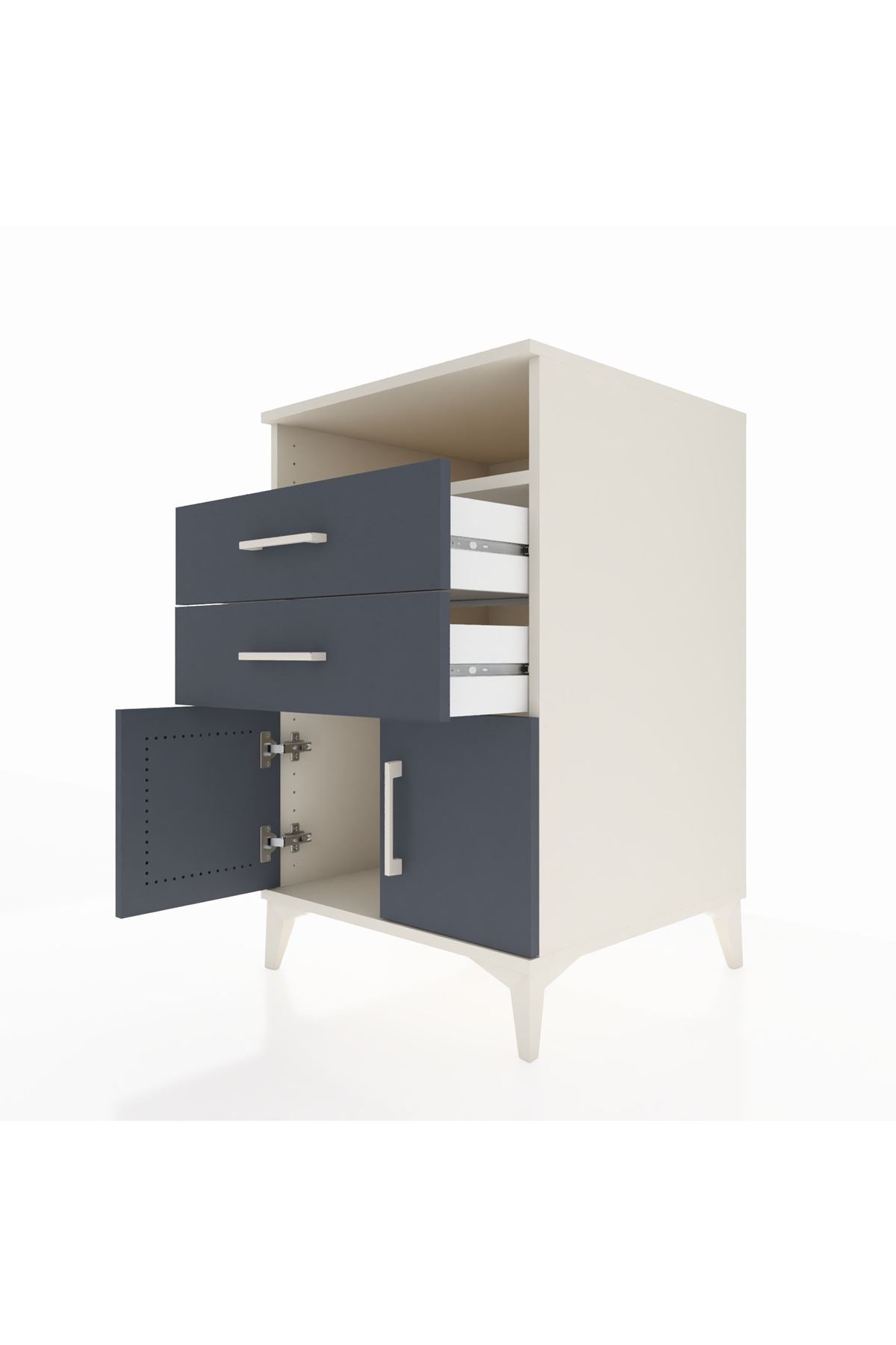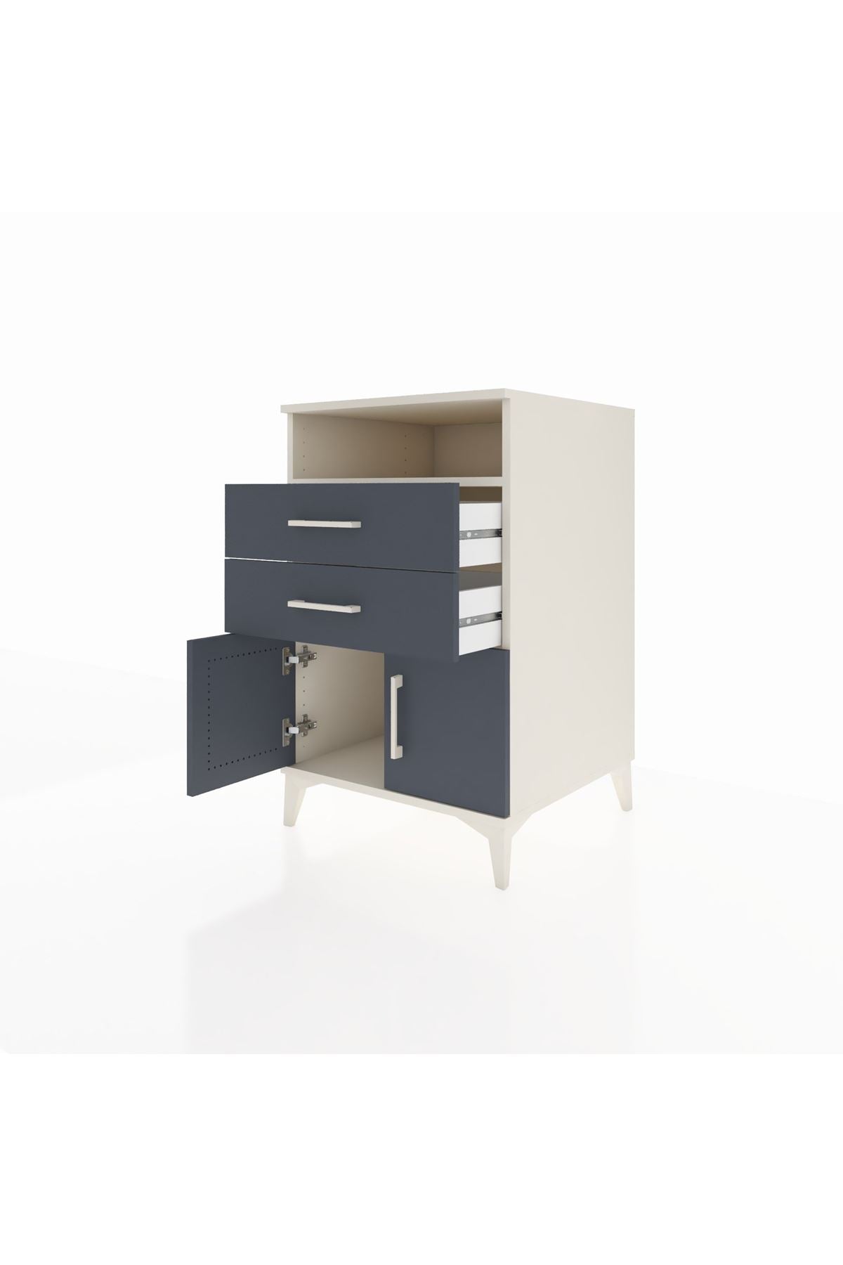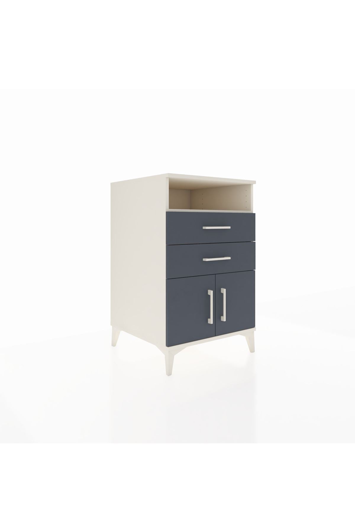 Bu komodin, evinizde düzen ve estetik birlikteliği sağlar. Aytaşı, Antrasit ve Atlas Çam renk seçenekleriyle farklı dekorasyon stillerine uyum sağlar. Metal ayakları sağlam ve dayanıklı, metal kulplar uzun ömürlü kullanım sunar. Üst raf, günlük erişim gerektiren eşyalar için açık saklama alanı sunarken, alt kısımda yer alan çekmeceler ve kapaklı bölüm eşyalarınızı düzenli tutmanıza yardımcı olur. 1. sınıf suntalam yüzeyler temizlenmesi kolay, darbeye dayanıklı bir kullanım sağlar.
