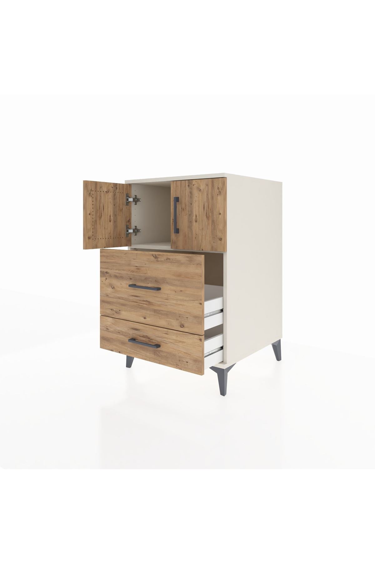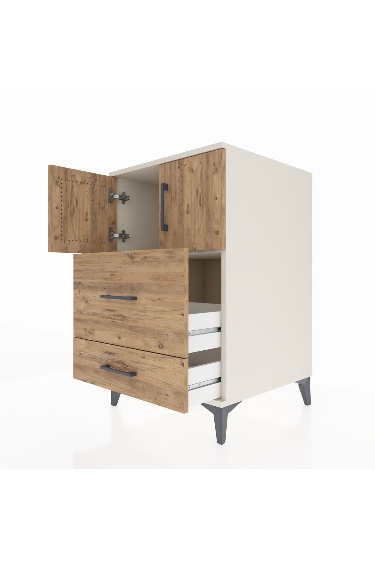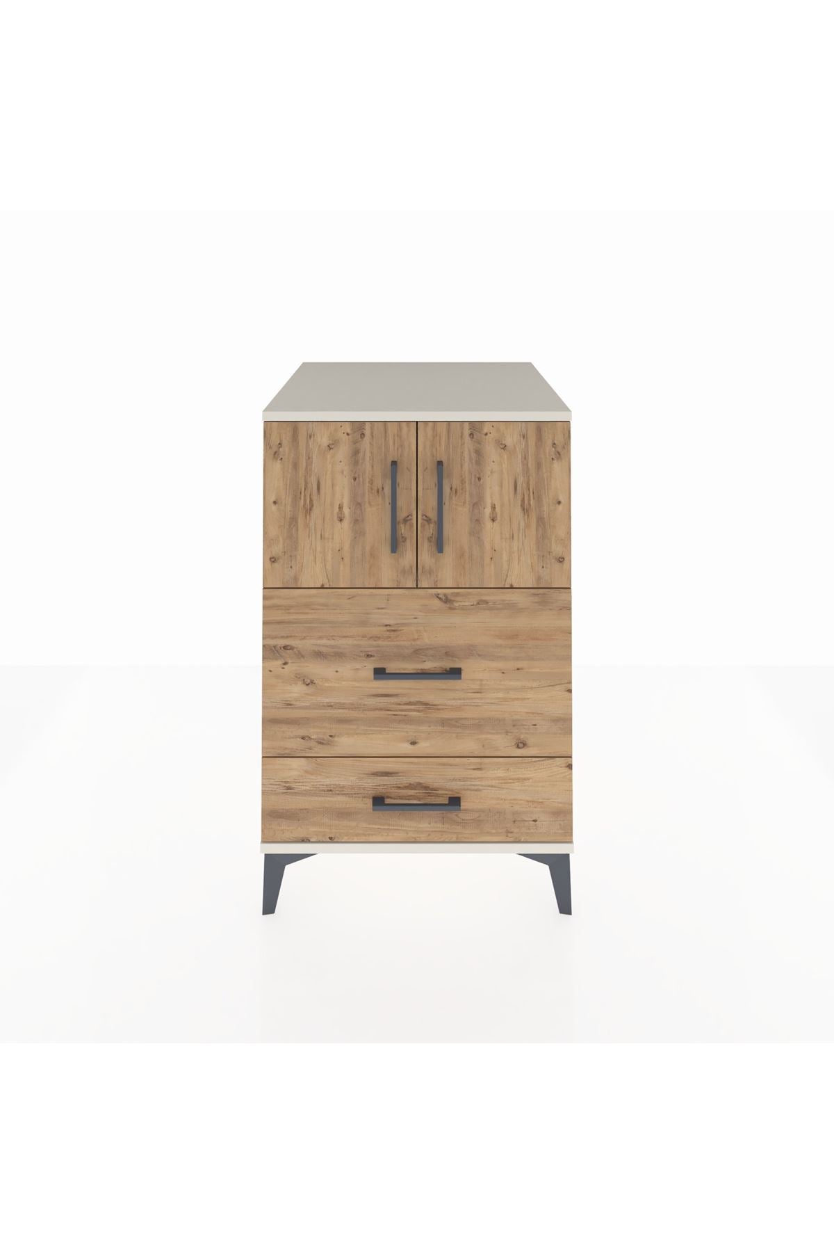 Bu komodin, evinizde düzen ve fonksiyonellik sağlar. Aytaşı-Çam kombinasyonu modern beyaz tonla doğal ahşap dokusunu bir araya getirerek sade ve sıcak bir atmosfer sunar. Metal ayakları sağlam zemin oturumu ve uzun ömürlü kullanım sağlarken, metal kulplar her gün kullanımda konfor ve dayanıklılık sağlar. Üst bölümde yer alan tek raf ayarlanabilir yükseklik seçeneği ile farklı ebatlardaki eşyaları düzenlemeye imkan verir; iki çekmece ve iki kapaklı alan, kişisel eşyalarınızı, tekstil ürünlerinizi ve günlük gereçlerinizi düzenli bir şekilde saklamanıza yardımcı olur. Çekmece sayısı konfigüre edilebilir; ihtiyaçlarınıza göre çekmece adedini değiştirebilirsiniz.