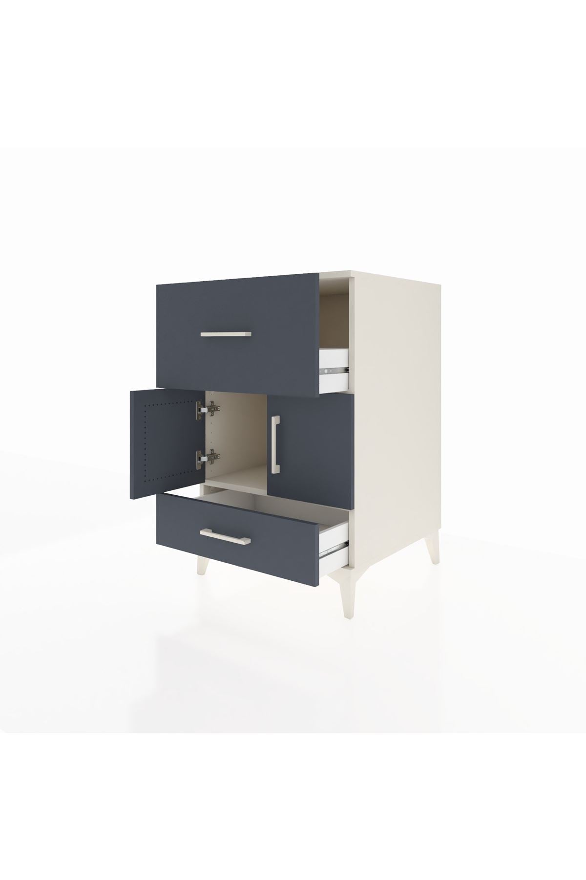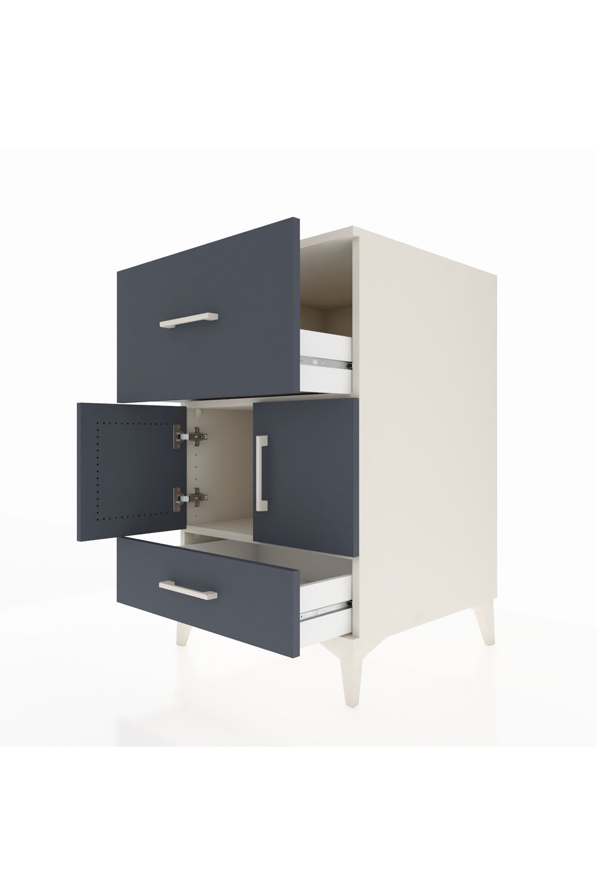 Bu komodin, evinizde düzen ve estetik bütünlüğü bir arada sunar. Aytaşı üst yüzeyin sakin beyaz tonları ile antrasit kapakların derin gri dokusu modern ve dengeli bir görünüm oluşturur; atlas çam seçeneği ise sıcak ve doğal bir atmosfer sağlar. Metal ayakları sağlam ve dayanıklı, metal kulplar uzun ömürlü kullanım sunar. Tek raflı yapısı sayesinde sık kullanılan eşyalarınıza hızlı erişim sağlar, iki çekmece ve iki kapaklı bölme ise kullanım tercihine göre düzenlenebilecek depolama alanı yaratır.