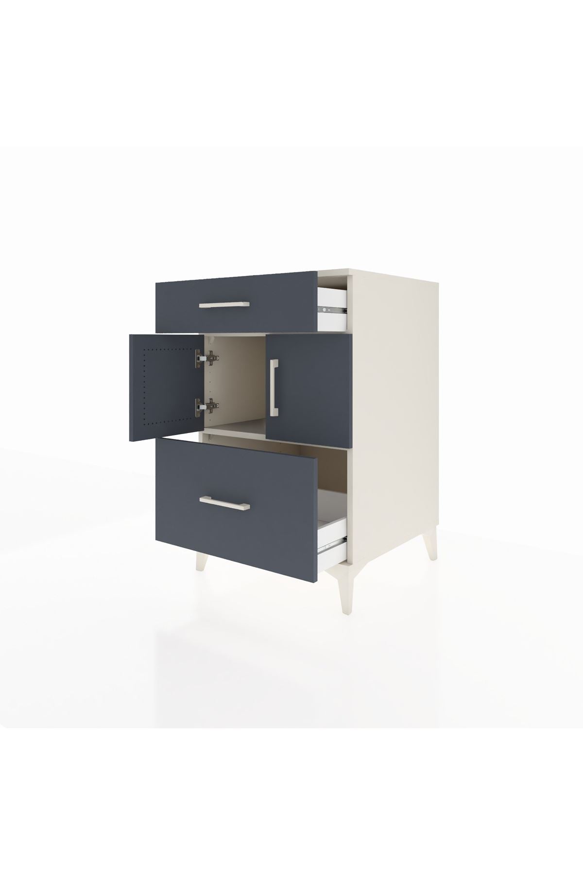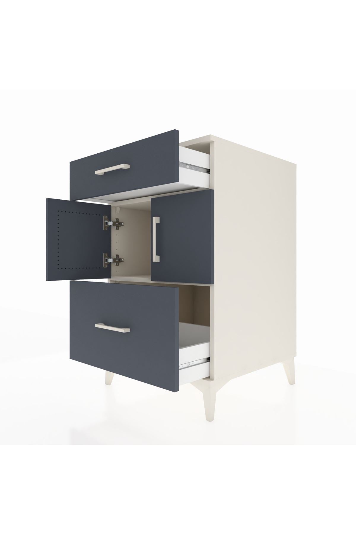 Kompakt ölçüleriyle yatak odasında gece sehpası, koridorda düzenleyici veya oturma odasında yan sehpa olarak kullanılabilir. 1. sınıf suntalam yüzey rutin temizlikte kolaylık sağlar, çizilmelere karşı dayanımı yüksektir. Metal ayaklar zeminden yükselttiği için temizlik pratikleşir ve nemli zeminlere karşı koruma sağlar. Çekmecelerdeki metal kulplar, sık kullanımda bile sağlam tutuş sunar. Raf yüksekliği ihtiyaca göre ayarlanabildiğinden kitaplar, kutular veya dekoratif objeler için esnek depolama avantajı sağlar.