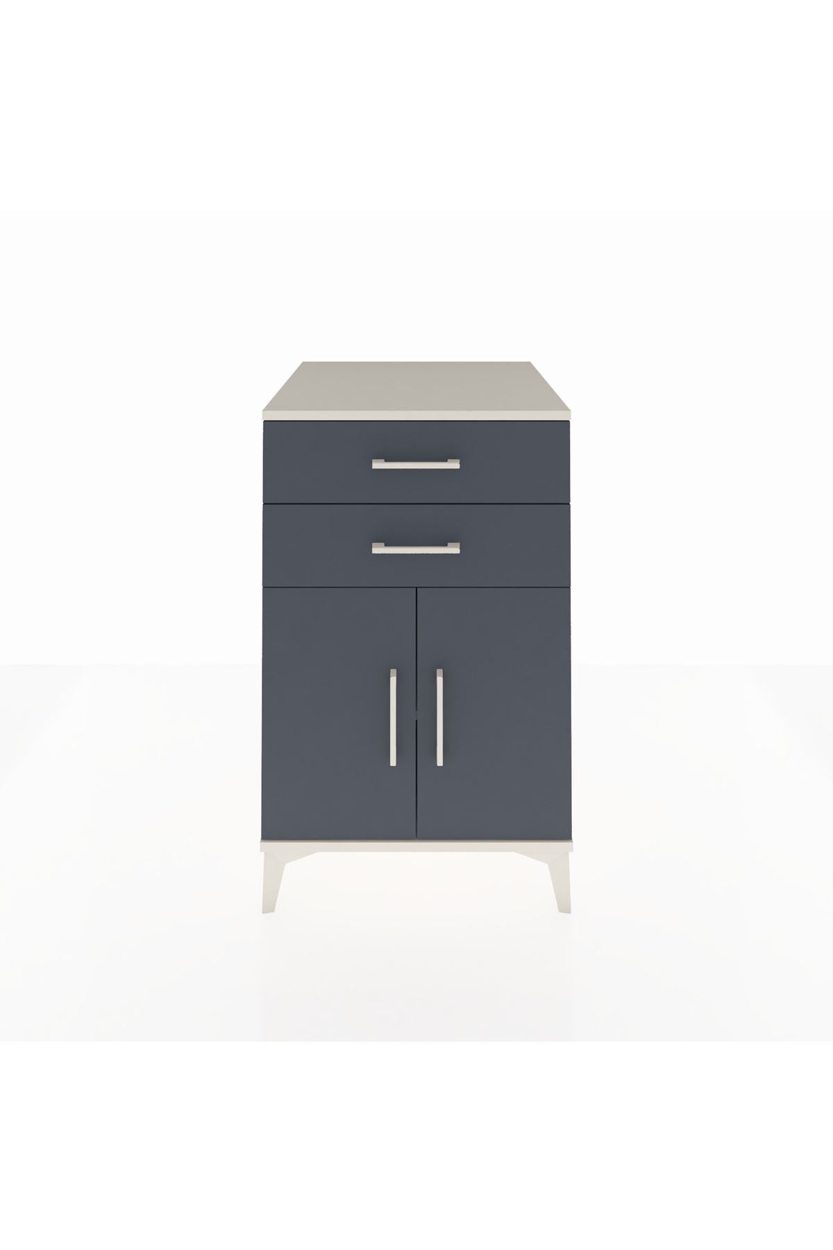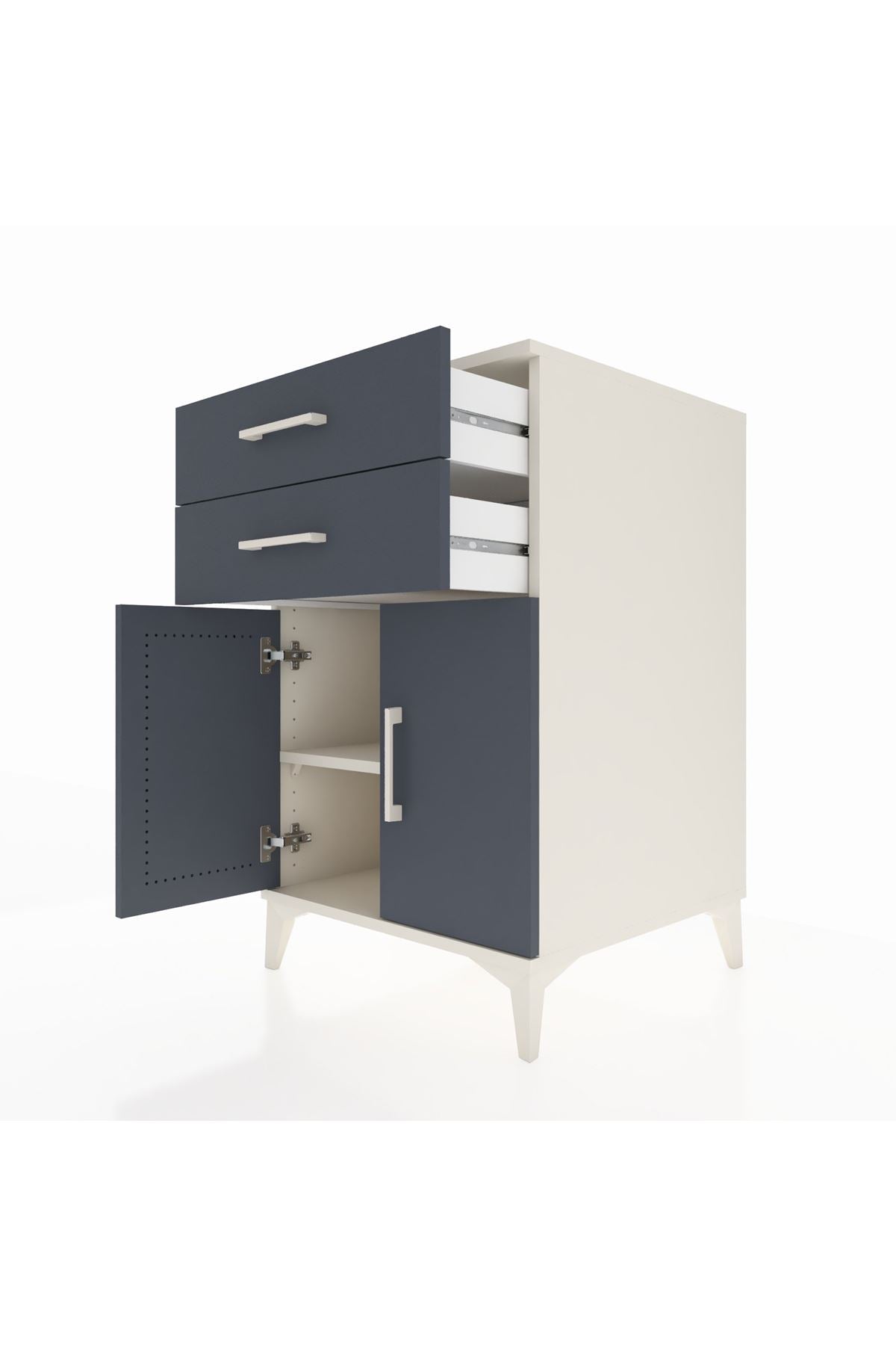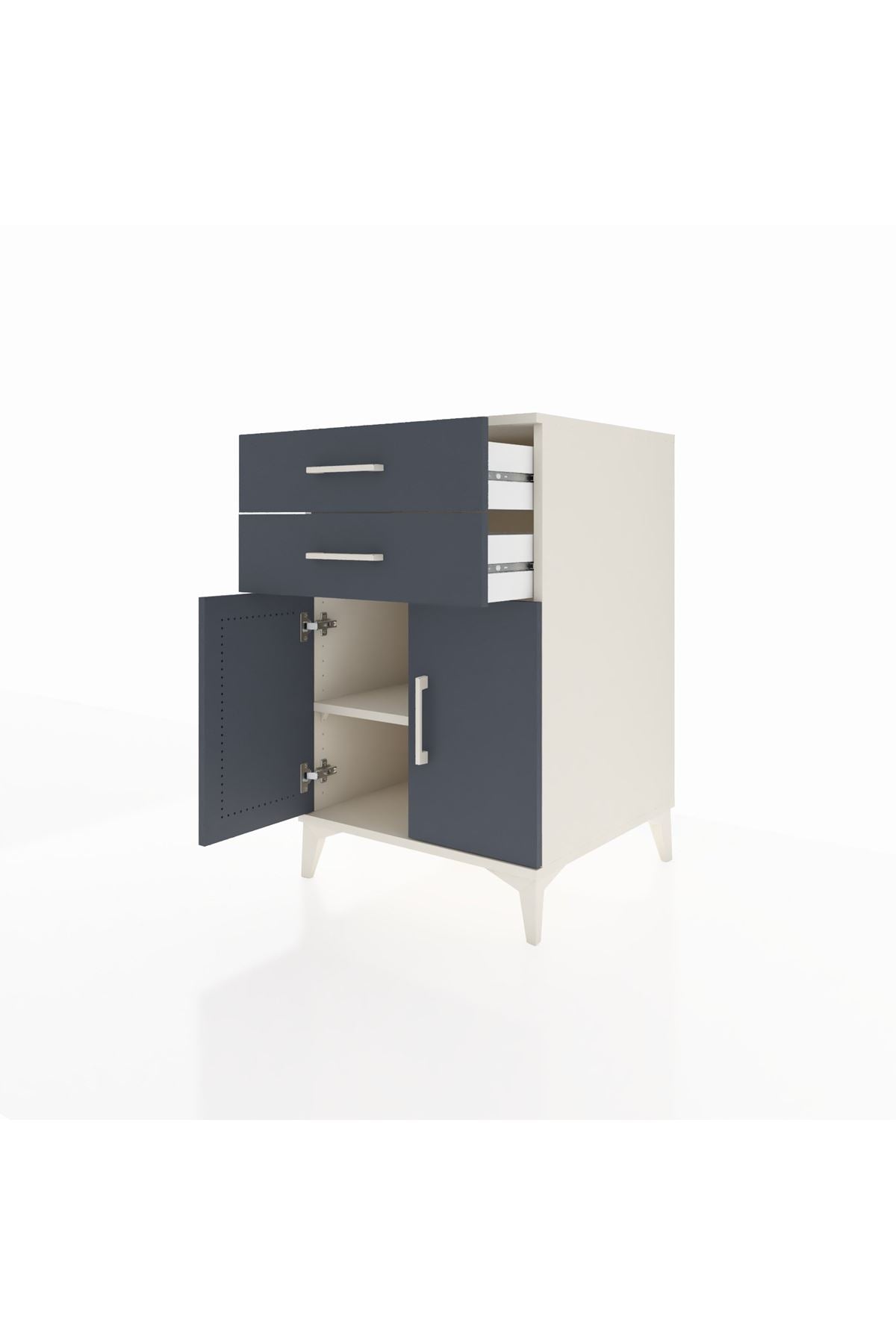 Bu komodin, evinizde düzenli ve şık bir depolama alanı sağlar. Aytaşı üst yüzey modern beyaz tonuyla ferah bir his verirken antrasit gövde sakin ve sofistike bir kontrast sunar. Metal ayakları sağlam ve dayanıklı, metal kulplar uzun ömürlü kullanım sunar. Tek raflı tasarım, 2 çekmece ve 2 kapaklı bölümü ile farklı eşyalarınızı kolayca sınıflandırmanızı sağlar; çekmece sayısı ihtiyaca göre konfigüre edilebilir, raflar ise kullanımınıza uygun şekilde ayarlanabilir.