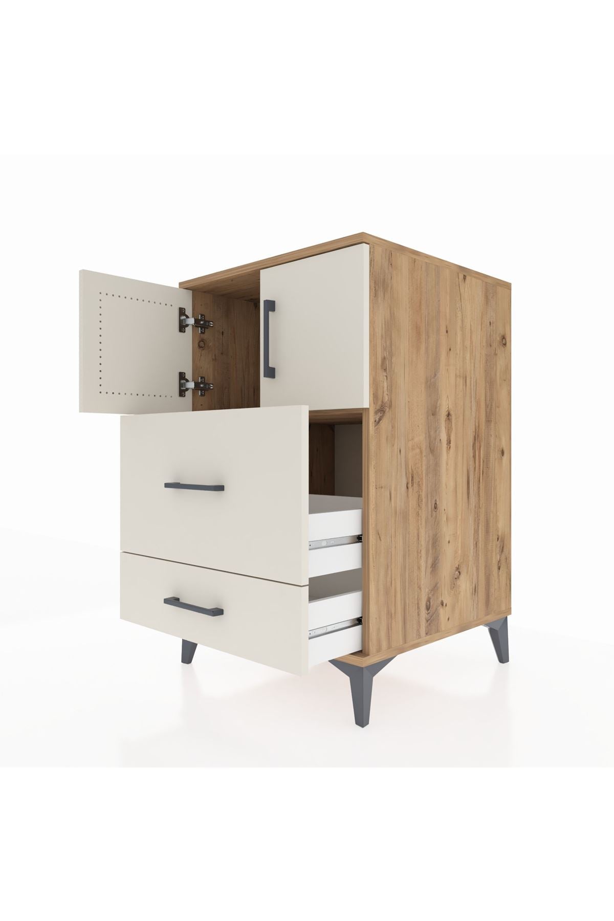Bu komodin, evinizde düzen ve estetik sağlar. Aytaşı seçeneği modern beyaz tonuyla ferah bir atmosfer sunar, Atlas Çam üst yüzey doğal ahşap dokusuyla sıcaklık katar, Antrasit seçeneği ise şık ve çağdaş bir görünüm meydana getirir. Metal ayaklar sağlam ve dayanıklı taşıma performansı sunar, metal kulplar ise uzun ömürlü ve rahat kullanım sağlar.