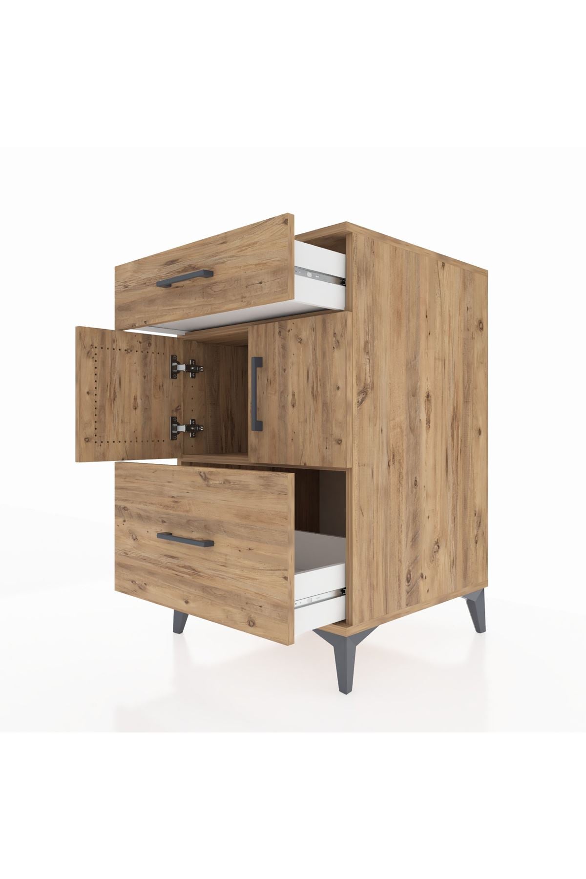 Bu komodin, evinizde düzen, estetik ve fonksiyonelliği bir arada sağlar. Atlas Çam seçeneği doğal ahşap dokusunu yaşatırken Aytaşı modern beyaz tonu ve Antrasit derin gri ile farklı dekorasyon stillerine uyum gösterir. Metal ayaklar yere sağlam oturur, ürünün dingin duruşunu destekler; metal kulplar ise sık kullanıma dayanıklı olacak şekilde tasarlanmıştır. İç düzenlemeler sayesinde raflar ayarlanabilir, çekmece sayısı konfigüre edilebilir ve ihtiyaçlarınıza göre kolayca uyarlanabilir.