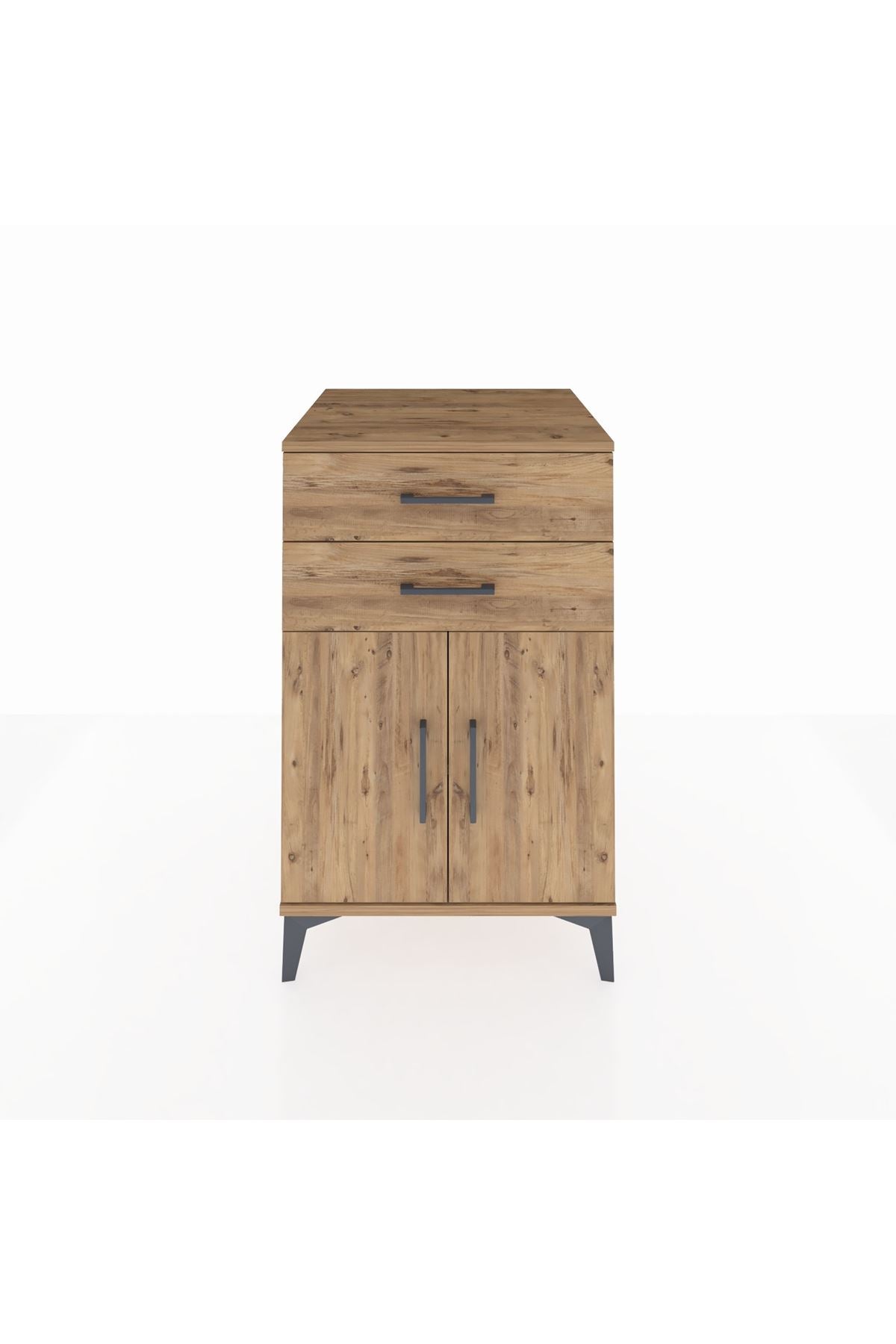 Birinci sınıf suntalam uzun ömürlü kullanım sağlar. Metal donanımlar sağlamlık katarken raflar ayarlanabilir, çekmece sayısı konfigüre edilebilir. Montaj bağlantıları dayanıklı malzemelerle güçlendirilmiştir; uzun süreli kullanımlarda formunu korur.