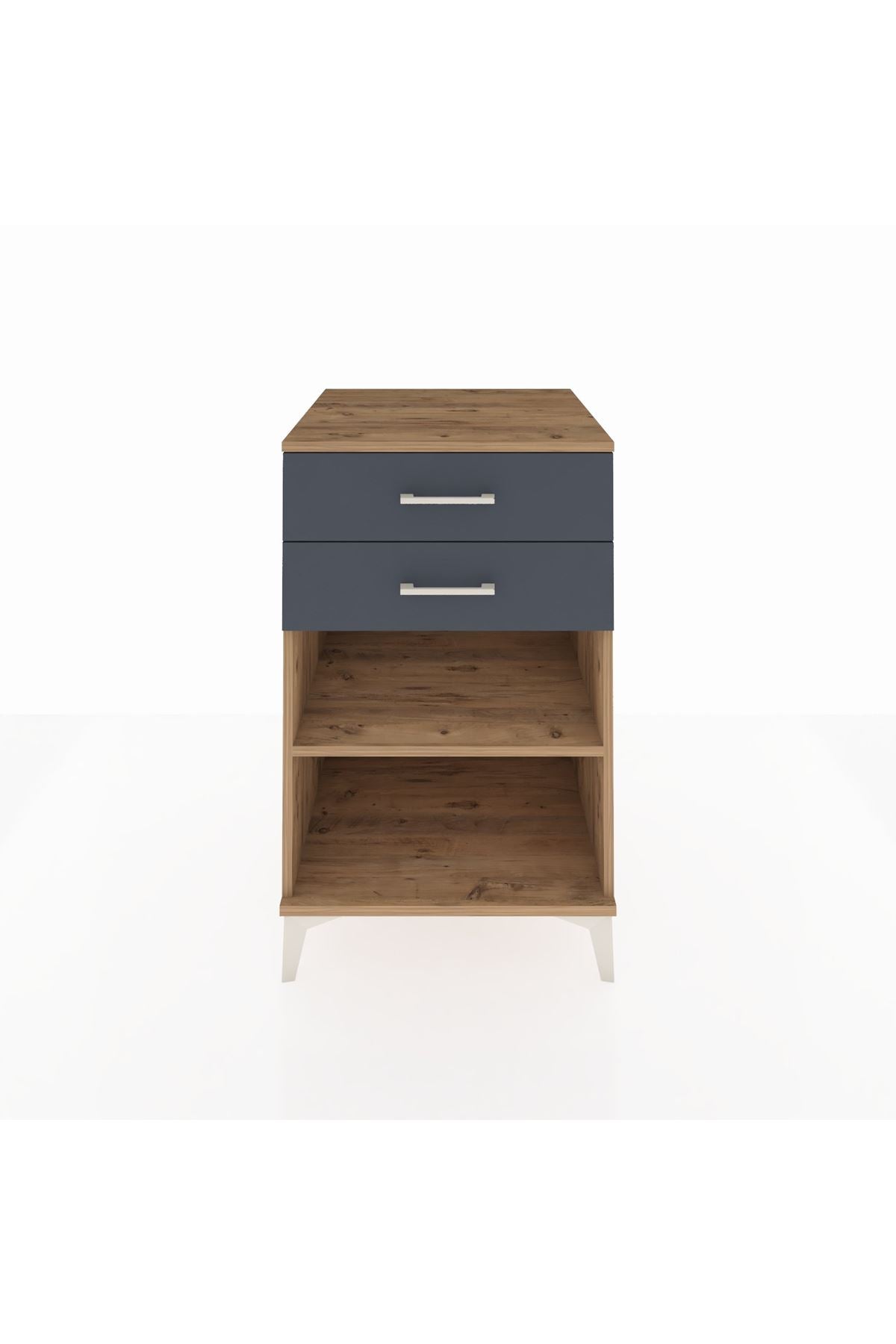 Bu komodin, evinizde düzen ve estetik bütünlüğü sağlar. Çam üst yüzeyi ve antrasit ön cephe kombinasyonu sıcak bir doğal dokunuş ile modern bir duruş sunar. Metal ayakları sağlamlık ve yerden yükseklik sağlar, metal kulplar ise konforlu ve uzun ömürlü kullanım sunar. İç taraftaki ayarlanabilir raf sistemi farklı yüksekliklerde depolama imkânı verir; çekmece sayısı varsayılan olarak iki adet olup ihtiyaç halinde konfigüre edilebilir.
