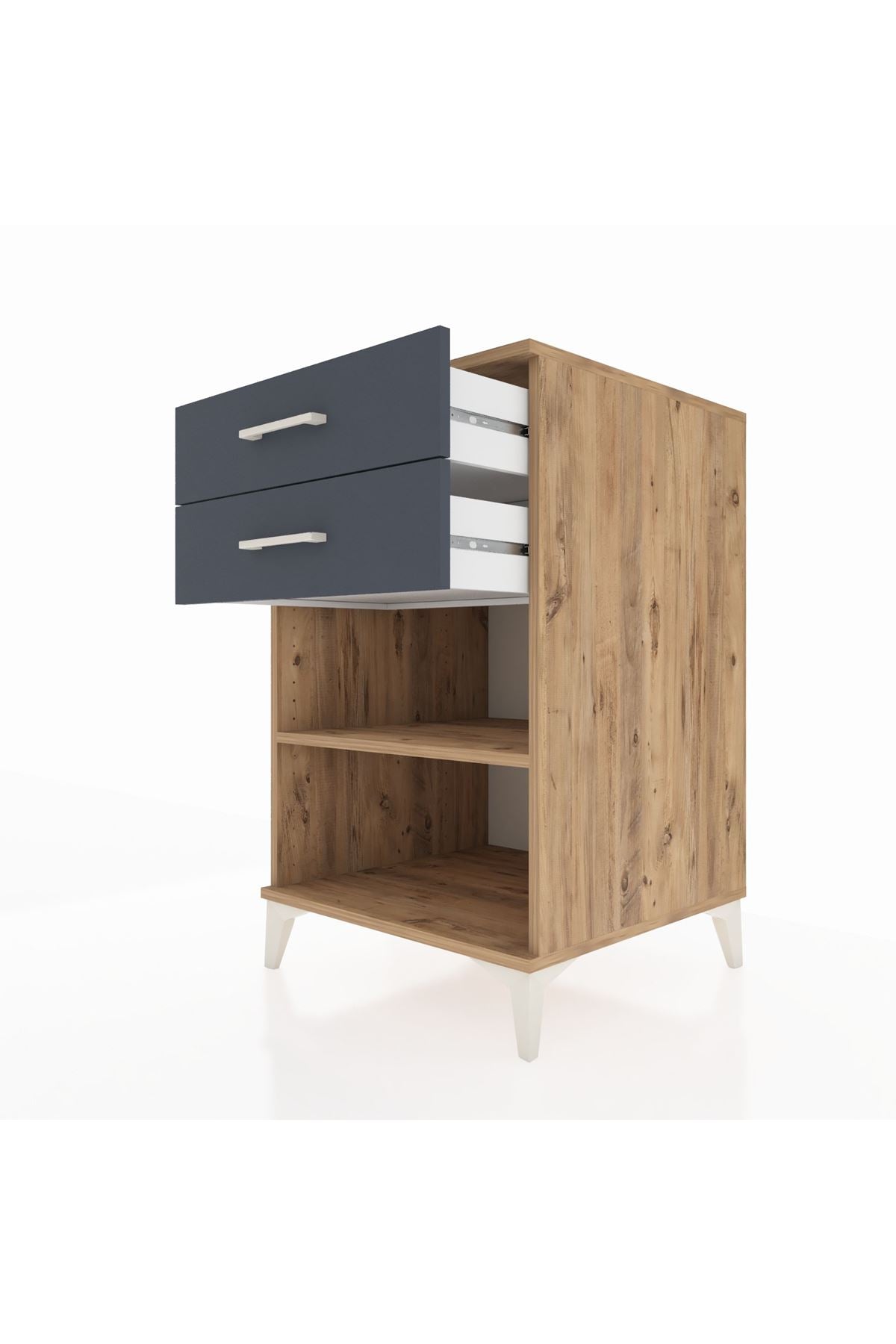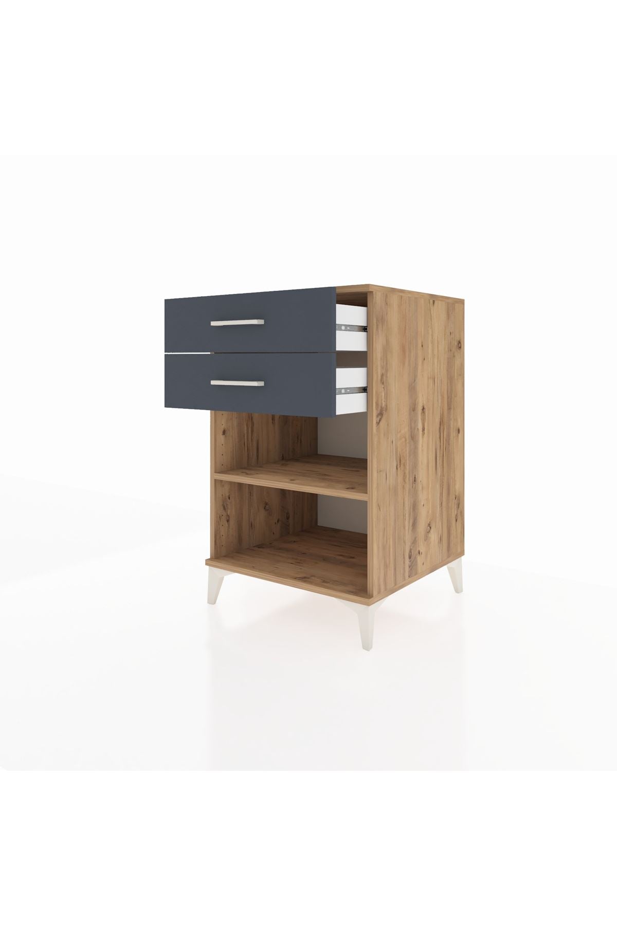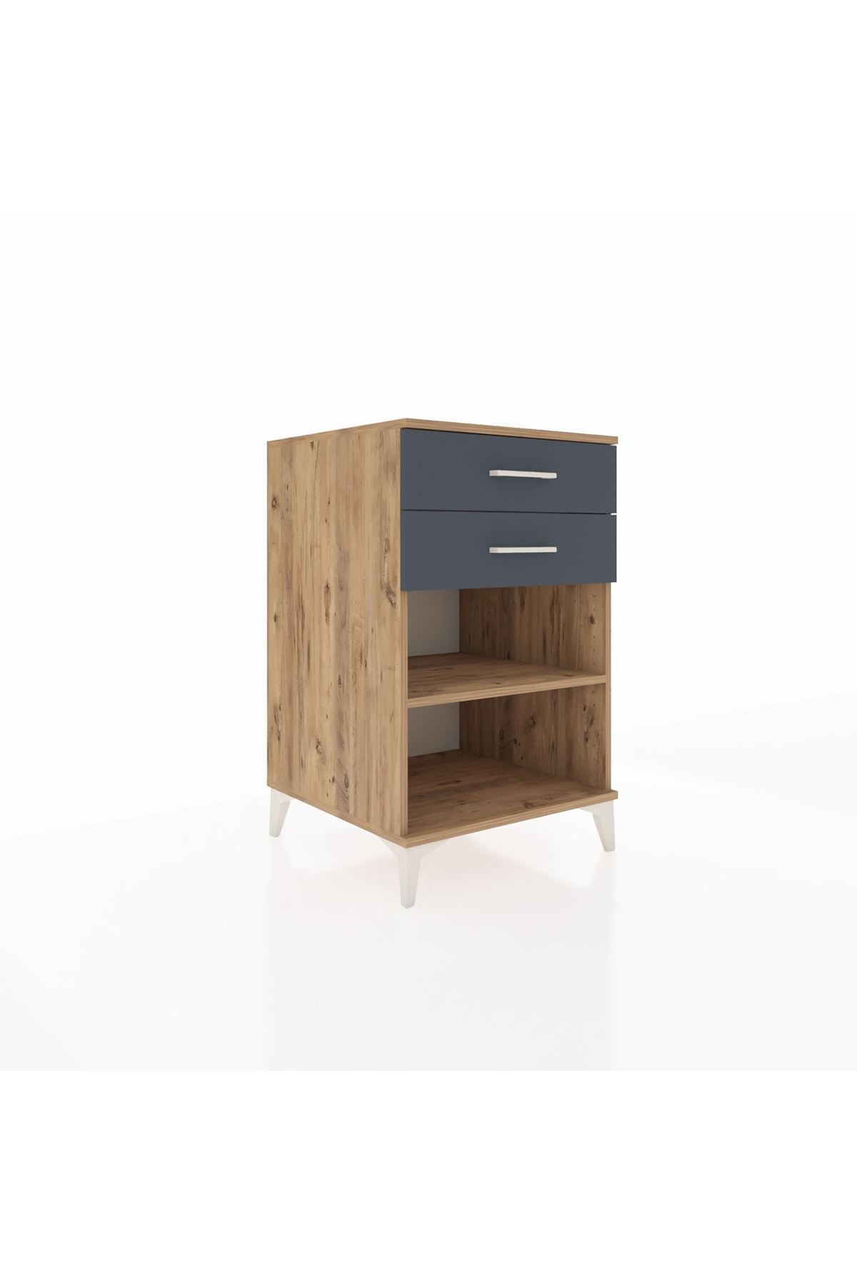 Oturma odası veya okuma köşesinde koltuğun yanında küçük bir sehpa görevi görür; iç çekmecelerde uzaktan kumandalar, gözlük ve telefon gibi kişisel eşyalarınızı saklarken üst raf kitap ve içecek için güvenli bir alan sunar. Metal kulplar sık kullanımda rahat açılıp kapanma sağlar.
