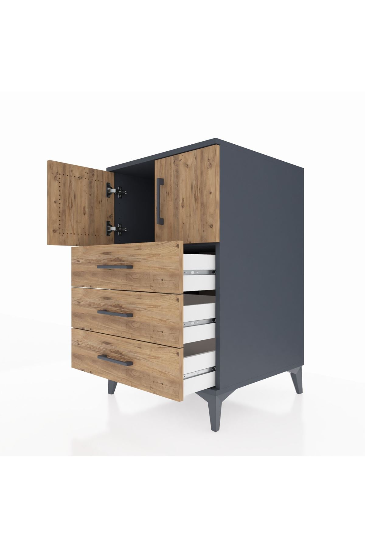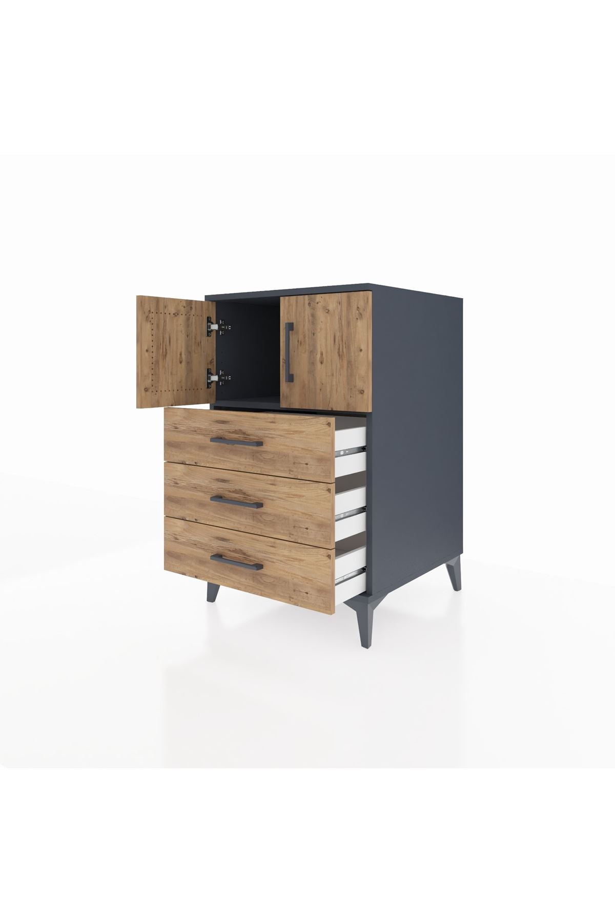 Bu komodin, kullanım alanlarında düzen ve estetiği bir arada sunar. Antrasit ve çam tonlarının kombinasyonu ile zamansız bir görünüm sağlar. Metal ayakları sağlam ve dayanıklı, metal kulplar uzun ömürlü kullanım sunar. 1. sınıf suntalam malzeme yüzeyi darbelere ve neme karşı dayanıklı kılar; kenarları düzgün işçilikle tamamlanmış, yüzey dokusu doğal ahşap hissi verir. Tek raf bölmesi raf yüksekliğine göre ayarlanabilir; 3 çekmece kolay erişim sağlayan kayar mekanizmalı sistemle çalışır. Çekmece sayısı konfigüre edilebilir, ihtiyaca göre ekleme veya çıkartma yapılabilir.