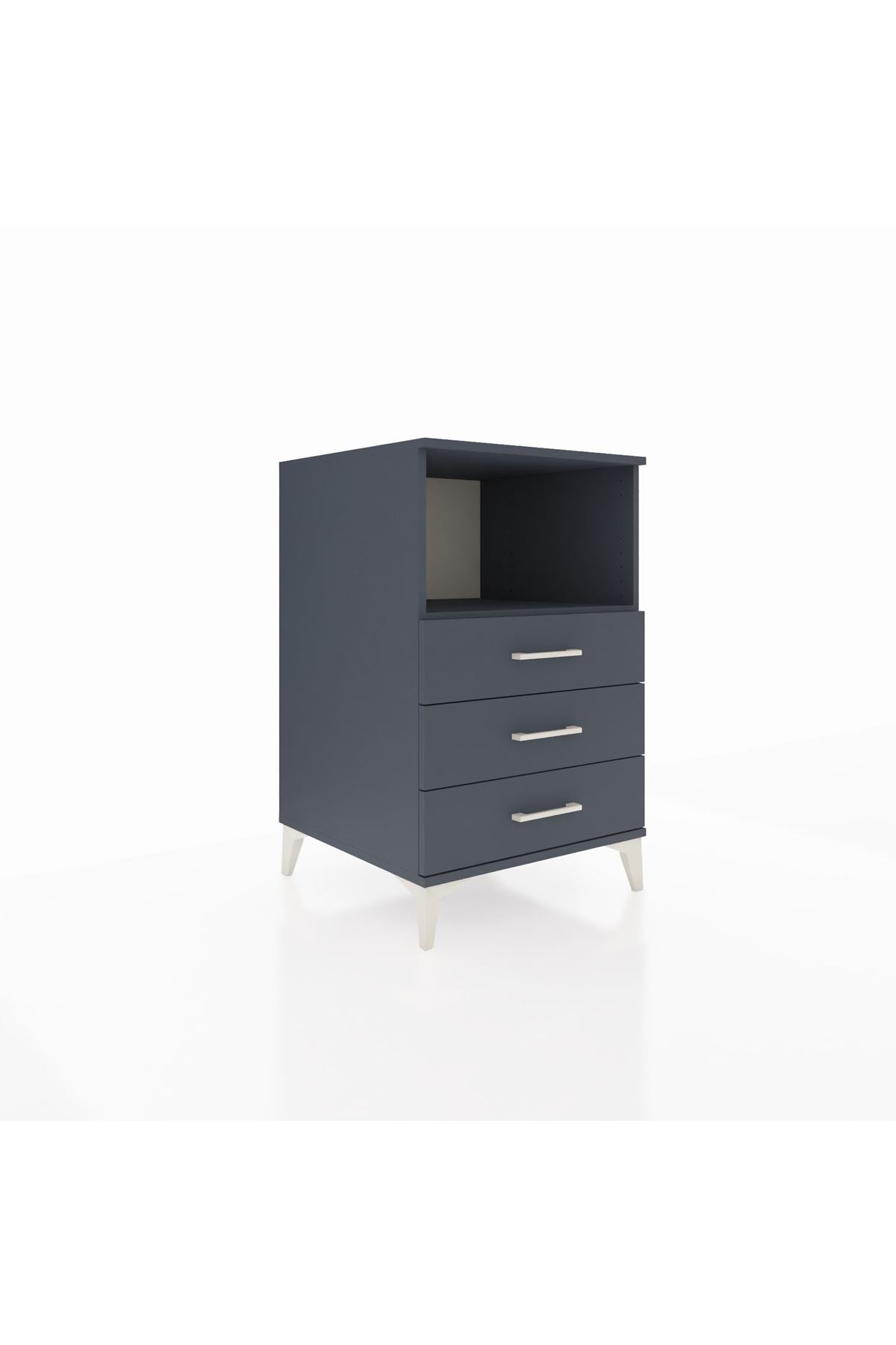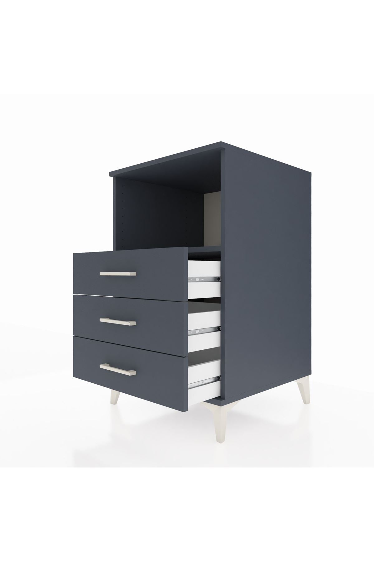 Bu komodin, evinizde düzen ve şıklık sağlar. Antrasit tonu modern ve dengeli bir atmosfer sunar; mat yüzeyi ışığı yumuşatarak odak noktası olmadan zarif bir duruş sergiler. Metal ayaklar ekstra dayanıklılık ve zeminden yükselme sağlayarak temizlik kolaylığı sunar. Metal kulplar ergonomik tutuş ve uzun ömürlü kullanım vaat eder. İç gövde ve çekmecelerde kullanılan 1. sınıf suntalam, çizilmeye ve günlük kullanıma karşı dayanıklıdır. Tek raflı tasarım, hem açık depolama hem de dekoratif eşya yerleştirme imkanı verir; raflar ayarlanabilir, ihtiyaçlarınıza göre konumlandırabilirsiniz. Çekmece sayısı konfigüre edilebilir, üç çekmeceli standart konfigürasyon cihaz şarj kabloları, kırtasiye ve küçük aksesuarlar için ideal saklama alanı oluşturur.