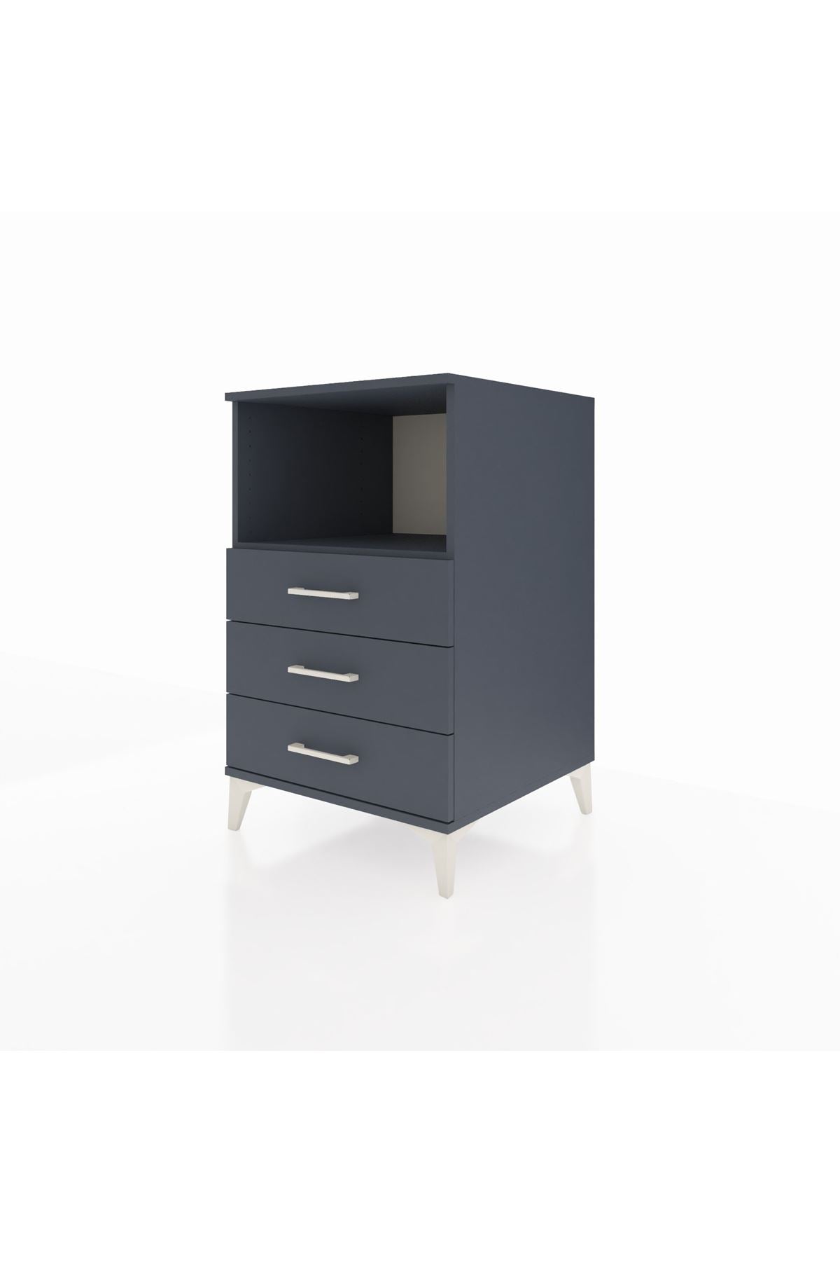 Ofiste çalışma alanını düzenlemek için ideal; dosyalar, defterler ve ofis malzemelerini çekmecelerde saklayıp açık rafta sık kullanılan belgeleri veya telefon ve tablet standını tutabilirsiniz. Metal kulplar sık kullanımda bile konforlu erişim sağlar. Komodinin yüksekliği, masa yanında ek depolama ve yüzey alanı sağlamaya uygundur.