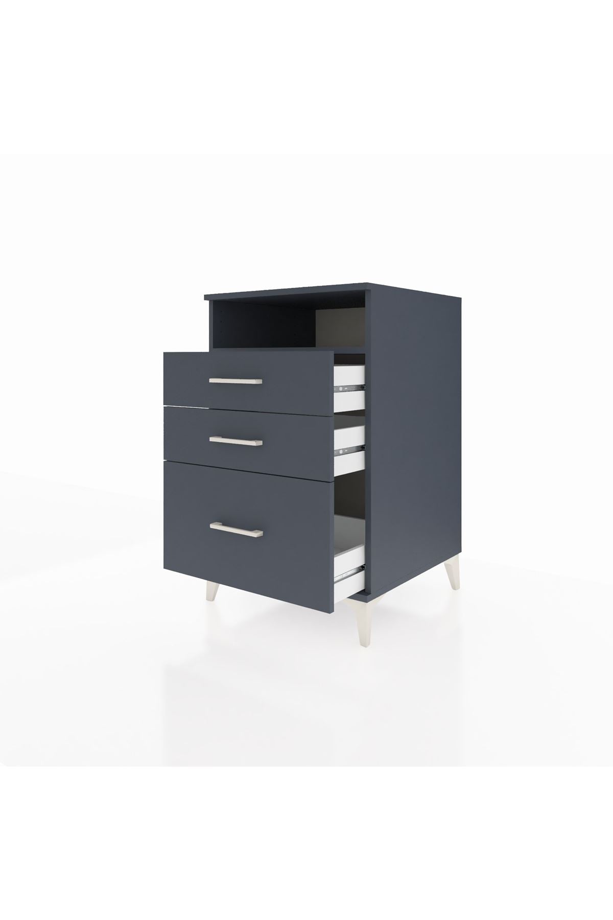 Kullanım kolaylığı sağlayan tek raf bölümü; kitap, uzaktan kumanda veya telefon gibi sık erişilen eşyalar için ideal alan sunar. Üç çekmece günlük eşyaları, kıyafetleri veya oyun aksesuarlarını düzenli tutar. Çekmece sayısı konfigüre edilebilir; ihtiyaçlarınıza göre daha az ya da daha çok çekmece seçeneği sunar. Raflar ayarlanabilir olduğundan farklı yükseklikteki eşyalar için esnek depolama imkanı sağlar. Komodinin üst yüzeyi gece lambası, bitki veya dekoratif objeler için uygun ölçüdedir, yatak odası ve oturma alanlarında düzen sağlayarak yaşam konforunu artırır.