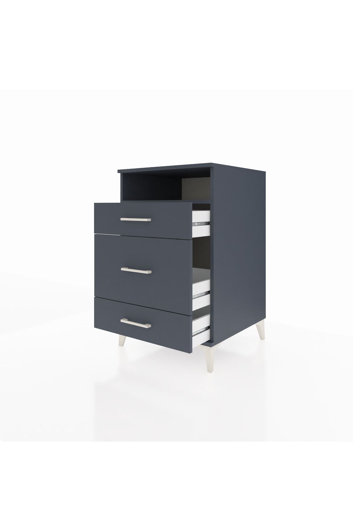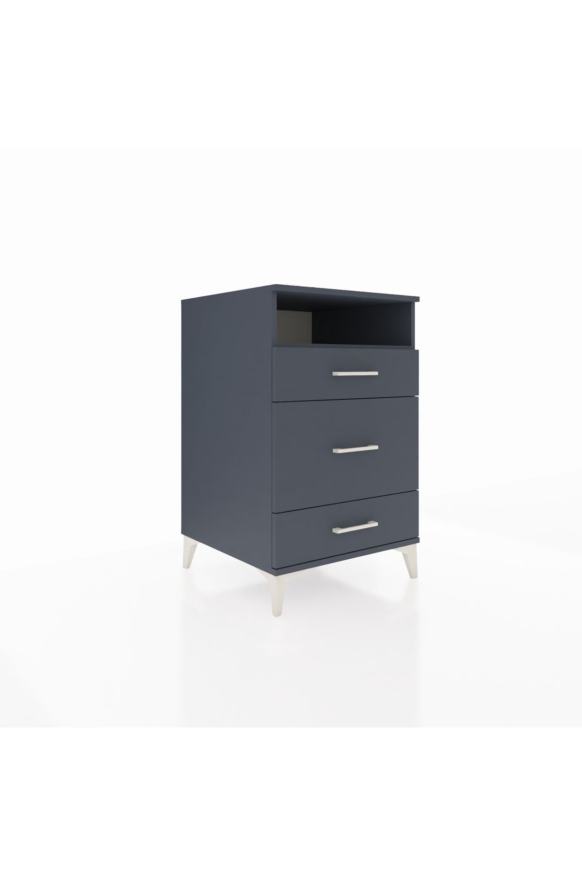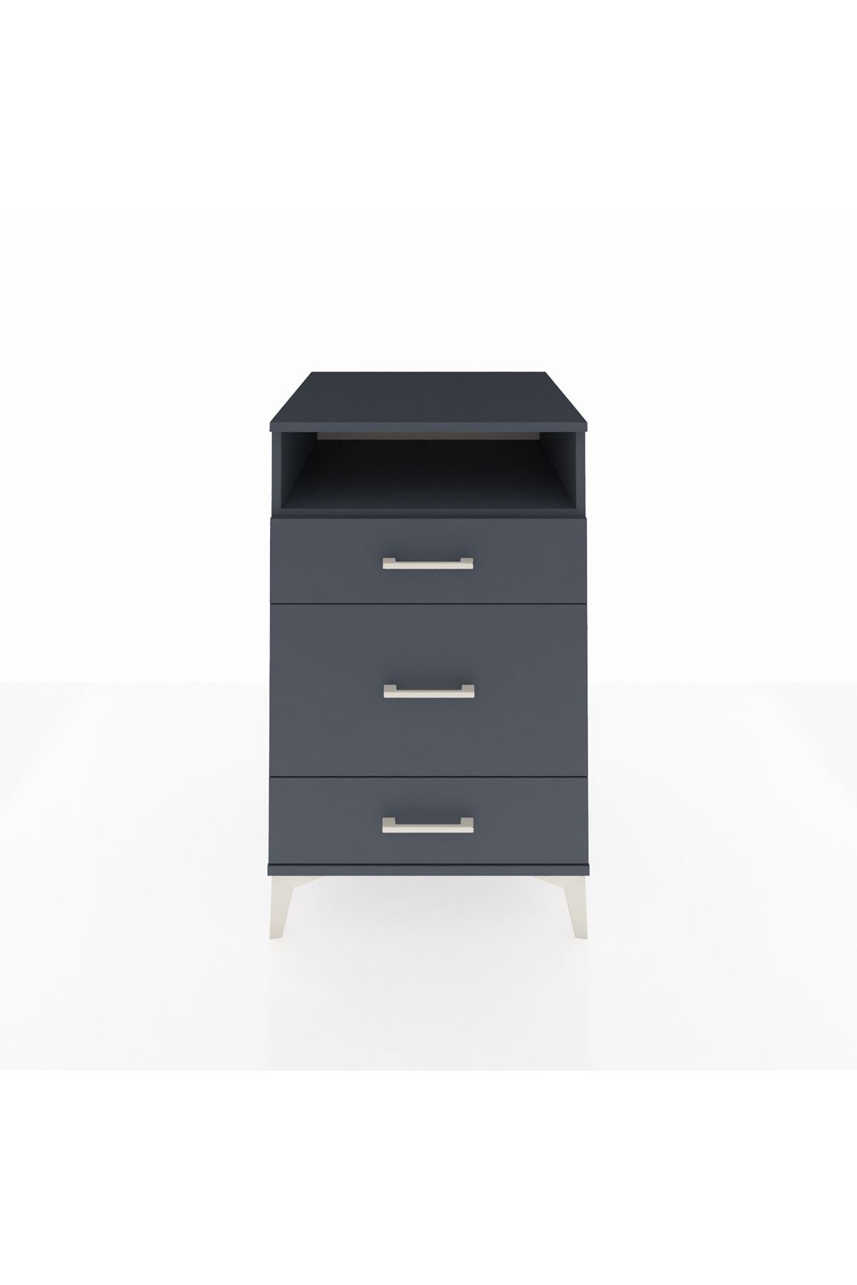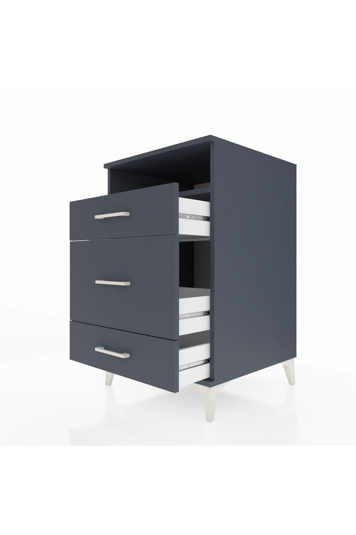 Bu komodin, evinizde düzen ve estetik bütünlüğü sağlar. Antrasit renk seçeneği modern ve sofistike bir atmosfer sunar; düz yüzeyleri ve dengeli ölçüleriyla farklı dekorlarla uyum sağlar. Metal ayakları zemine sağlam oturur, darbelere ve uzun süreli kullanıma karşı dayanıklılık sağlar. Metal kulplar ergonomik tutuş sunar ve sık kullanımda bile formunu korur. Üst bölümdeki tek raf, sık kullanılan eşyaları el altında tutmak için idealdir; raf yüksekliği ihtiyaçlara göre ayarlanabilir. İç çekmece yapısı kullanıcının tercihi doğrultusunda konfigüre edilebilir; varsayılan olarak 3 çekmece ile sunulur ancak çekmece sayısı talebe göre değiştirilebilir.