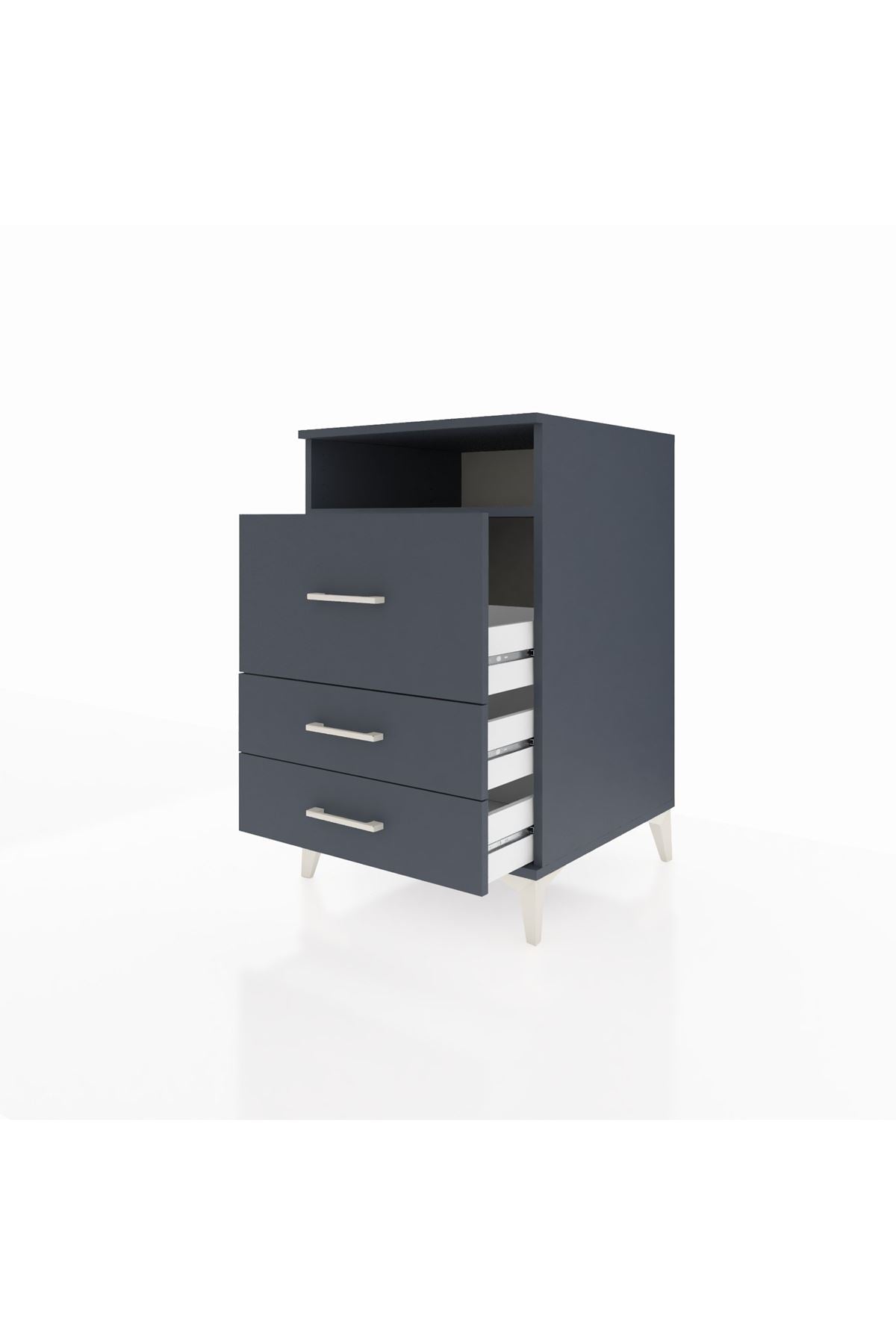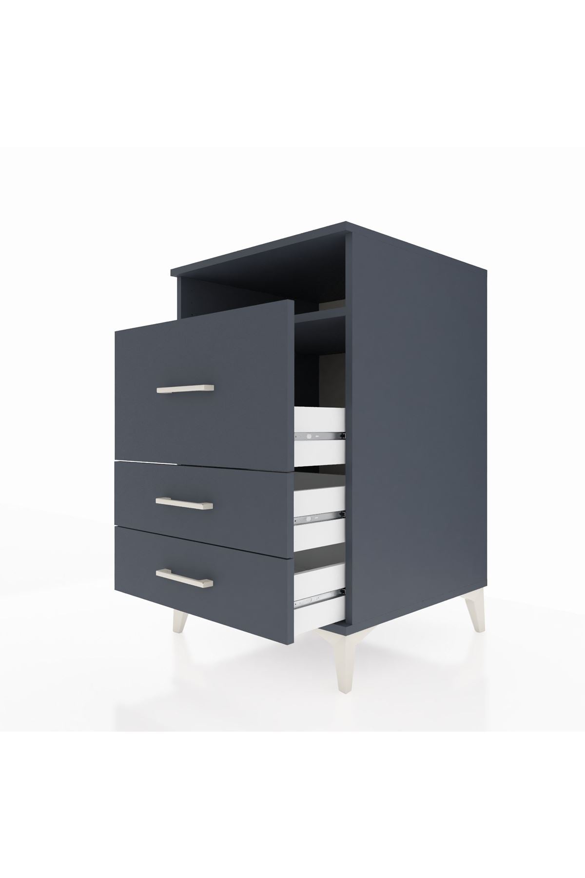 Bu komodin, evinizde düzenli ve estetik bir depolama alanı sağlar. Antrasit rengi sade ve modern bir duruş sunar; temiz yüzeyleri ve net hatlarıyla farklı dekorasyon stilleriyle uyum sağlar. Metal ayakları sağlam ve dayanıklı, metal kulplar uzun ömürlü kullanım sunar.