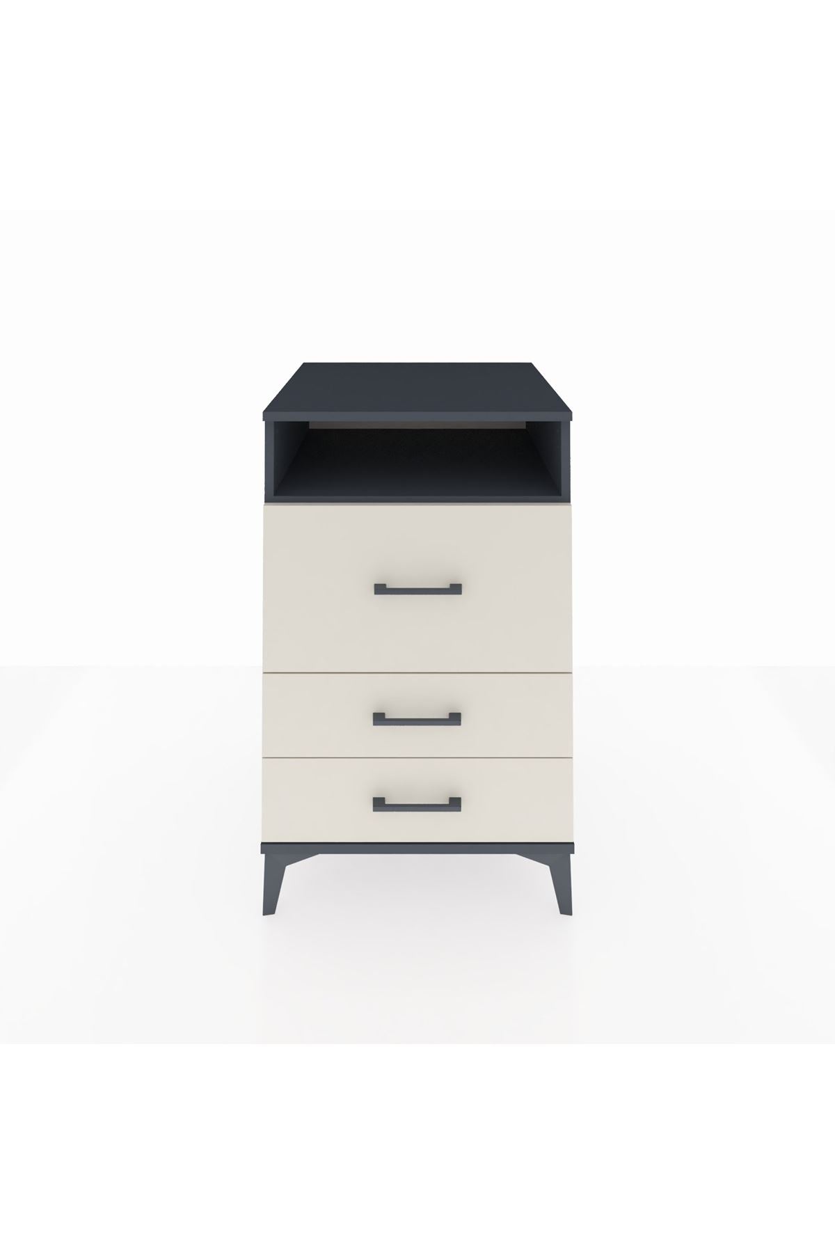 Bu komodin, evinizde düzen ve estetik bütünlüğü bir arada sağlar. Antrasit ile aytaşı uyumu modern ve sakin bir görünüm sunar; atlas çam seçeneği ise sıcak ve doğal bir dokunuş getirir. Metal ayakları sağlam ve dayanıklı, metal kulplar uzun ömürlü kullanım sunar. Üst bölümde yer alan tek raf kitap, gece lambası veya günlük kullanım eşyalarını düzenlemek için idealdir; raflar ayarlanabilir olduğu için kullanım ihtiyaçlarına göre yükseklik değişikliği yapılabilir. Standart olarak 3 çekmeceli gelen tasarımda çekmece sayısı konfigüre edilebilir, böylece depolama kapasitesi ihtiyaca göre artırılabilir veya azaltılabilir.
