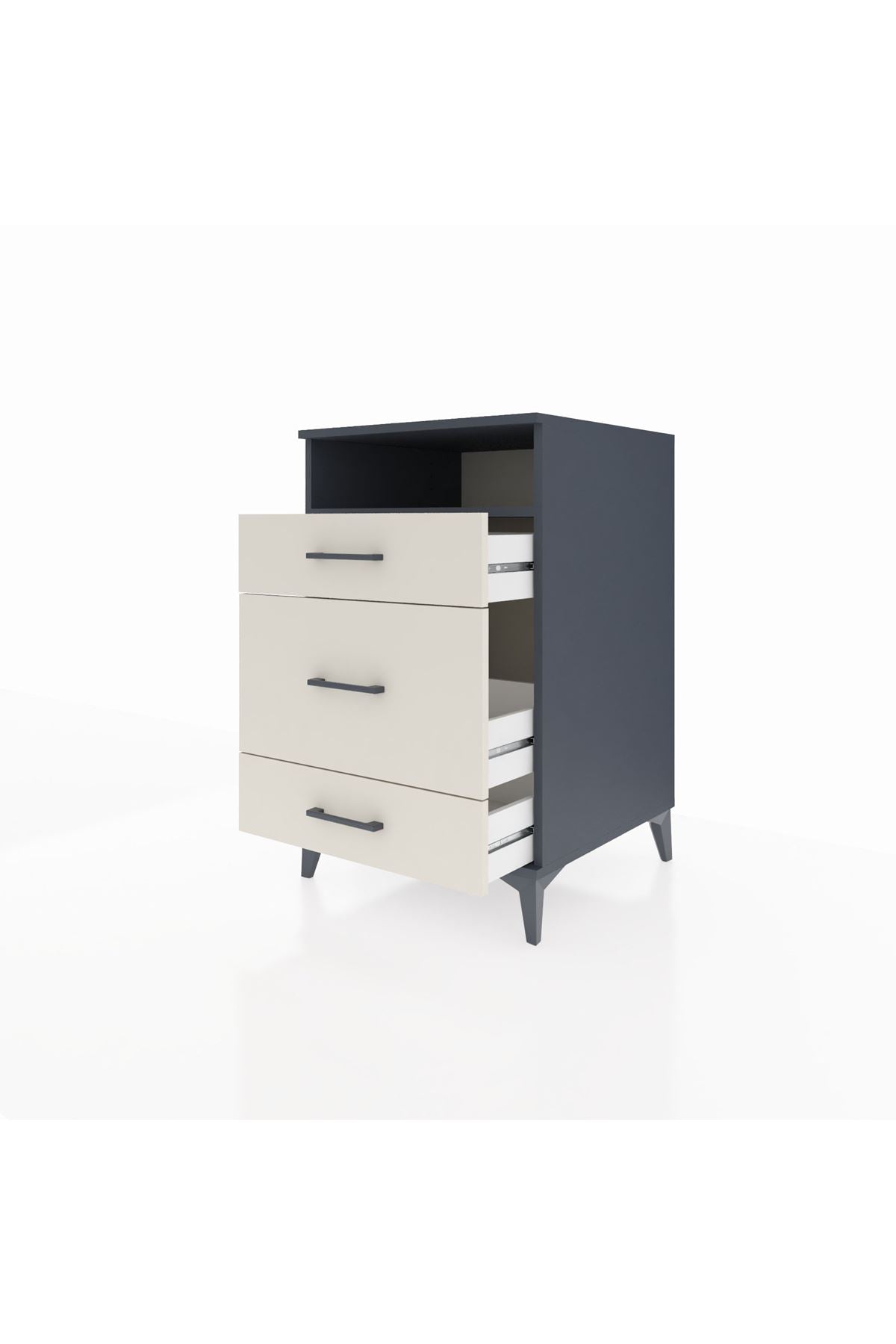 Bu komodin, evinizde düzen ve estetik uyumu bir arada sunar. Antrasit ve aytaşı renk kombinasyonu modern ve sade bir atmosfer yaratır; koyu metal detaylar ürüne çağdaş bir görünüm kazandırır. Metal ayakları sağlam ve dayanıklı, metal kulplar uzun ömürlü kullanım sunar. Tek raflı üst bölme günlük erişim gerektiren eşyalar için ideal olup raflar ayarlanabilir özelliktedir; çekmece sayısı konfigüre edilebilir oluşu farklı depolama ihtiyaçlarına kolayca uyum sağlar.