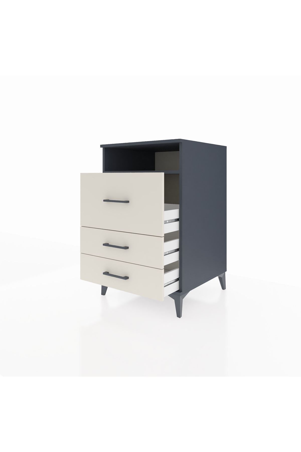 Çalışma alanında yan sehpa veya küçük depolama ünitesi olarak kullanılabilir. Üst raf, telefon tutucu, ajanda veya küçük bir masa lambası için uygundur; çekmeceler kablolar, harici diskler, adaptörler ve ofis malzemelerini saklamak için pratik bir çözüm sunar. Metal ayaklı yapı masaya sağlamlık katar, sehpa seviyesindeki komodin çalışma ergonomisini destekler.
