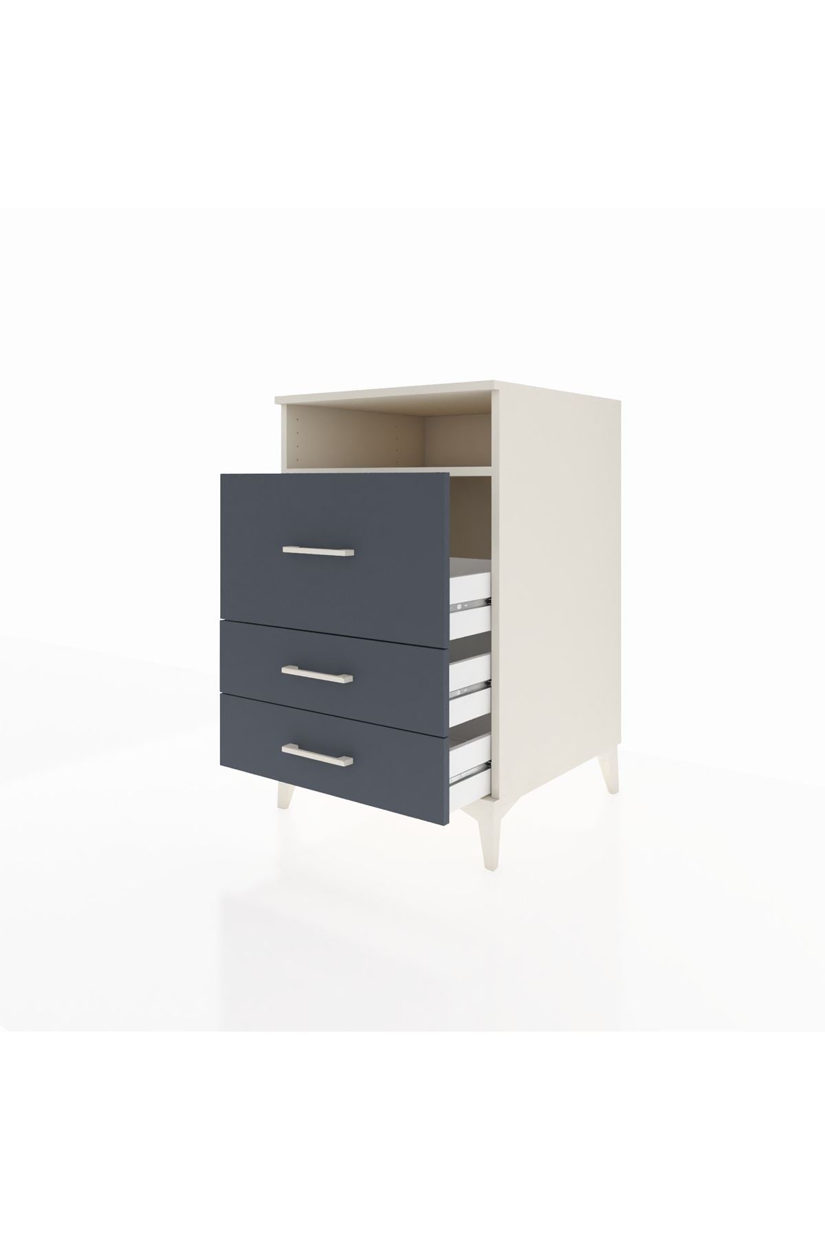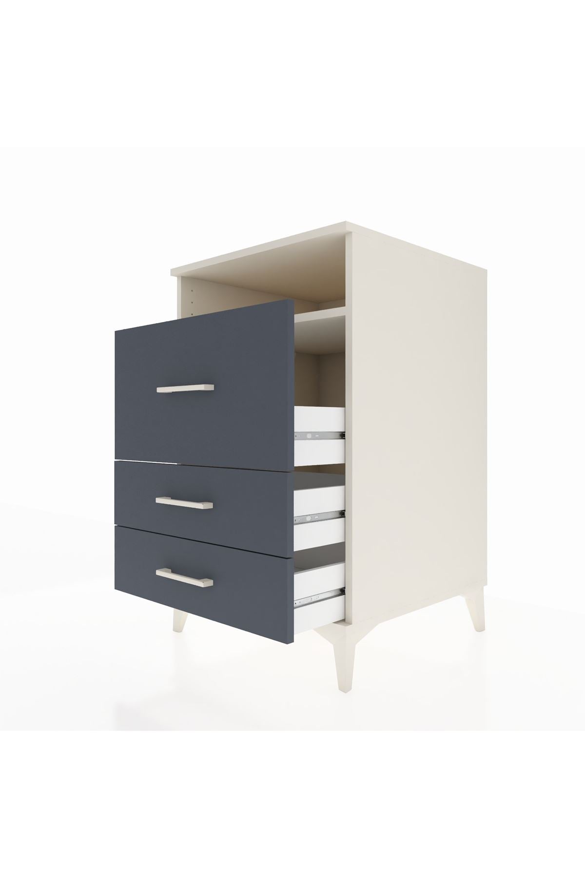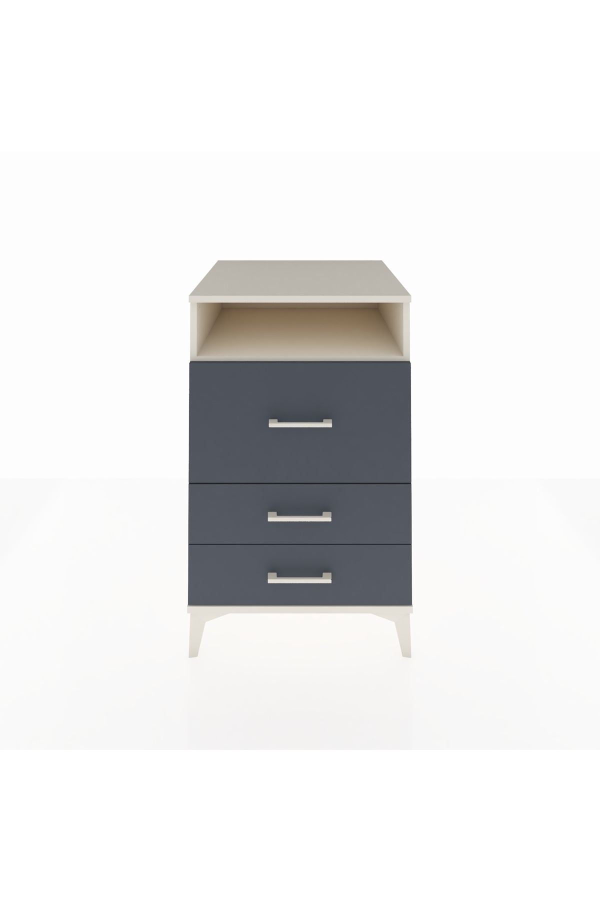 Kompakt ölçüleri ile dar alanlarda bile işlevsellik sunan bu komodin, gece lambası, alarm saati ve kitaplar için ideal bir üst yüzey sağlar. Tek raflı tasarım hızlı erişim gereken eşyaları düzenlerken üç çekmece kişisel eşyalar, şarj kabloları ve küçük tekstil ürünlerini düzenli tutar. Çekmece sayısı konfigüre edilebilir; kullanım ihtiyacınıza göre farklı düzenlemeler yapılabilir. Suntalam yüzey kolay temizlenir ve günlük kullanıma karşı dayanıklıdır. Raflar ayarlanabilir olduğundan saklama alanını büyüklüğe göre kişiselleştirebilirsiniz.