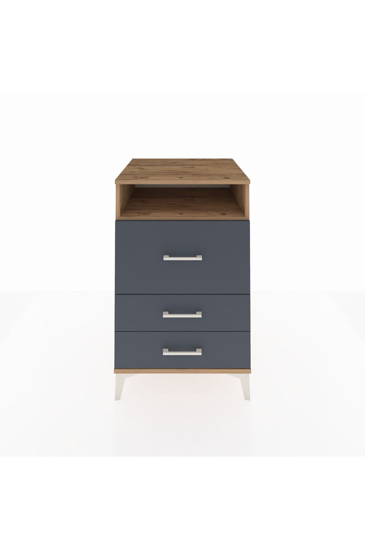 Oteller için dayanıklı ve şık bir seçenek. Antrasit ön paneller odalara modern bir hava katarken üst raf misafirlerin günlük kullanım eşyalarını yerleştirmesine uygun bir alan sunar. Çekmece sayısının konfigüre edilebilmesi, farklı oda tiplerine göre özelleştirme imkanı verir. Metal kulplar ve ayaklar yoğun kullanıma uygun sağlamlık sağlar.