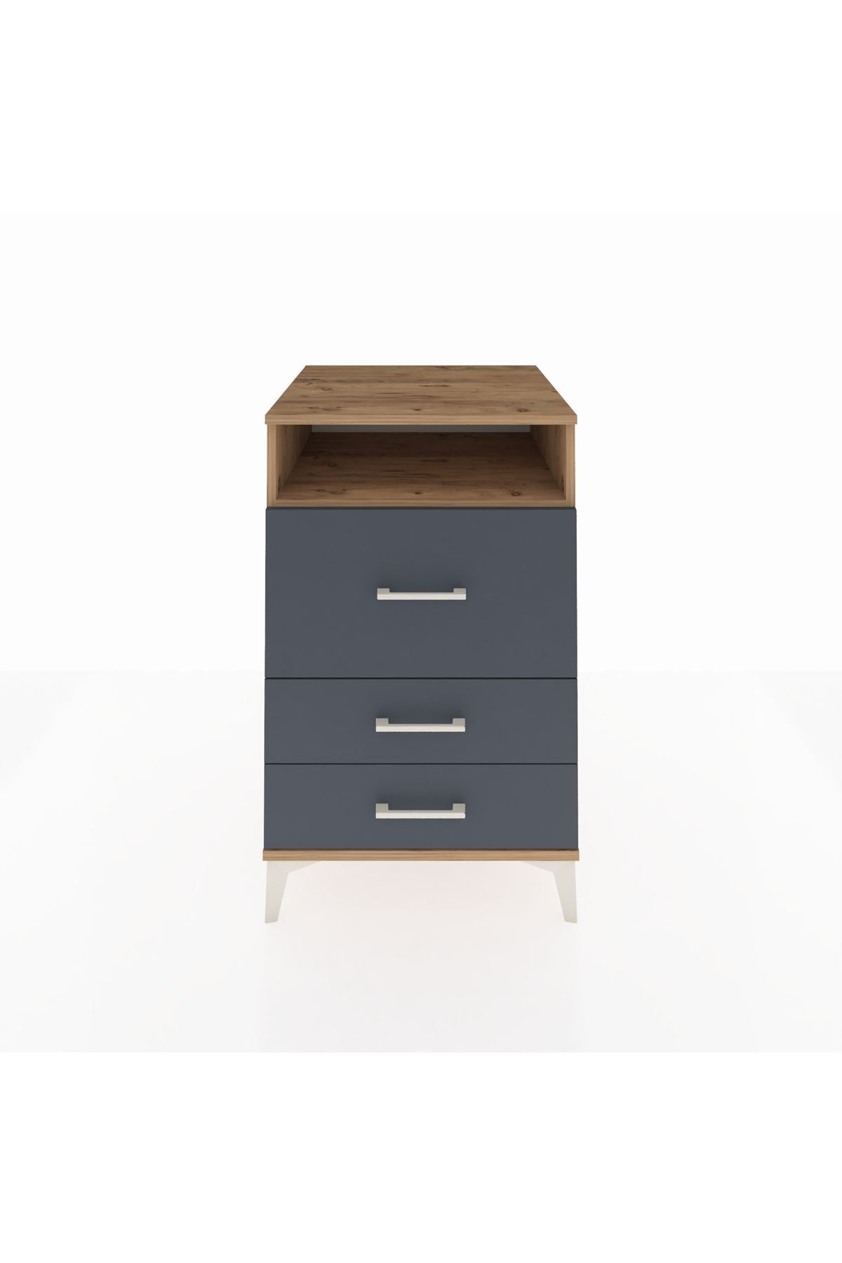 Bu komodin, yaşam alanlarınızda düzen ve estetiği bir araya getirir. Çam ve antrasit kombinasyonu doğal dokuyu modern bir çizgiyle buluşturur; metal ayaklar ürüne sağlamlık ve yerden yükseklik kazandırırken metal kulplar uzun ömürlü, güvenilir kullanım sunar. Tek raf düzeni açık depolama için ideal alan sağlayıp sık kullanılan eşyaların el altında tutulmasına yardımcı olur. Raflar ayarlanabilir yapısı sayesinde farklı yükseklikte kutu ve sepetlerle kolayca uyum sağlar, çekmece sayısı konfigüre edilebilir özelliği ile ihtiyaca göre düzen değiştirilebilir.