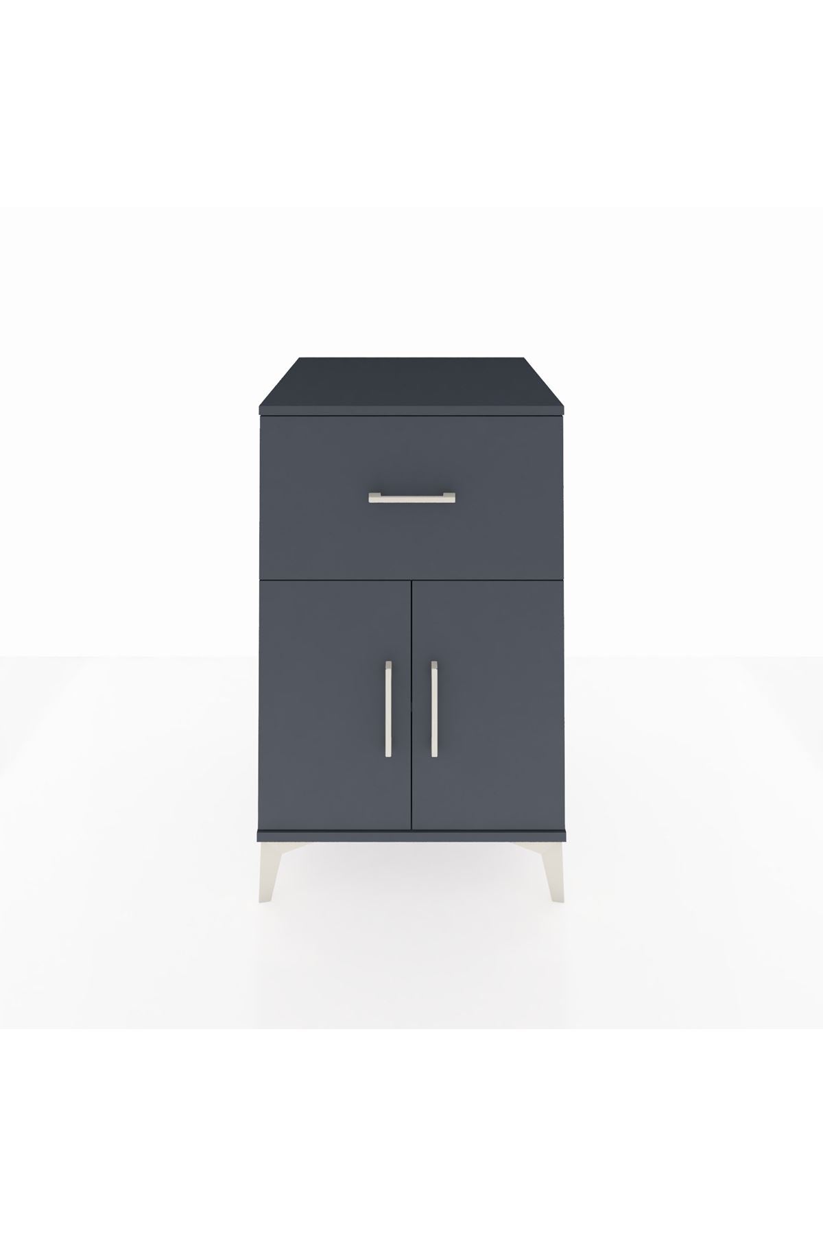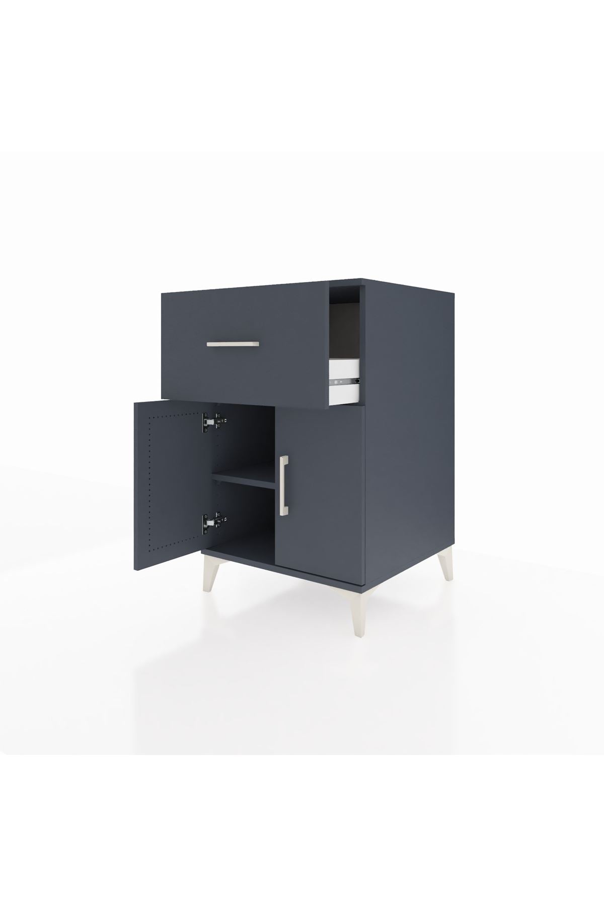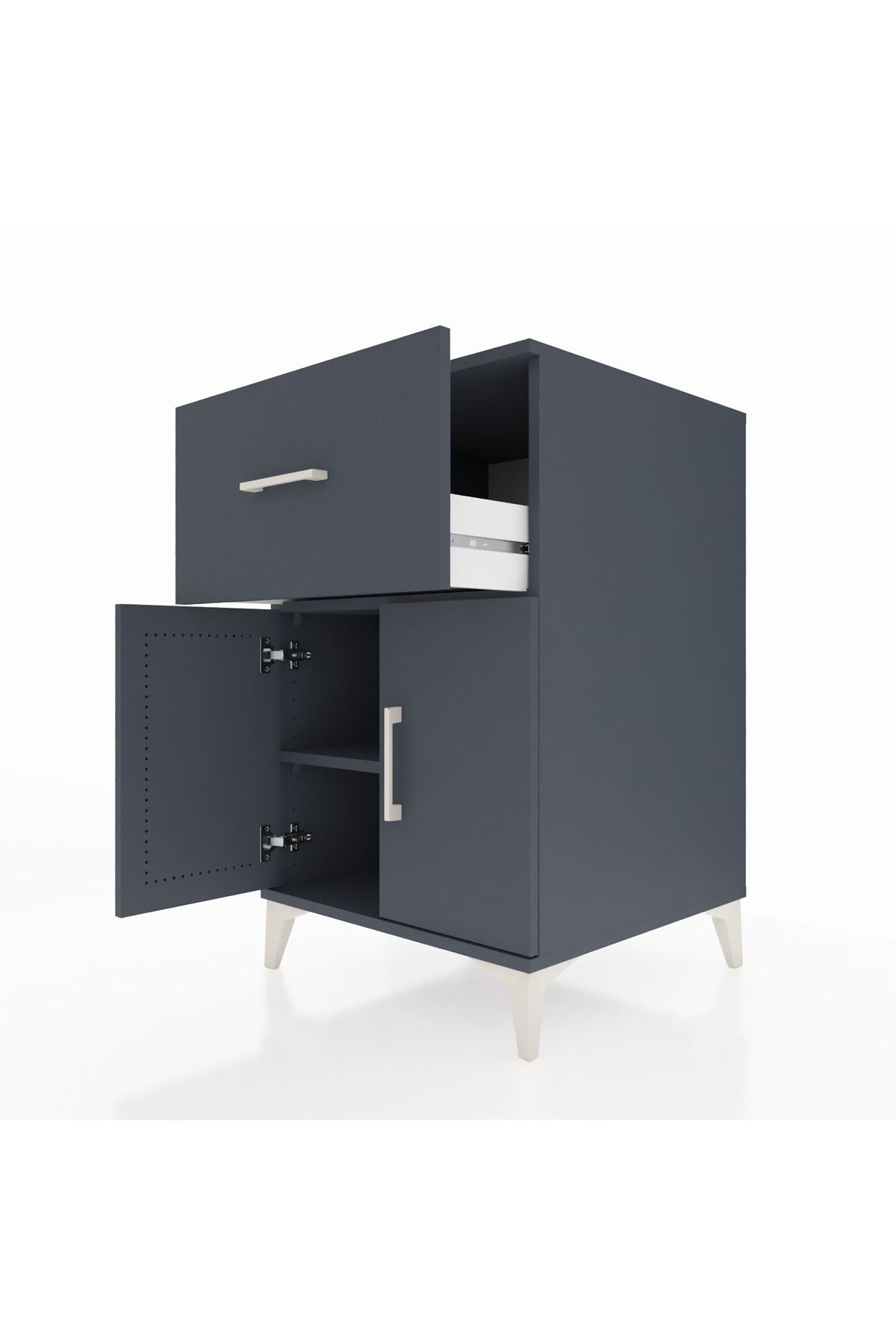 Bu komodin, evinizde düzen ve estetiği bir araya getirir. Antrasit tonu modern ve dingin bir atmosfer sunar; metal ayakları sağlamlık sağlar, metal kulplar uzun ömürlü kullanım sunar. Tek çekmece üst bölümde hızlı erişim gerektiren eşyalar için ideal depolama alanı oluştururken, iki kapaklı alt bölüm içerisindeki raf ayarlanabilir özelliğiyle farklı yüksekliklerde kullanım imkanı verir.