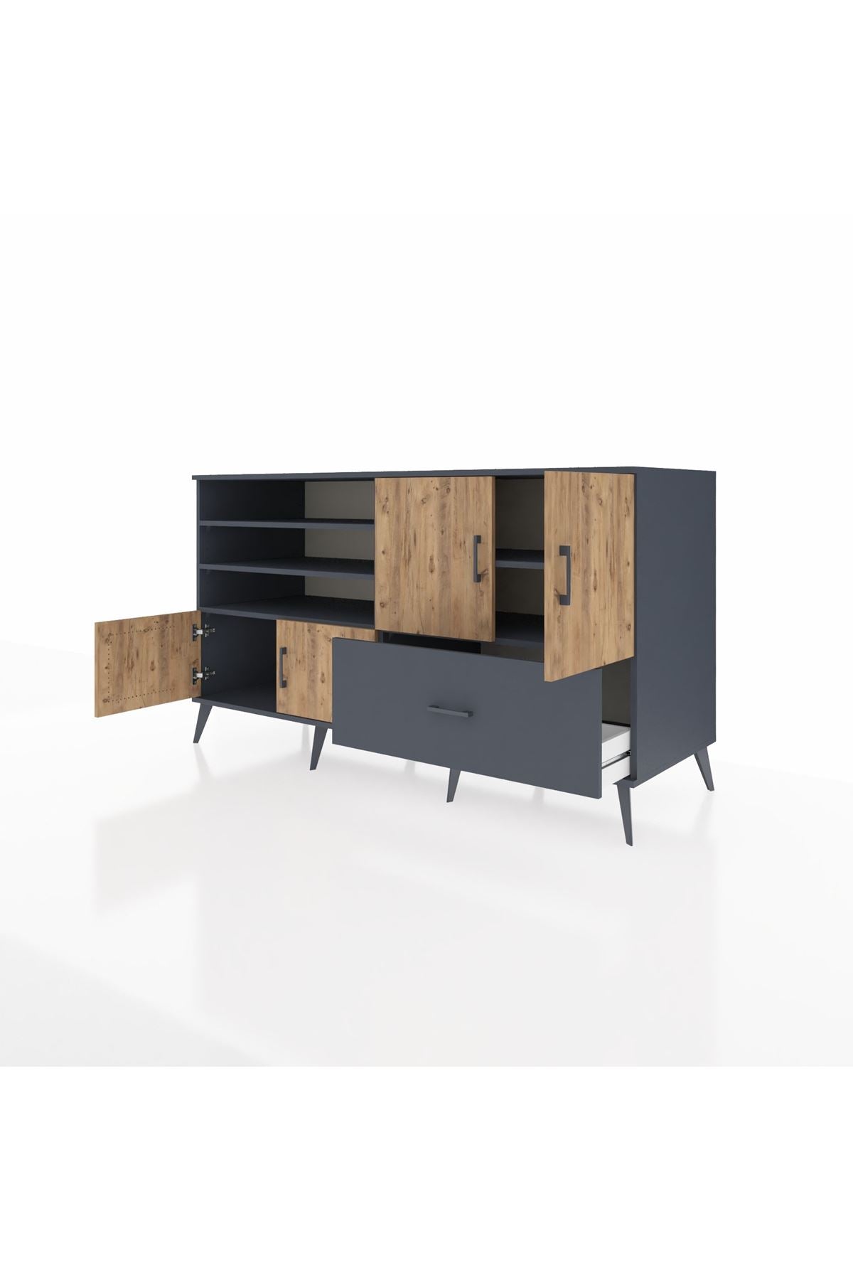 Kronos Konsol 5 Raflı Tek Çekmeceli 4 Kapaklı 176x59x99 Antrasit-Çam/Antrasit