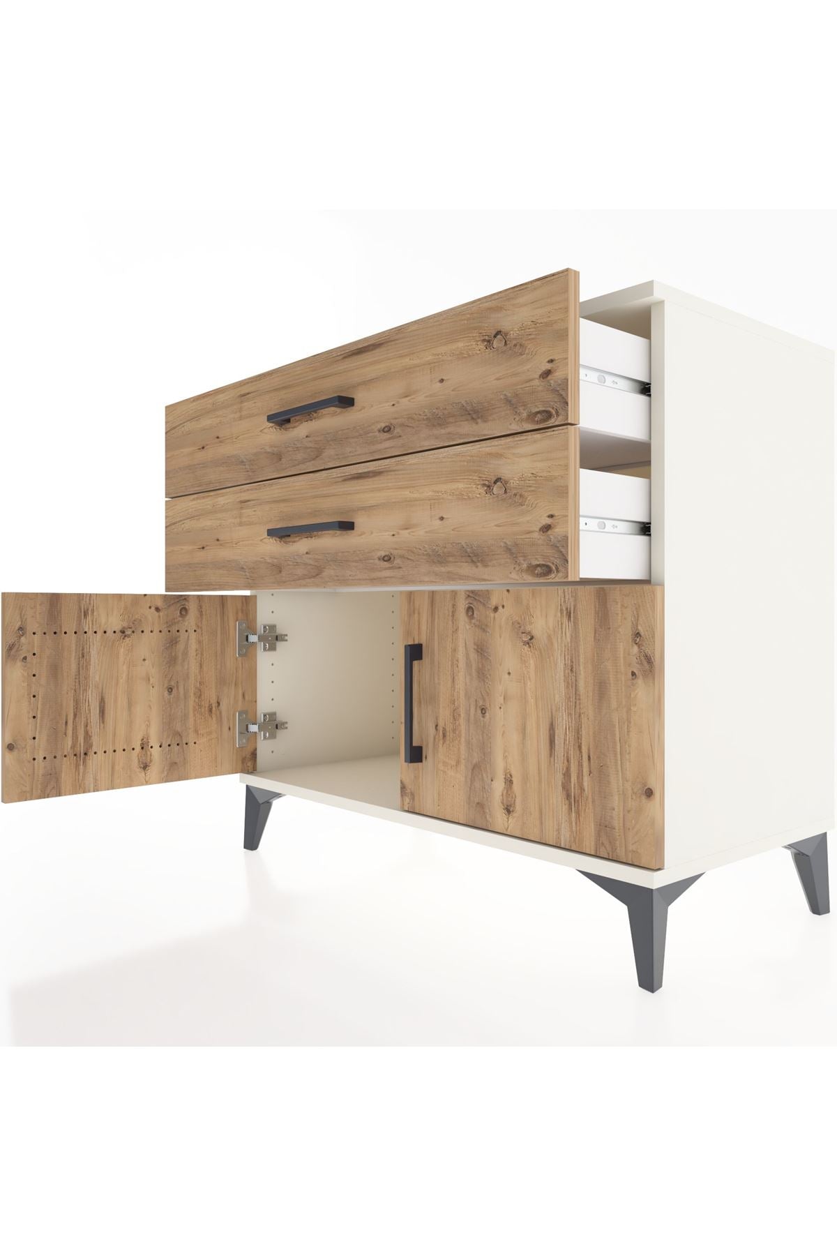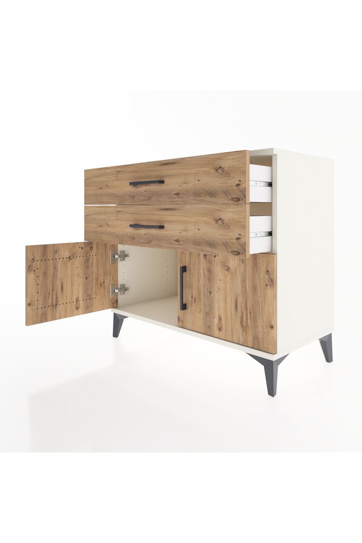 Geniş üst yüzey eşyalarınızı düzenlemek veya dekoratif objeler yerleştirmek için ideal bir alan sunar. Kapaklı bölme ve çekmeceler kıyafet, aksesuar ve küçük ev tekstili ürünlerini düzenli tutar. Ayarlanabilir raflar sayesinde farklı boyutlardaki kutu ve ürünlere uygun depolama sağlanır. Metal ayaklar zeminden yükselttiği için temizlik kolaylaşır; suntalam yüzey ise leke ve çiziklere karşı dayanıklıdır. Çekmece konfigürasyonu ihtiyaca göre değiştirilebildiğinden hem küçük hem büyük parçalar için pratik saklama çözümleri sunar.