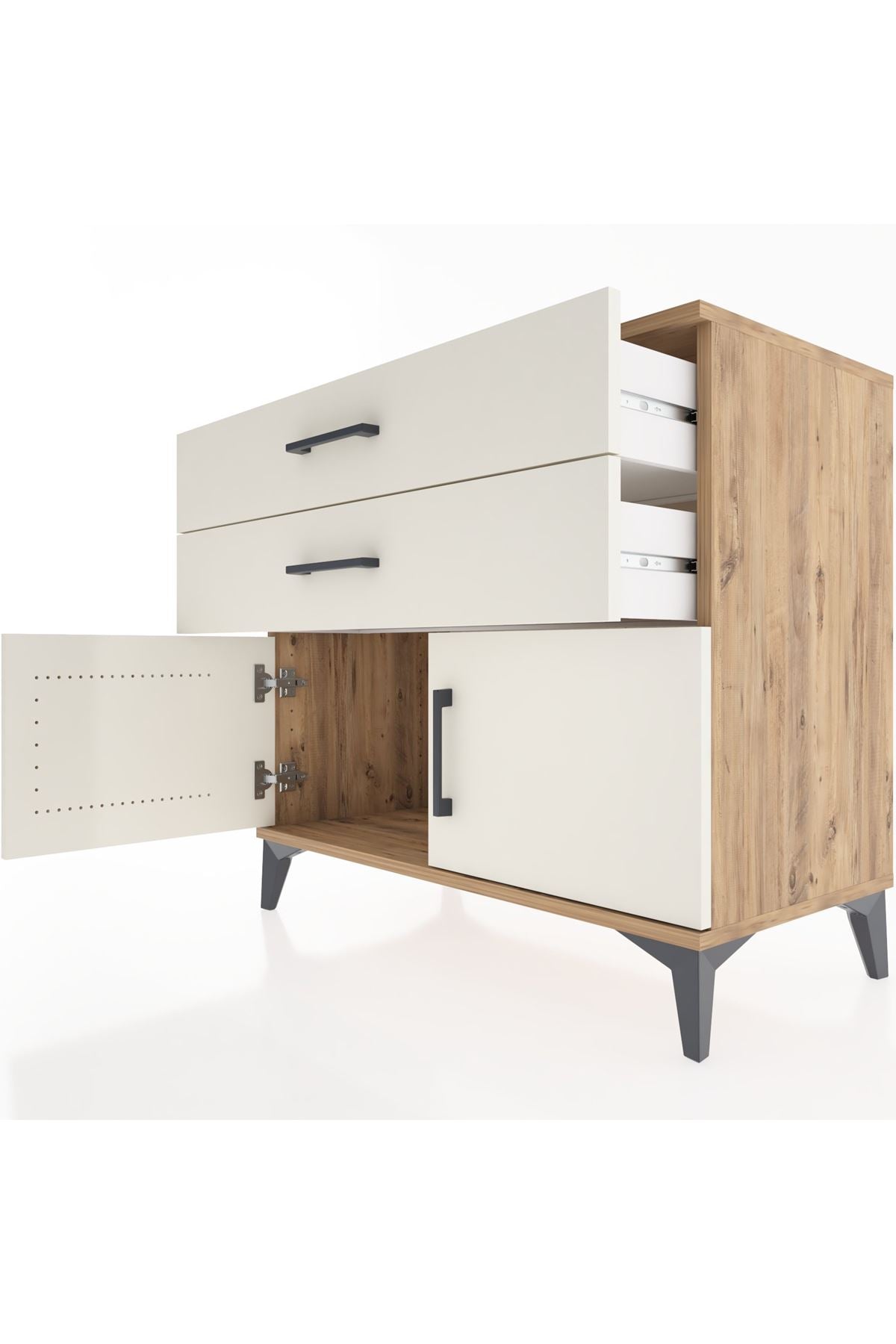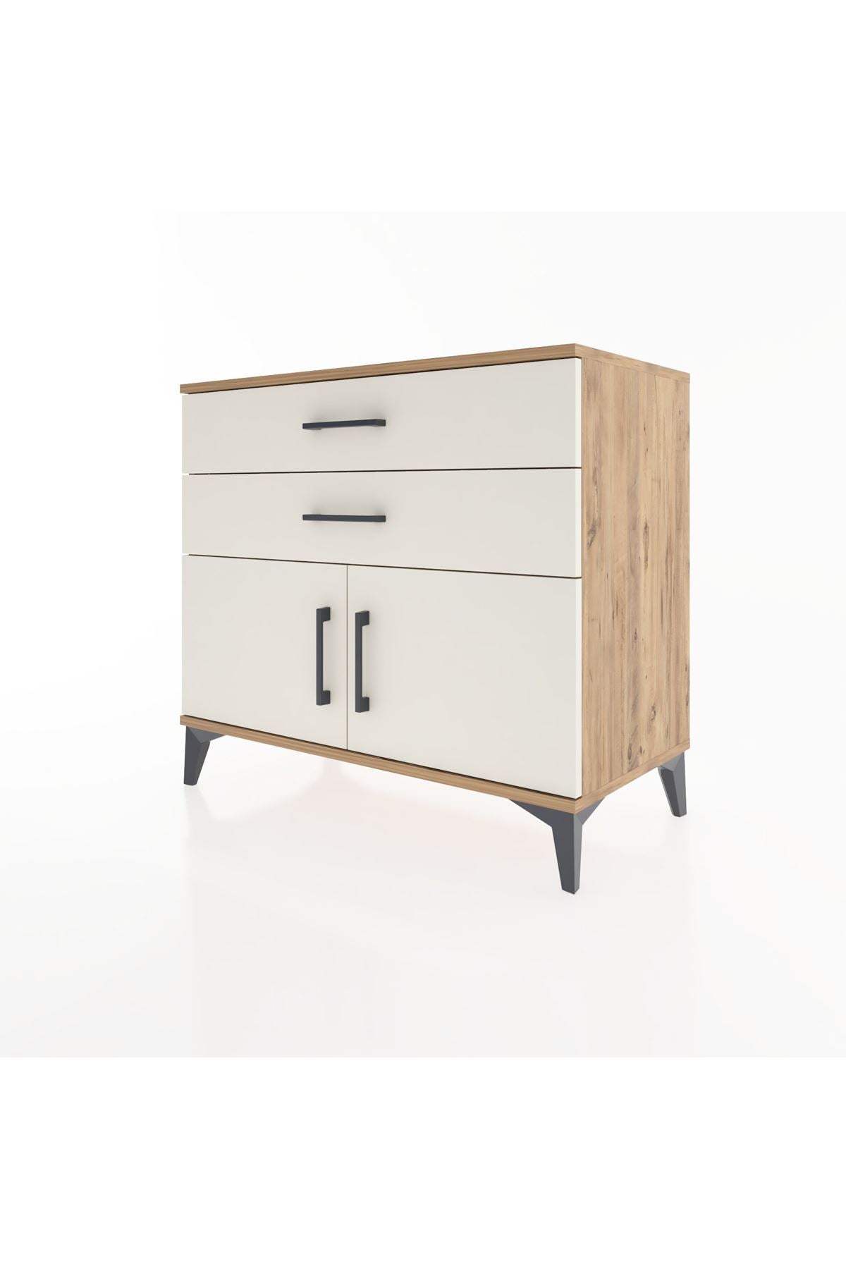 Komodin, antre ya da ofis köşesi olarak kullanımda eşyalarınızı düzenli tutar; üst yüzeyi dekoratif obje veya çalışma alanı olarak kullanılabilir. Ayarlanabilir raflar sayesinde farklı boyutlardaki kutu, ekipman ve tekstil ürünleri için ideal depolama sağlar. Metal ayaklar zeminden yükselti sayesinde temizlik kolaylığı sağlar; nem ve tozun mobilya yüzeyine doğrudan temasını azaltır. Çekmece ve kapak kombinasyonu ile hem gizli hem düzenli depolama sunar; çekmece sayısı ihtiyaca göre konfigüre edilebilir, böylece kullanım amacına göre yeniden düzenleme yapılabilir.