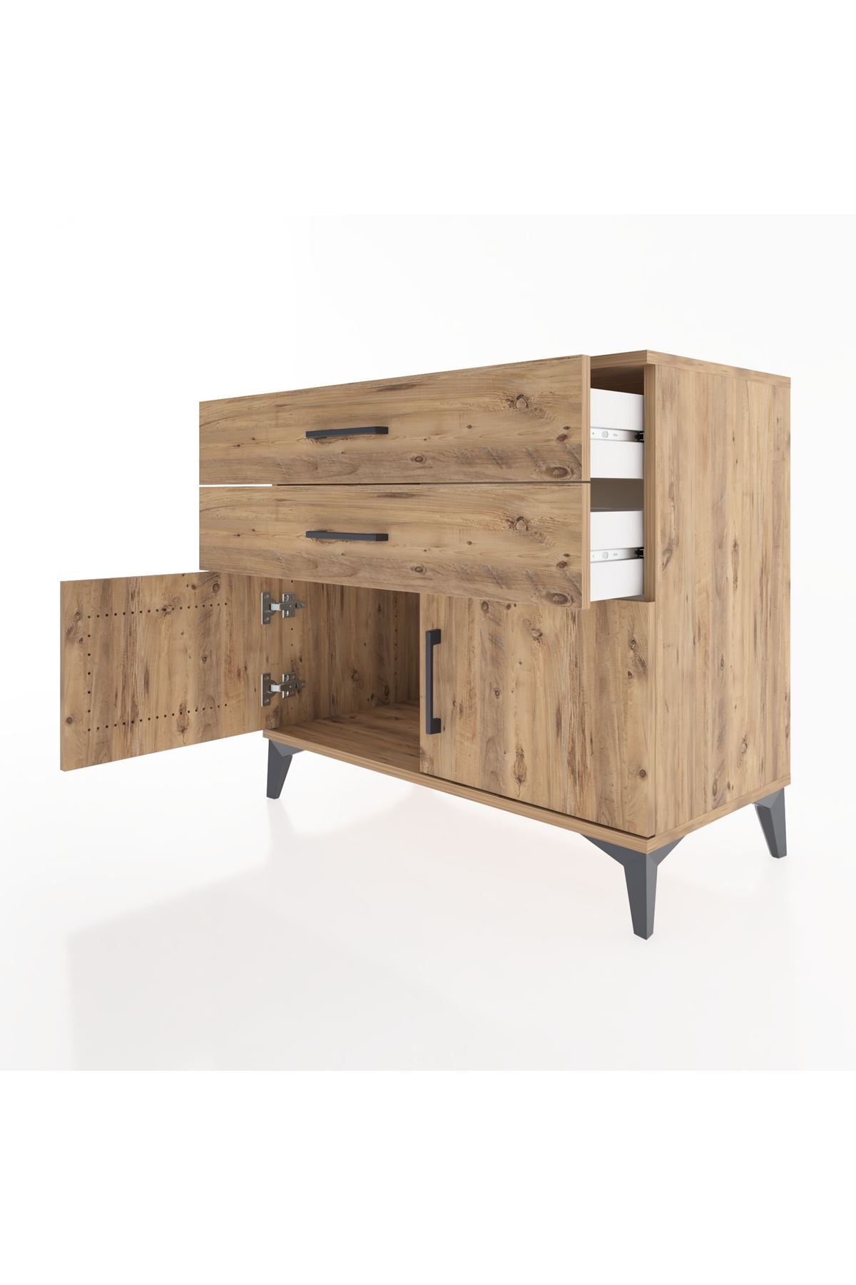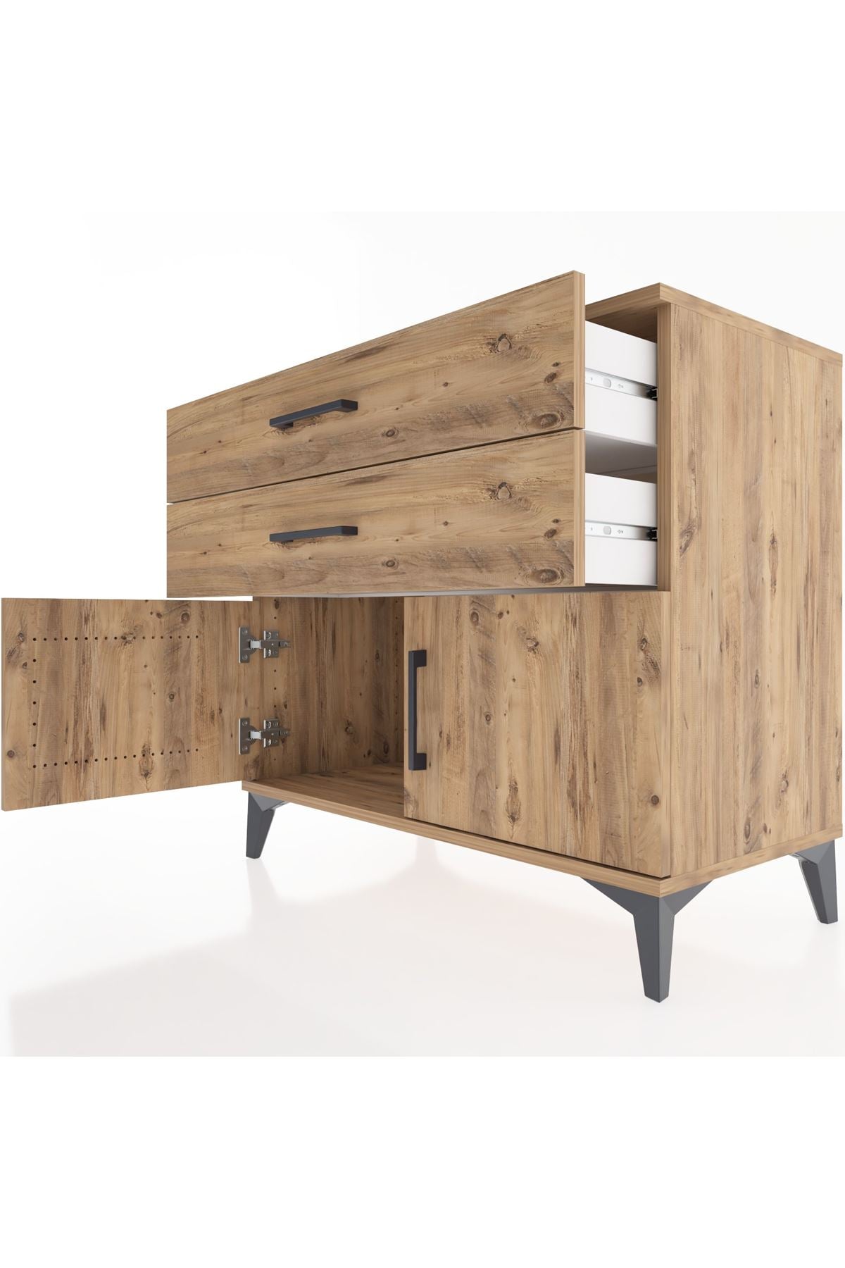 Kompakt ölçüleri ile koridor, yatak odası veya ofislerde yerden tasarruf sağlar. Çekmeceler, kapak altı bölmeler ve ayarlanabilir raflar sık kullanılan eşyaları ayrı tutmaya yardımcı olur, düzeni kolaylaştırır. Dayanıklı suntalam yüzey lekelenmelere ve çizilmelere karşı direnç gösterir; metal donanımlar günlük kullanımdaki hareketlere karşı güven verir. Üst yüzeyi dekoratif öğeler veya günlük eşyalar için ek kullanım alanı sunar.