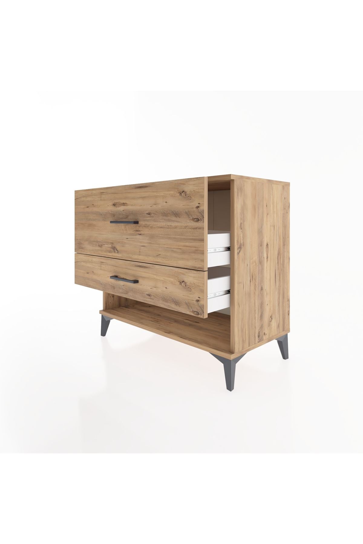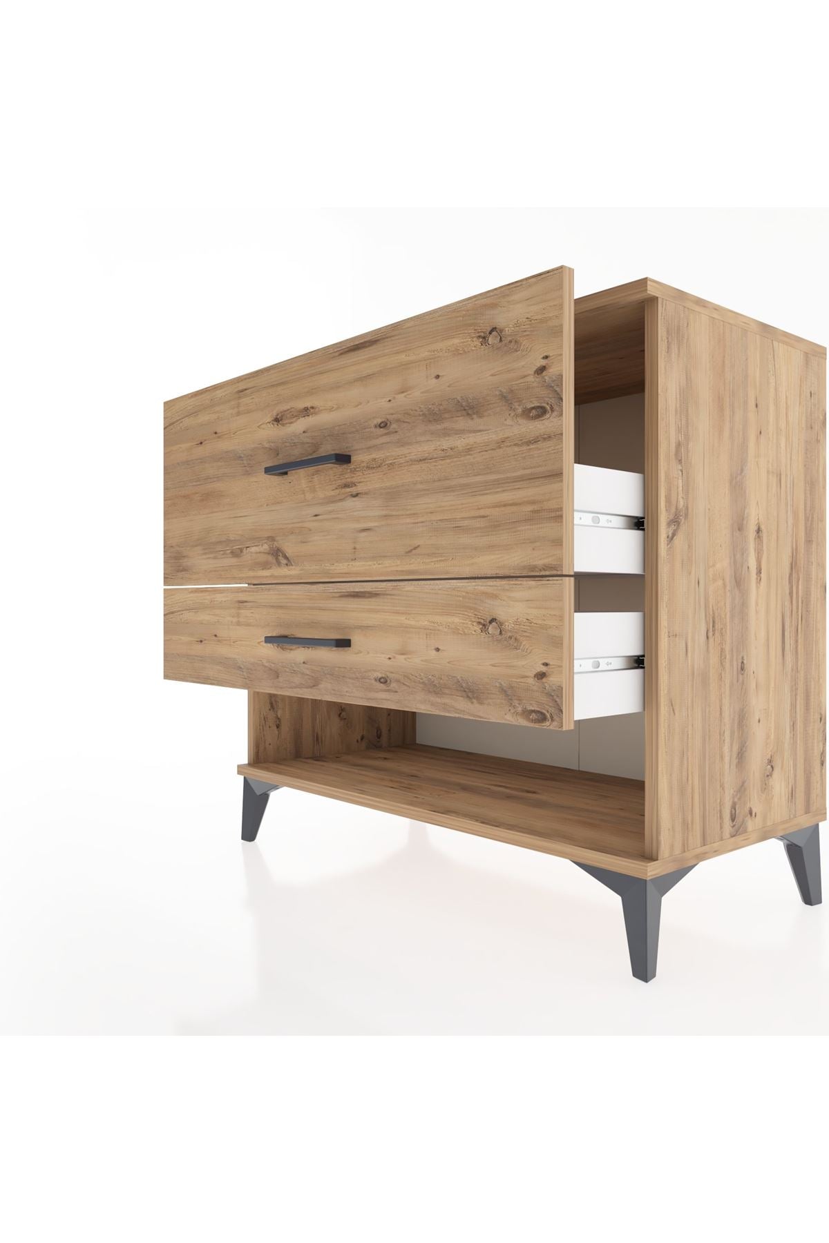Komodin yüksekliğindeki ölçüleri ile yatak başı veya giriş holünde kullanıma uygundur. İki çekmece ve açık raf kombinasyonu küçük eşyaları, kitapları veya sık kullanılan tekstil ürünlerini düzenli tutar. Dayanıklı suntalam yüzeyler nem ve çizilmelere karşı direnç gösterir; metal donanımlar stabilite sağlar. Kolay temizlenebilir yüzey, hızlı bakım imkanı verir. Çekmece sayısını artırma veya azaltma seçeneğiyle kullanım esnekliği sunar.