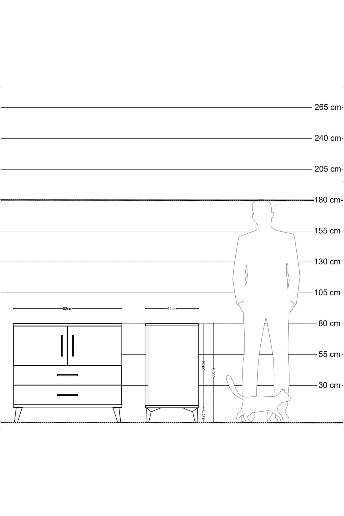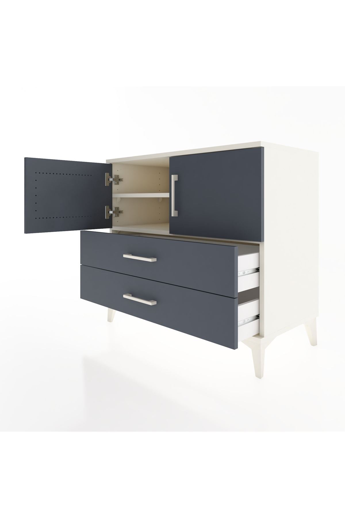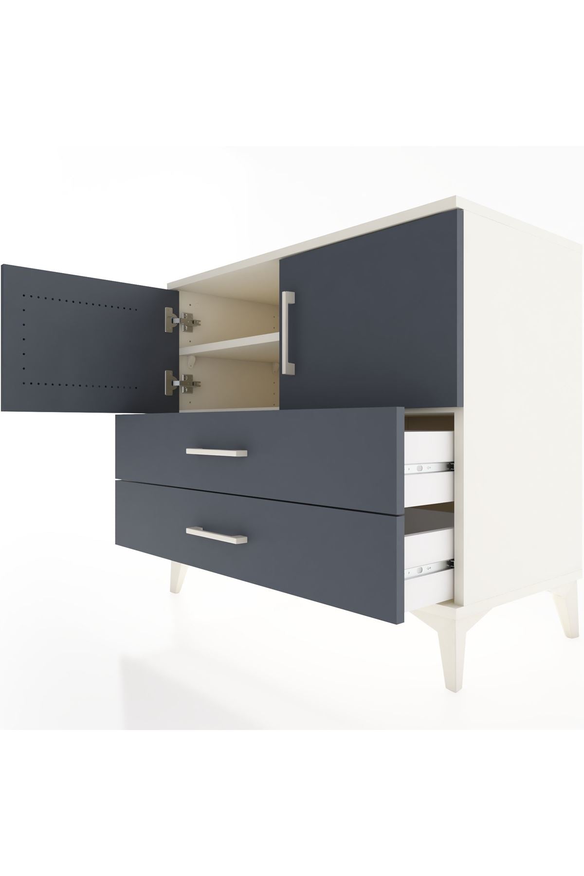 Geniş iç hacmi ve iki ayarlanabilir rafı sayesinde farklı ebatlarda eşyalar için esnek depolama imkânı sunar. İki kapaklı bölüm; kutu, çanta veya katlanmış kıyafetleri düzenlemek için idealdir. İki çekmece, sık kullanılan eşyaları kolay erişimde tutar; çekmece sayısı konfigüre edilebilir olmasıyla ihtiyaca göre düzenleme yapılabilir. Metal ayaklar zemine zarar vermeden taşıma sağlar, suntalam yüzey kolay temizlenir ve uzun süre ilk günkü görünümünü korur.