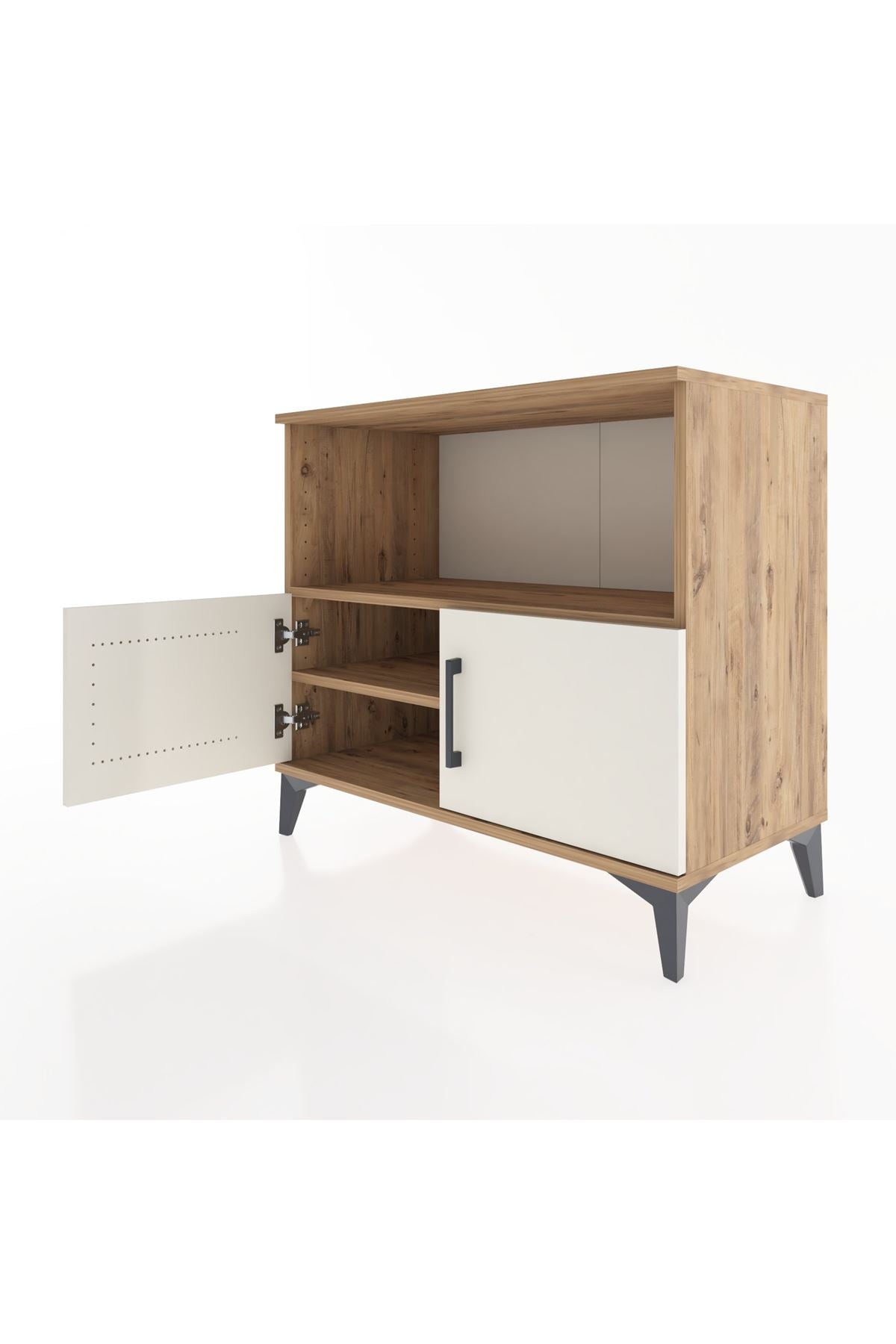 Şifonyer şeklinde kullanıldığında yatak odasına düzen ve zarafet katar. Nevresim takımları, ekstra yastık ve battaniyeler için pratik depolama alanı oluşturur. Metal kulplar ve ayaklar mekâna modern bir dokunuş getirirken, çekmece sayısı konfigüre edilebilir olması kişisel depolama ihtiyaçlarına cevap verir.