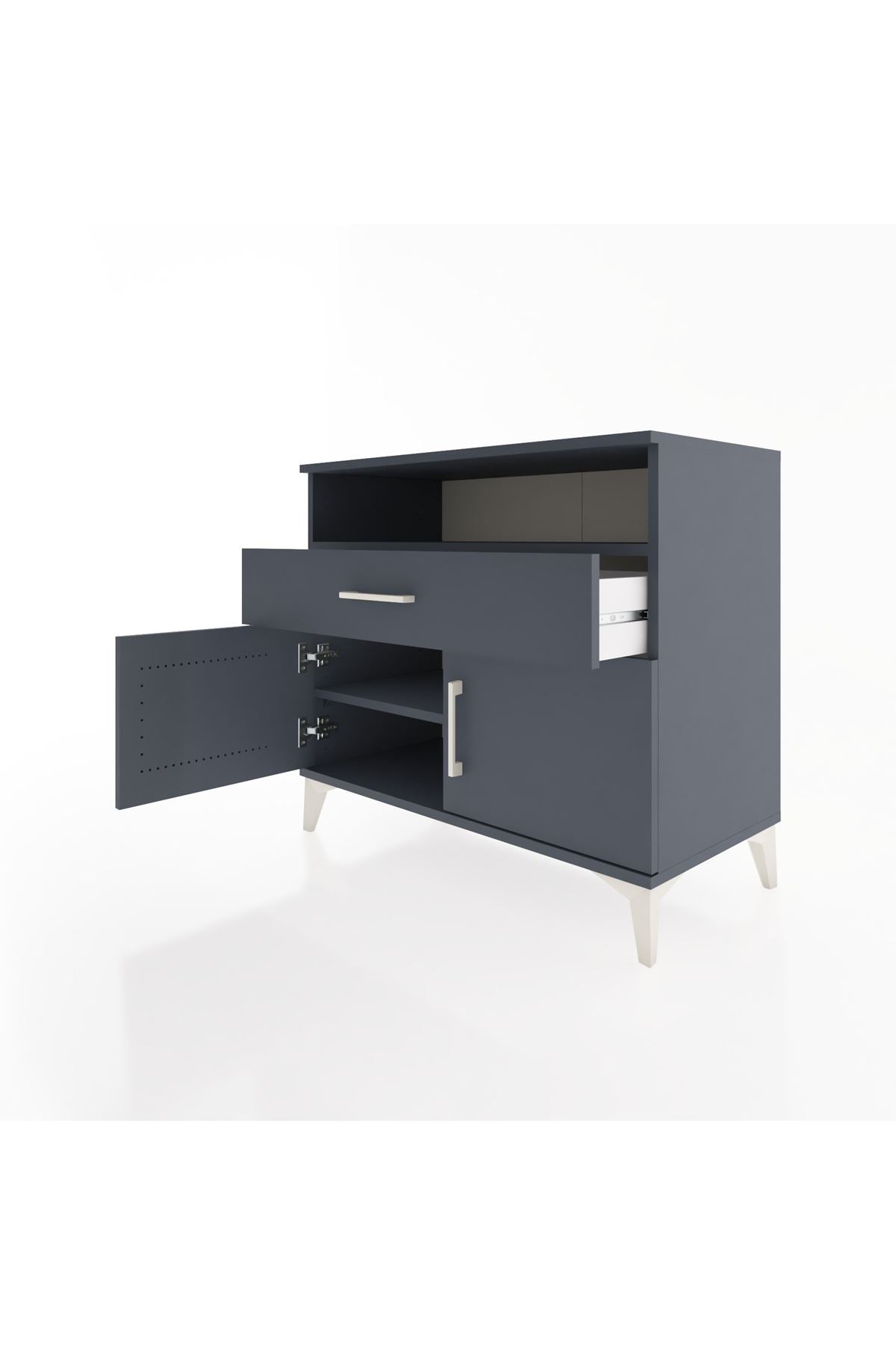Bu sifonyer, evinizde düzen ve estetik bir depolama çözümü sağlar. Antrasit rengi mat ve modern bir görünüm sunar; net hatlara sahip yüzeyleri mekana sofistike bir dokunuş ekler. Metal ayakları sağlamlık ve denge verirken metal kulplar çekmece ve kapak kullanımında uzun ömürlü performans sunar. Üst bölümde yer alan geniş açık raf, sık kullanılan eşyalarınızı hızlıca yerleştirmenize olanak tanır; iki ayarlanabilir raf ise farklı yüksekliklerde depolama düzeni sağlar. Tek çekmeceli yapı, küçük eşyalarınızı düzenlemek için ideal bölme sunar. Kapaklı alt bölüm günlük kullanım eşyalarını tozdan korur ve görsel dağınıklığı engeller. Çekmece sayısı konfigüre edilebilir; kullanım ihtiyacınıza göre ek çekmece seçeneğiyle sipariş verebilirsiniz.