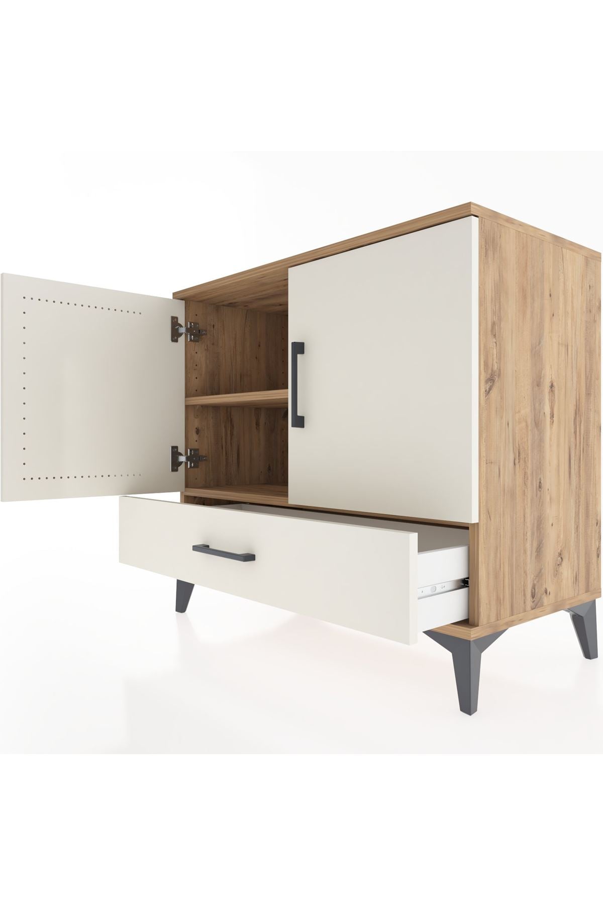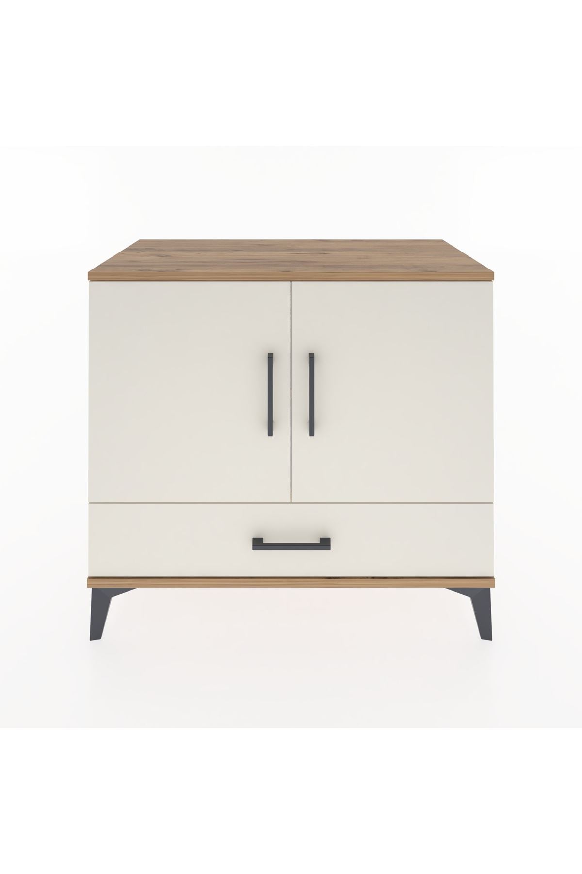 Bu sifonyer, evinizde düzenli depolama çözümleri ve zamansız bir estetik sunar. Ayarlanabilir raflarıyla farklı boyutlardaki eşyaları düzenlemeye uygundur; tek çekmecesi günlük gereçler için kolay erişim sağlar, iki kapaklı bölmesi ise daha büyük eşyalar veya katlanmış tekstiller için ideal hacim sağlar. Metal ayaklar yüksek stabilite ve yerden temizlik kolaylığı sağlarken, metal kulplar sık kullanıma dayanıklı uzun ömürlü bir tutuş sunar.