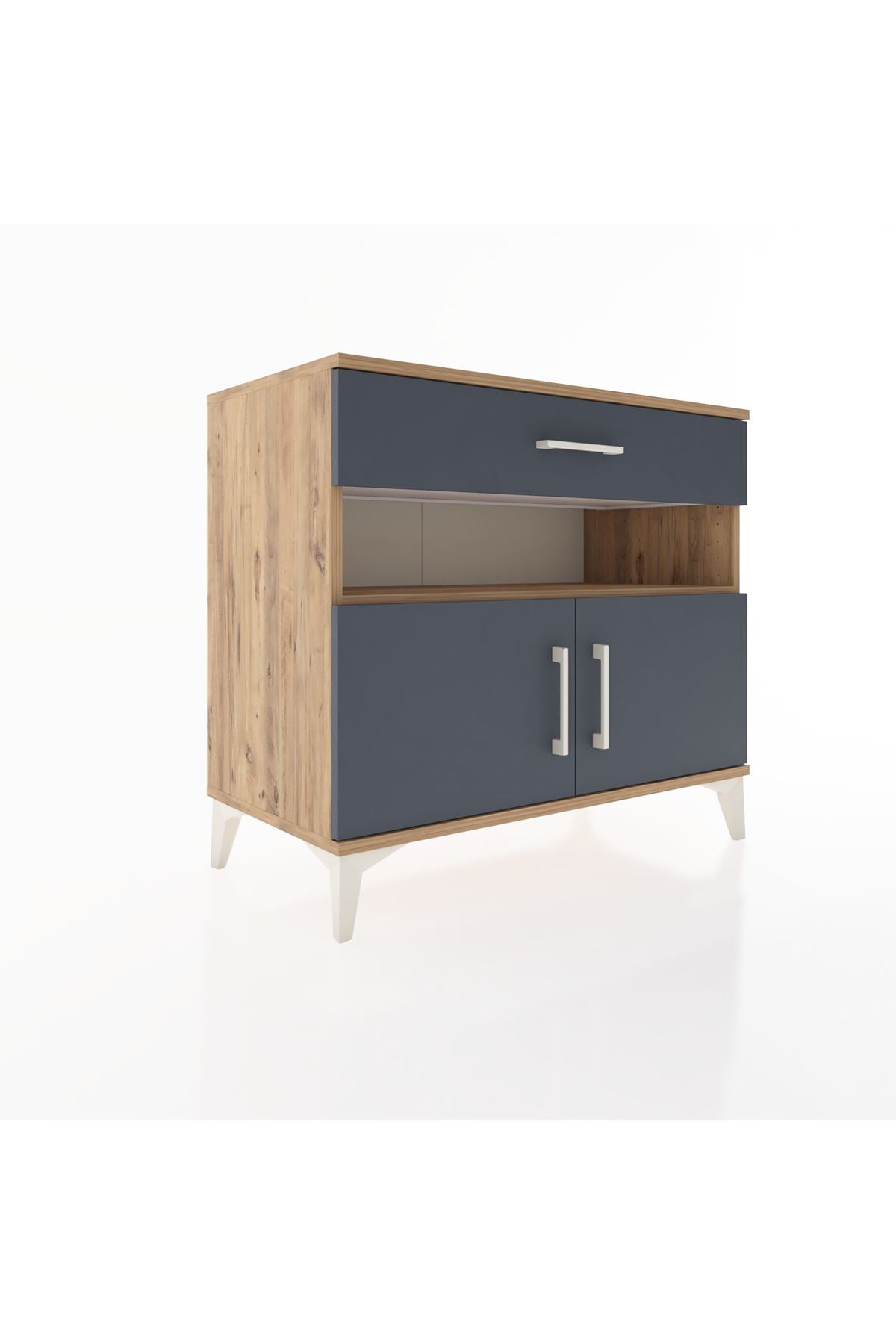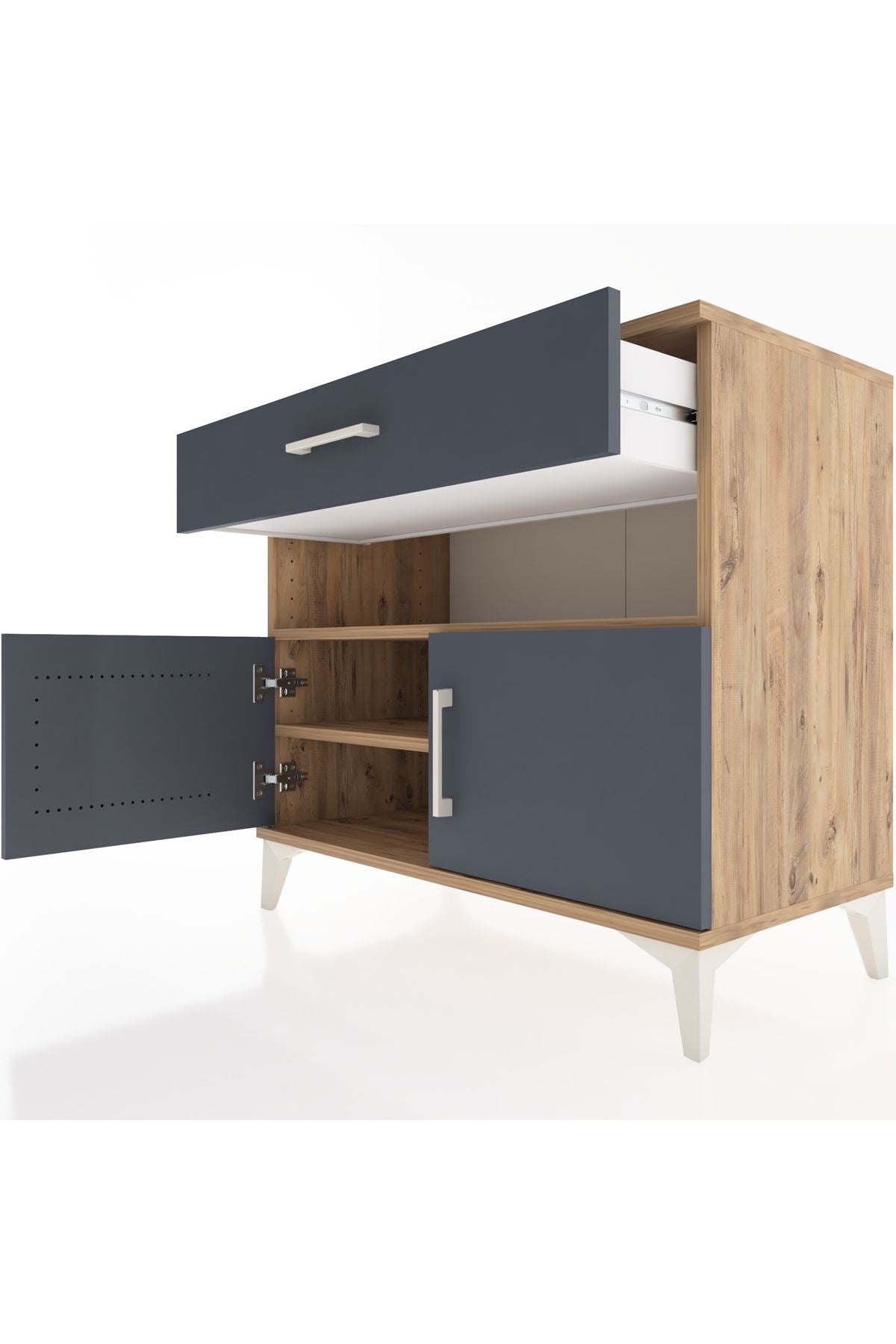 Bu sifonyer, yaşam alanlarında düzen ve estetiği bir arada sunar. Çam üst yüzeyi doğal ahşap dokusu sağlar, antrasit kapaklar modern ve sade bir görünüm verir; aytaşı seçeneği daha aydınlık bir atmosfer oluşturur. Metal ayakları sağlam ve dayanıklı, metal kulplar uzun ömürlü kullanım sunar. İç kısımdaki raflar ayarlanabilir, ihtiyaçlara göre yükseklik değişimi yapılabilir; çekmece sayısı konfigüre edilebilir, kullanım amacına göre farklı düzenlemeler mümkündür.