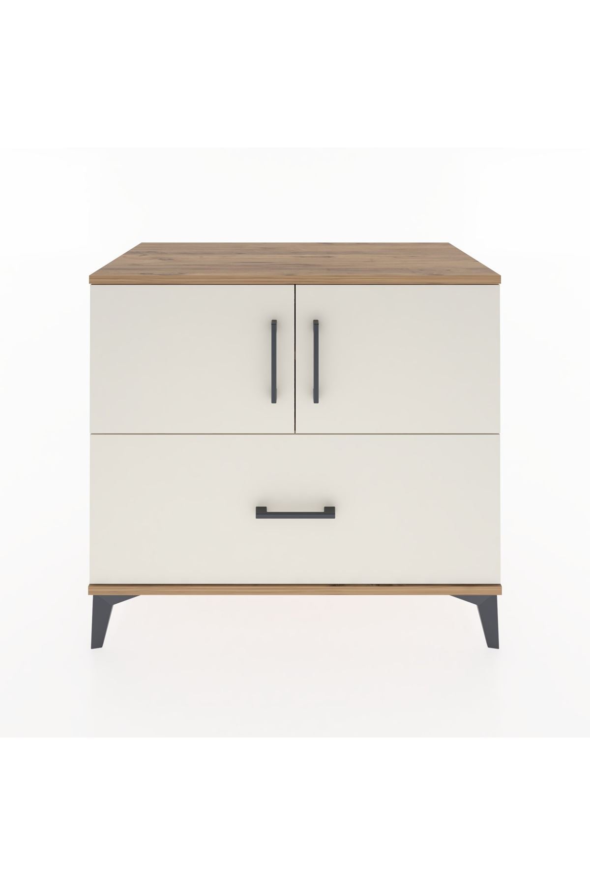 Kompakt ölçüleriyle küçük ofis veya oda düzenlerinde yerden tasarruf sağlar. İki kapaklı bölme ve tek geniş çekmece, dosya, kıyafet veya kişisel eşyaların ayrıştırılmasını kolaylaştırır. Üst yüzeyi sehpa veya ek çalışma alanı olarak kullanılabilir. Metal ayaklar zeminden yükselterek temizlik kolaylığı sağlar ve nemli zeminlere karşı koruma sunar. Kullanıcı taleplerine göre çekmece konfigürasyonu ile farklı depolama ihtiyaçlarına hızlı uyum sağlar.