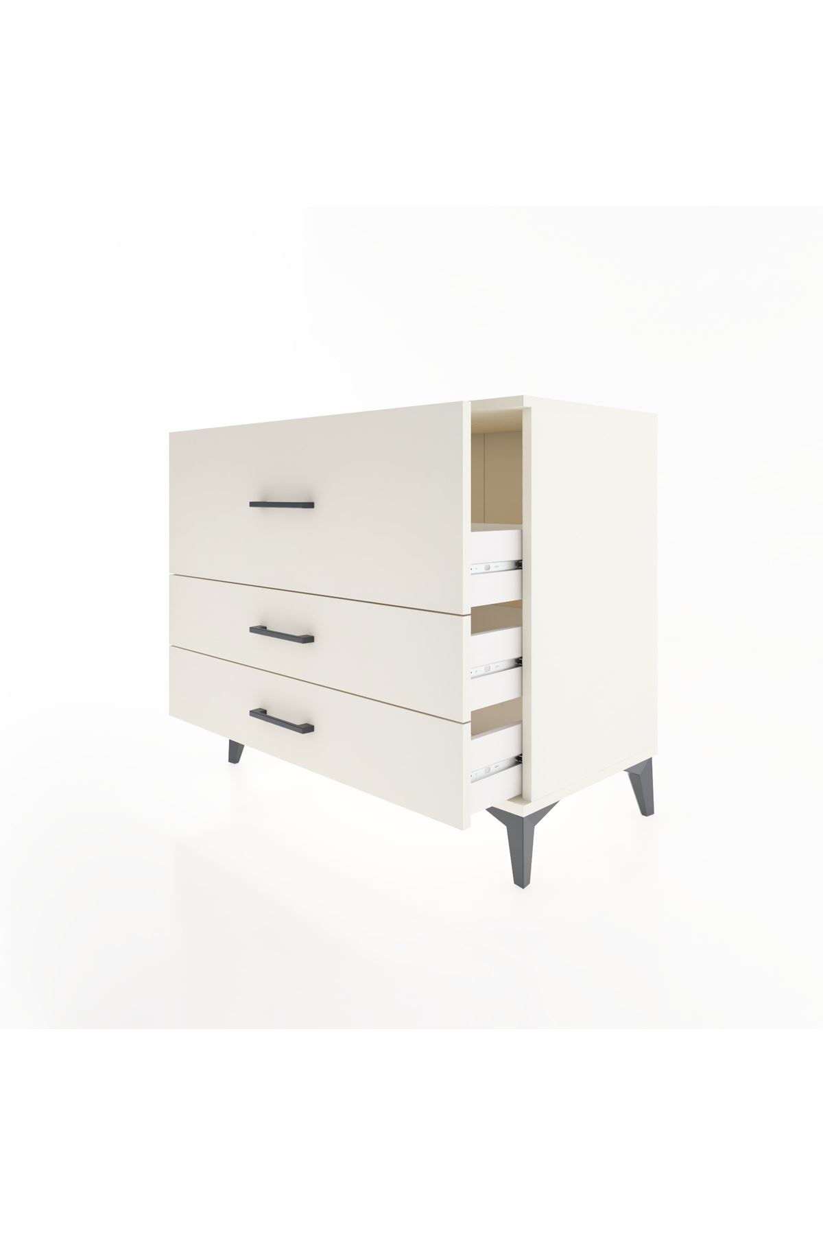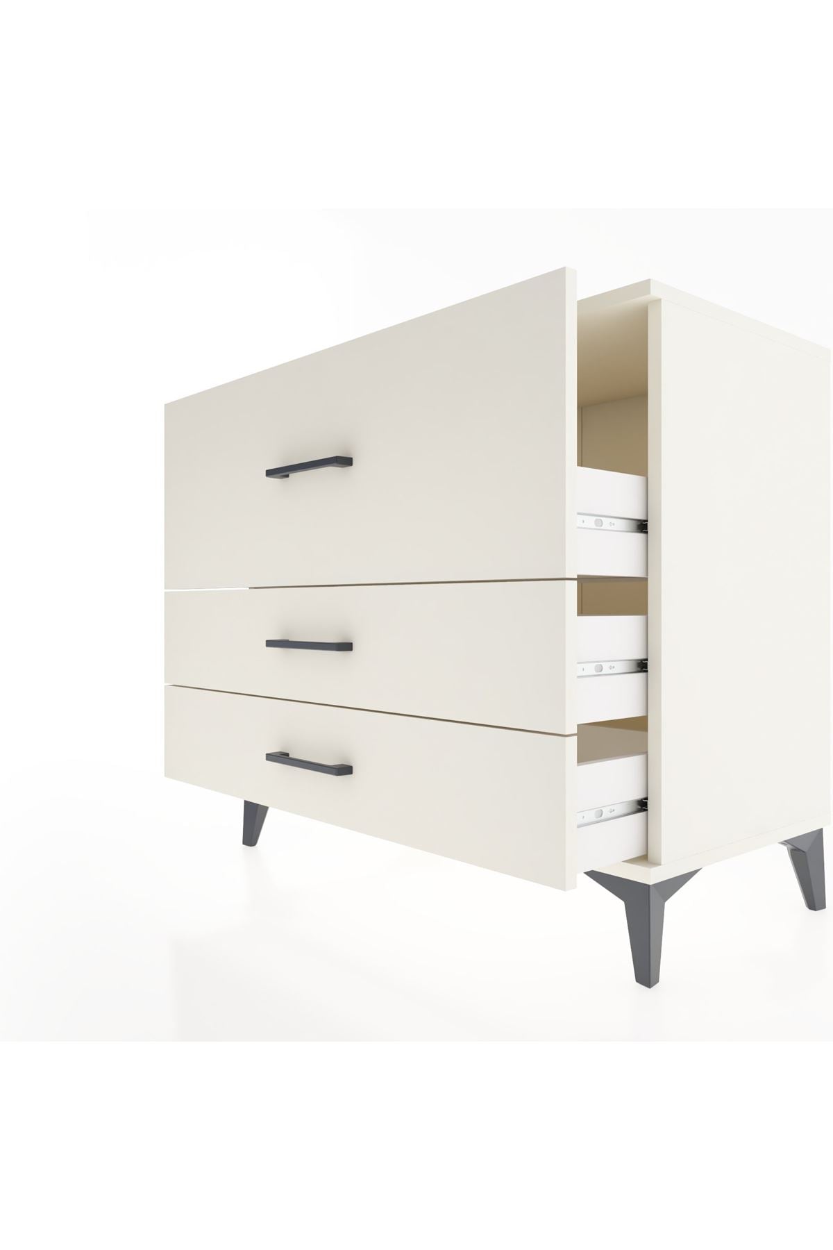 Geniş üst yüzey kitap, lamba veya dekoratif objeler için ideal alan oluşturur. Üç çekmece sayesinde kıyafet, evrak ve aksesuarlar düzenli saklanır; istenildiğinde çekmece düzeni ihtiyaca göre değiştirilir. 1. sınıf suntalam yüzeyler temizliği kolaylaştırır, çizilmelere karşı ekstra koruma sağlar. Metal ayaklar zeminden yükselttiği için nemli zeminlerde kullanımda uzun süre formunu korur. Ofis, ev veya çalışma alanlarında düzen sağlarken minimalist çizgisiyle mekânlara uyum sağlar.