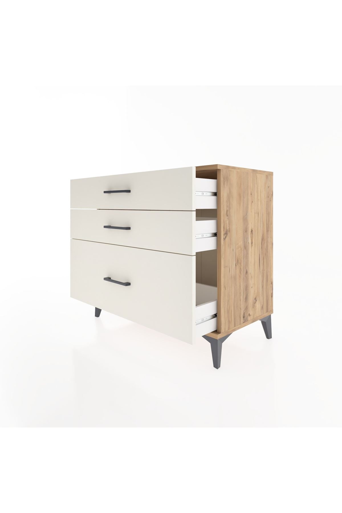 Kompakt ölçüleriyle dar alanlarda bile kullanım kolaylığı sağlar; yatak odasında giysi ve ev tekstili depolamak, koridor veya antrede günlük kullanım eşyalarını organize etmek için uygundur. Çekmeceler akıcı kayma mekanizmasıyla kolay erişim sunar, taşınması ve iç düzenlemesi pratik hale gelir. Ayarlanabilir raflar sayesinde depolama hacmi kişisel ihtiyaçlara göre şekillendirilebilir; üst yüzey televizyon sehpası, servis alanı veya dekoratif sergileme alanı olarak kullanılabilir. Suntalam yüzeyi kolay temizlenir ve leke tutmaz, metal donanımlar darbelere karşı dayanıklıdır.