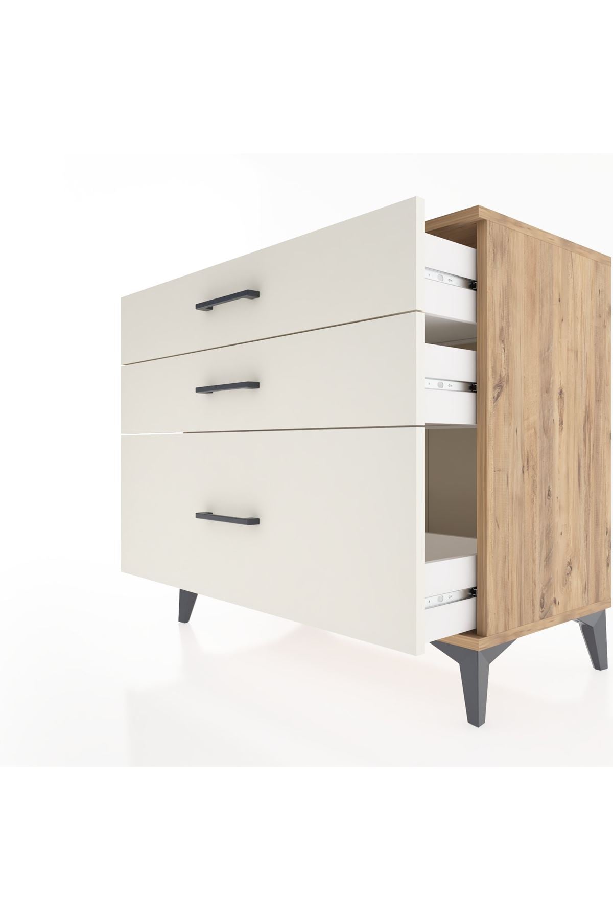 Bu sifonyer, evinizde düzen ve estetik sağlar. Aytaşı seçeneği modern beyaz tonuyla açık çam üst yüzeyin doğal sıcaklığını bir araya getirir; antrasit seçeneği koyu metal detaylarla güçlü ve sofistike bir ifade sunar; Atlas Çam seçeneği ise gerçek ahşap dokusunu andıran yüzeyiyle sıcak bir atmosfer yaratır. Metal ayakları sağlam ve dayanıklı, metal kulplar uzun ömürlü kullanım sunar. Üst yüzey dekoratif obje veya gece lambası için ideal genişlikte, çekmeceler ise farklı ihtiyaçlara göre düzenlenebilir ve konfigüre edilebilir.
